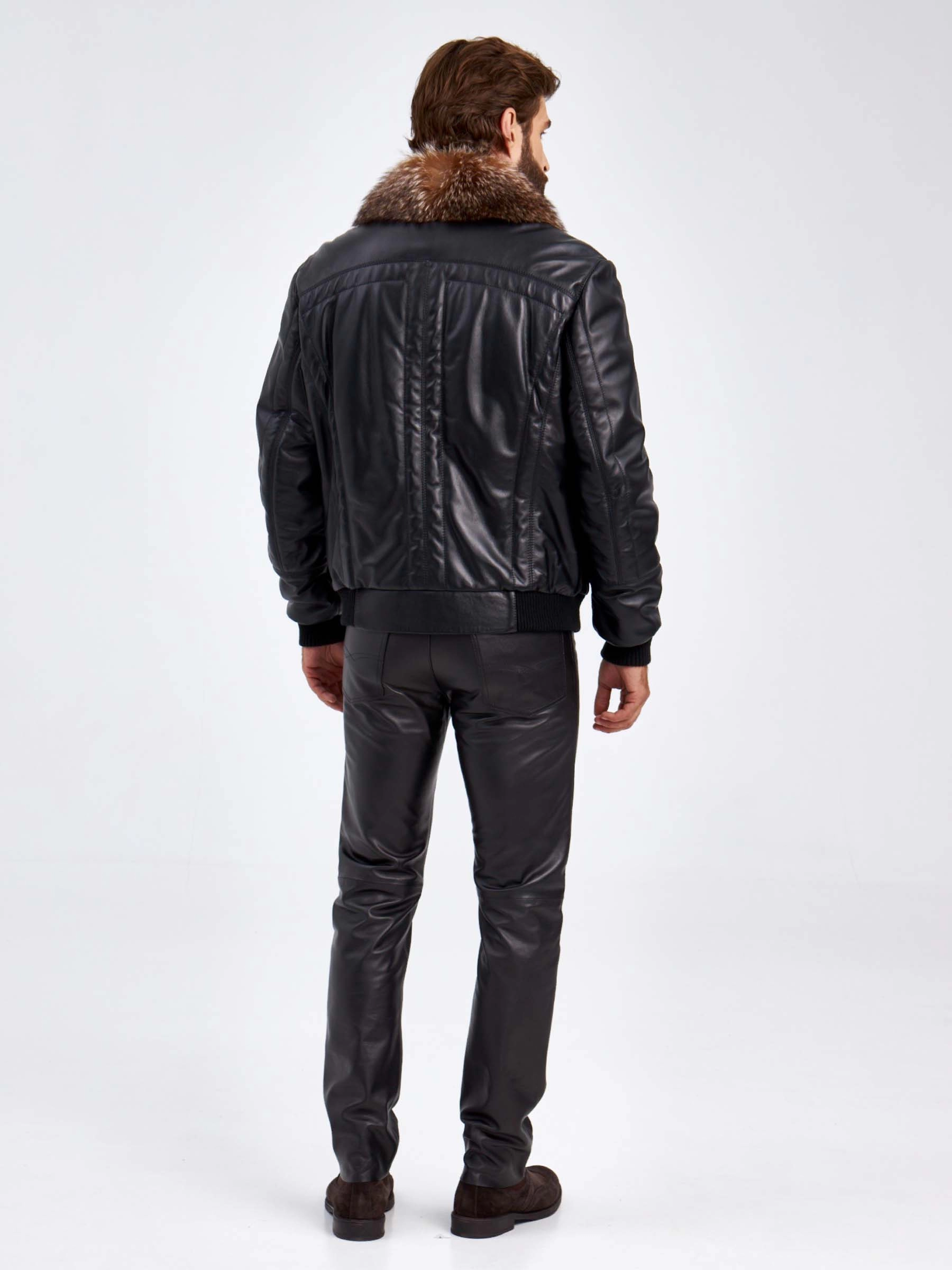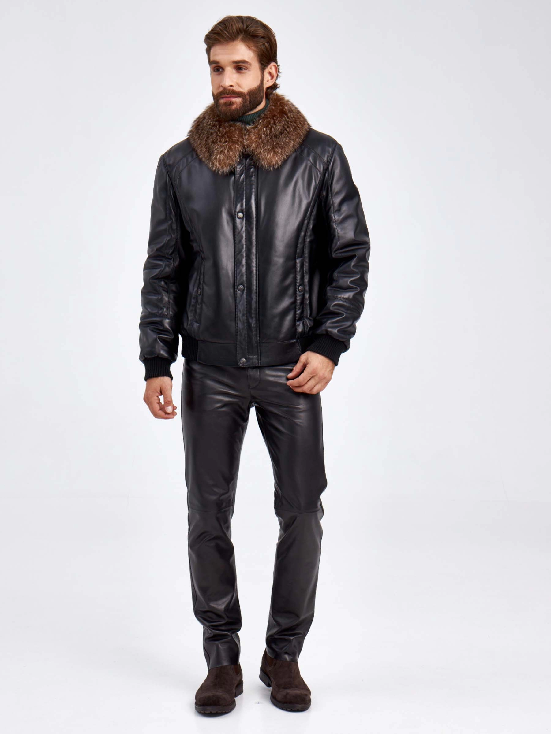 Кожаный утепленный мужской пуховик с воротником из меха енота 532, черный, размер 52, артикул 29210