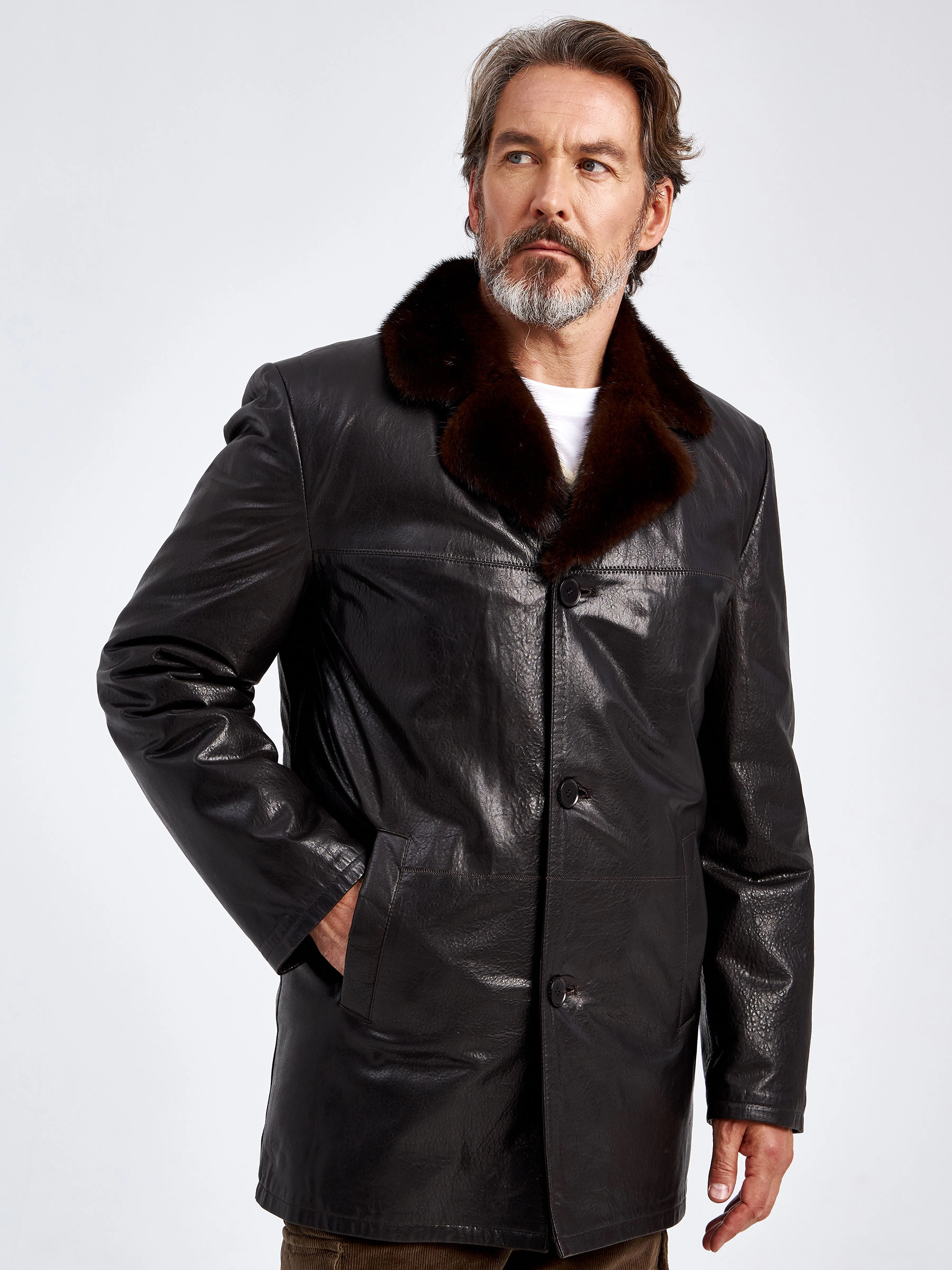 Товар зимняя мужская кожаная куртка на подкладке из овчины с воротником меха норки премиум класса 5450, коричневая, размер 46, артикул 40640 выполнен из натуральной кожи с застежкой пуговицы. Рассчитан на сезон: осень-зима. Длина изделия 90 см, силуэт прямой.