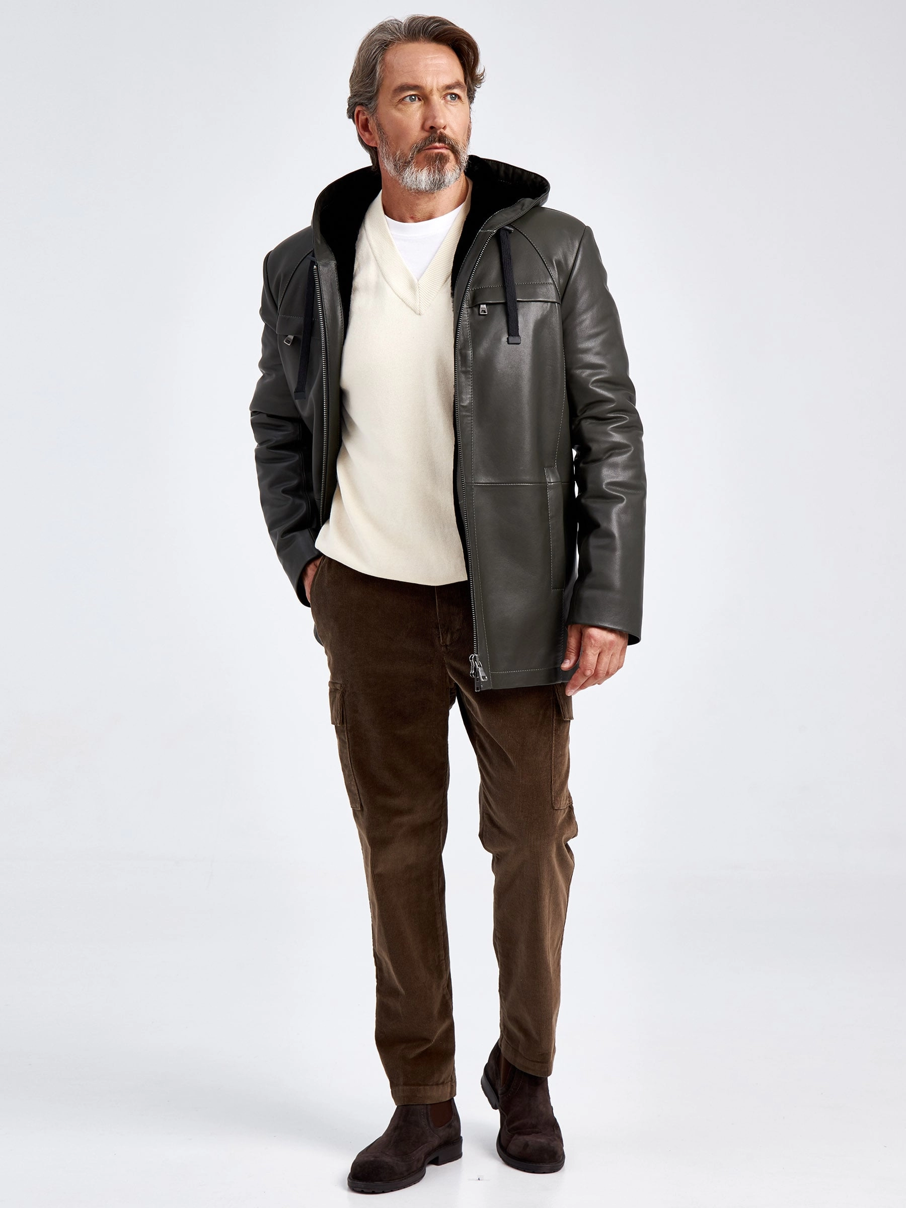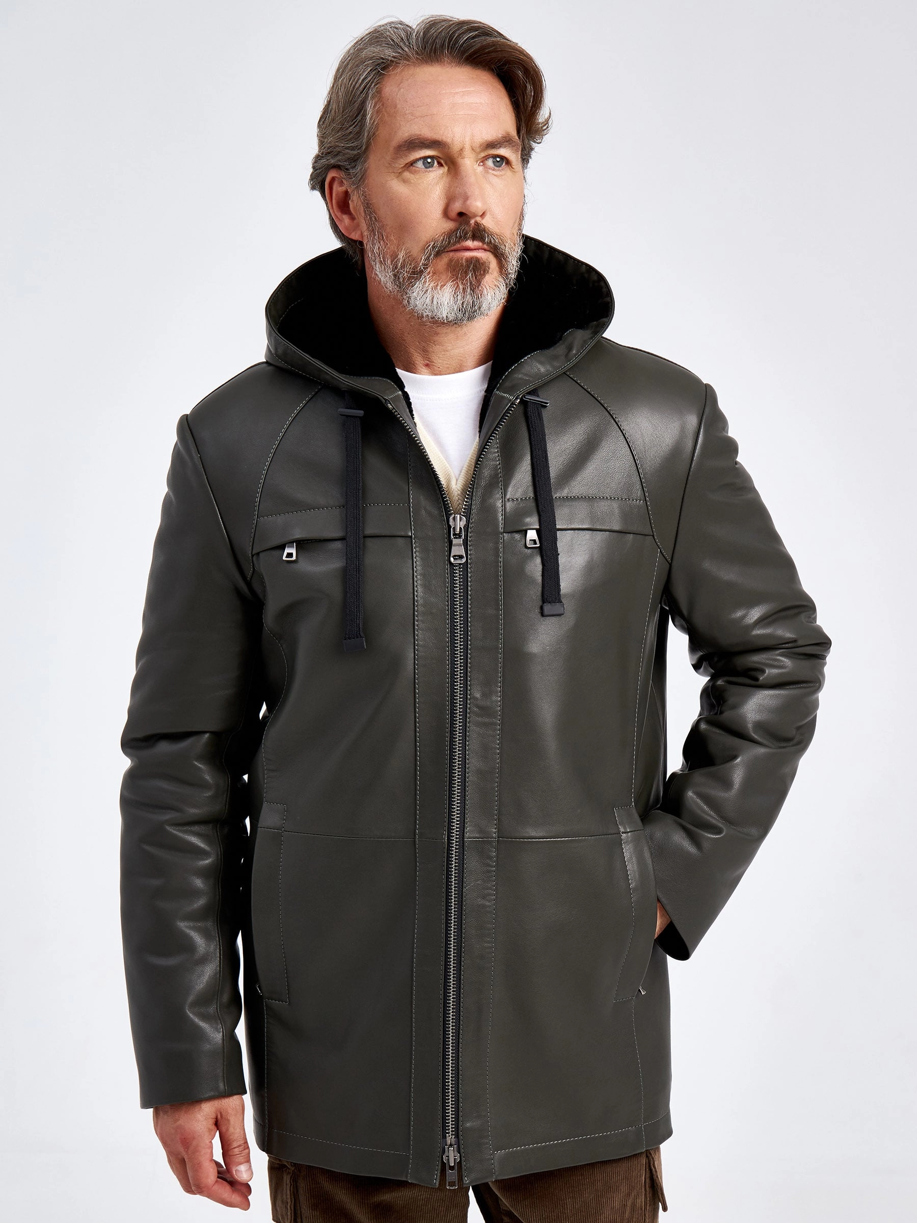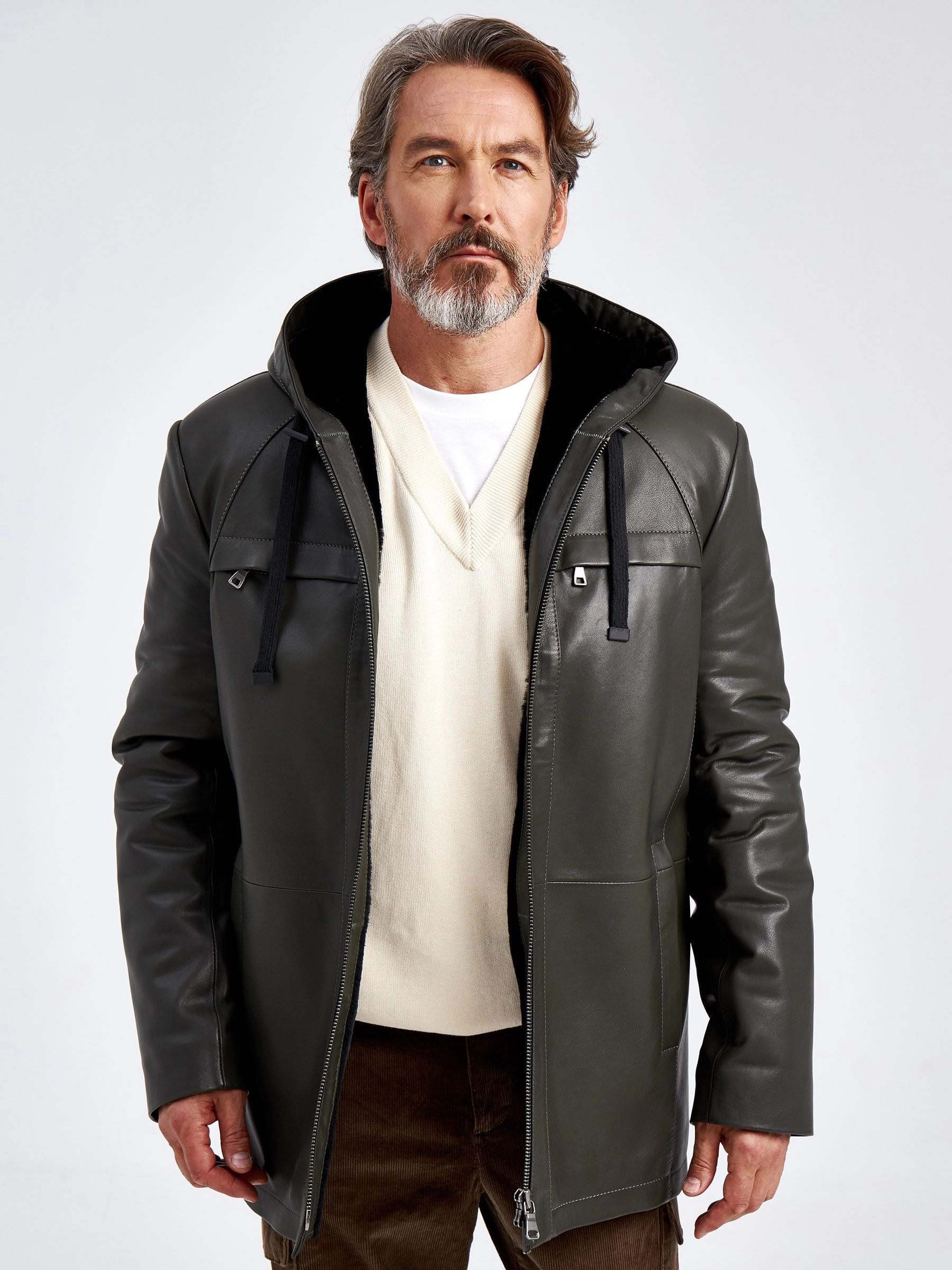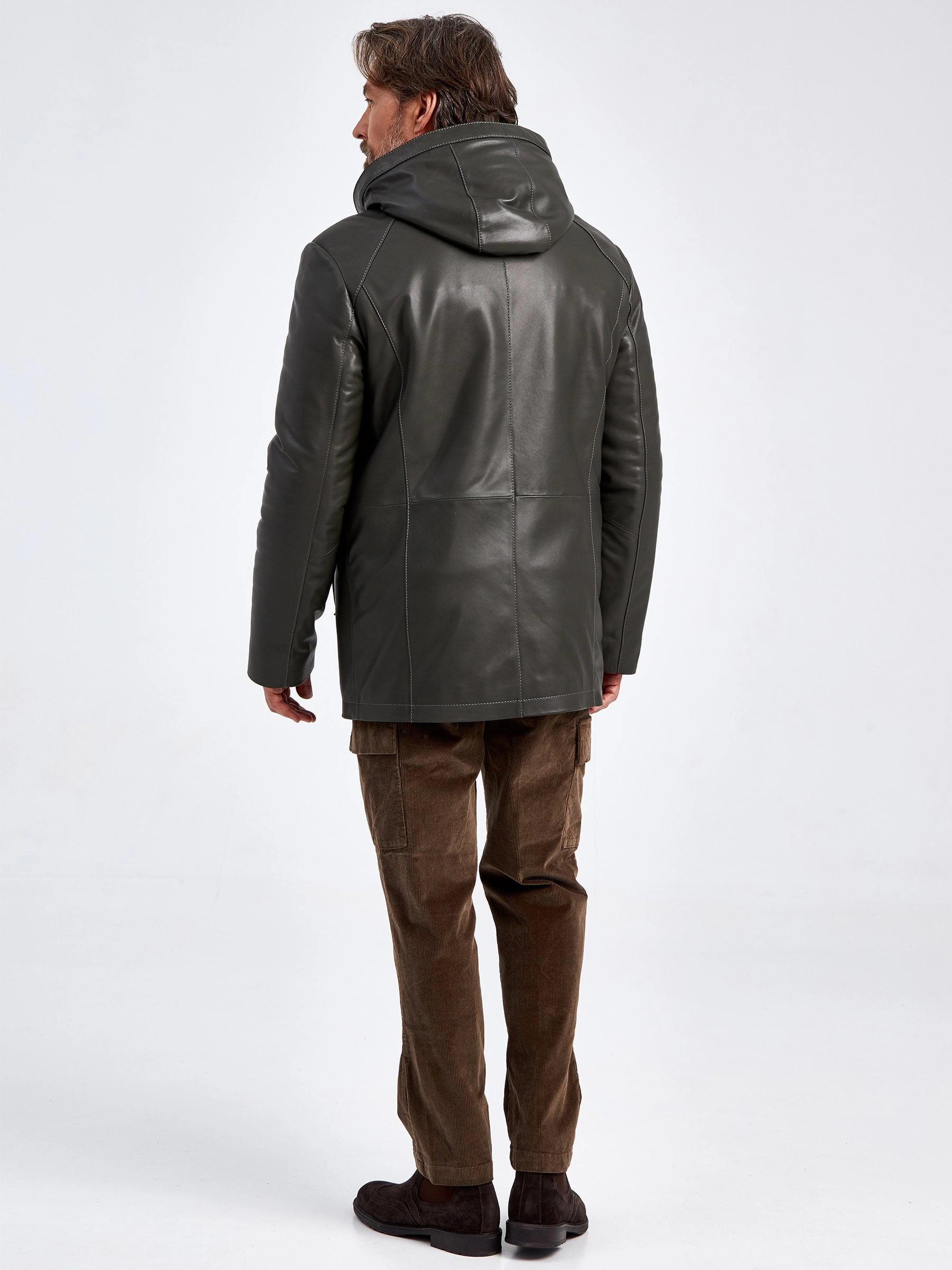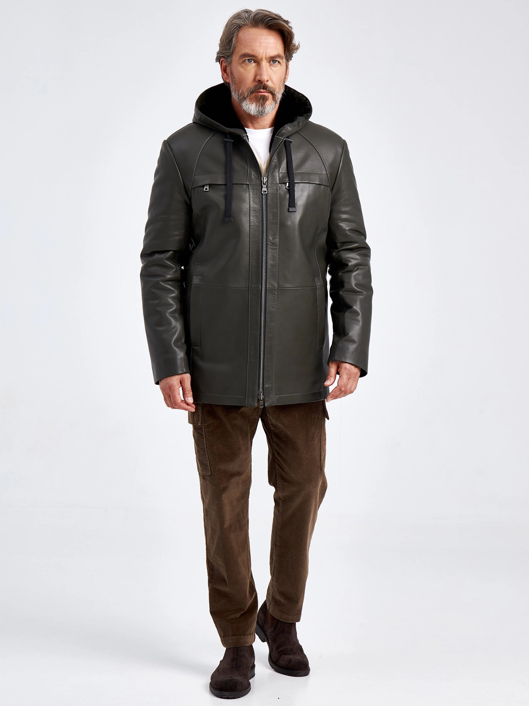Удлиненная кожаная куртка с капюшоном. Мастера Primo Vello использовали натуральную мягкую кожу и плотную овчину с густым ворсом, которая хорошо сохраняет тепло. Прямой силуэт. Нагрудные карманы на молниях прикрыты клапанами. Высочайший уровень качества подчёркивают безупречная работа портных и комфортная посадка по фигуре.