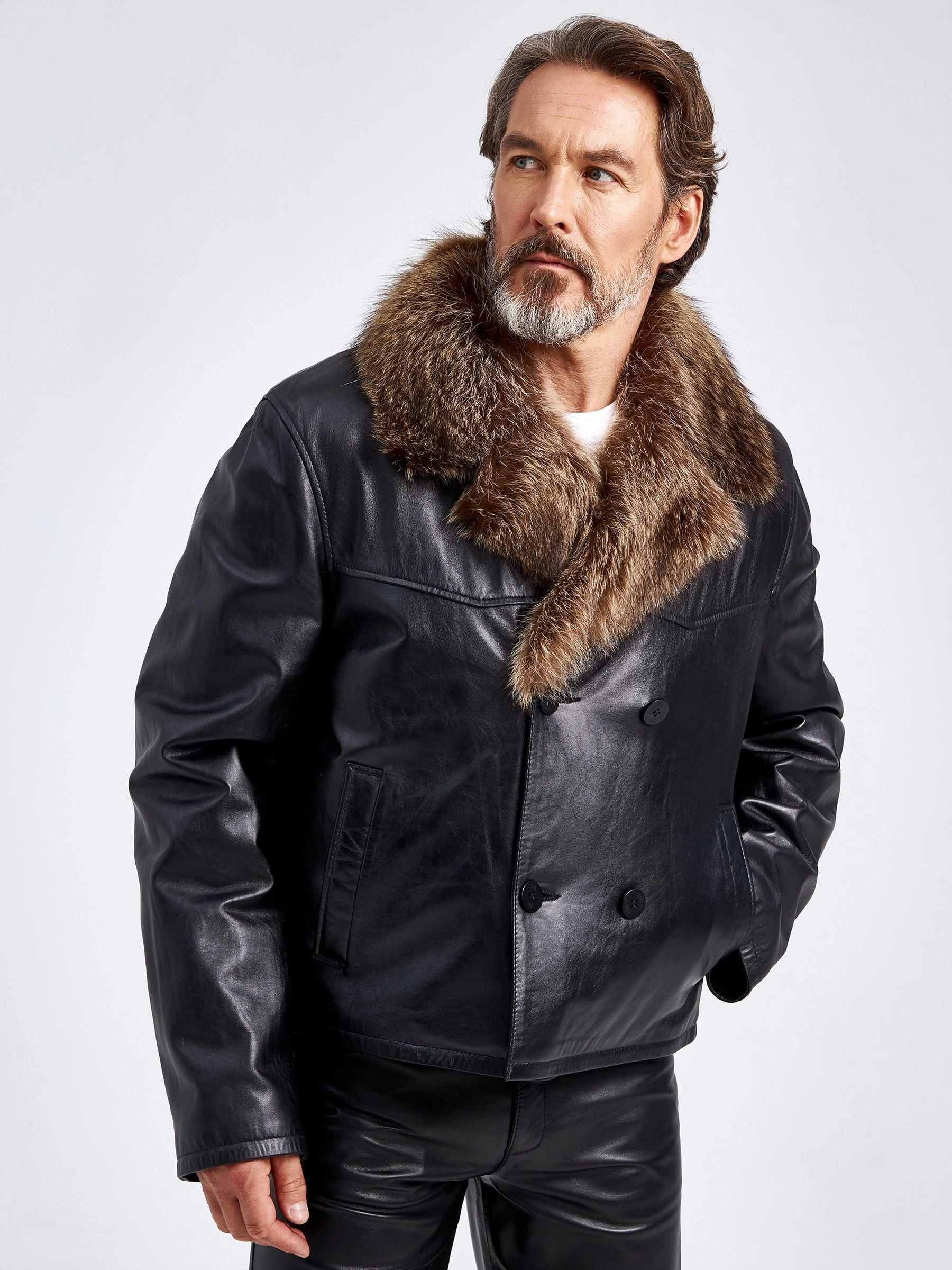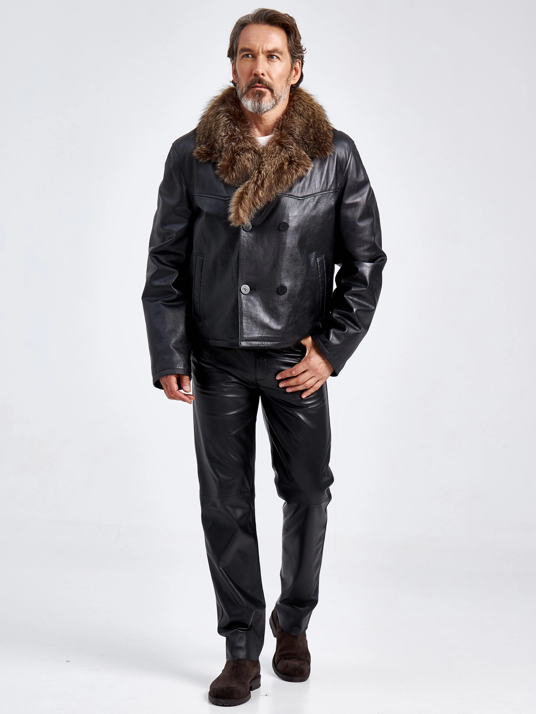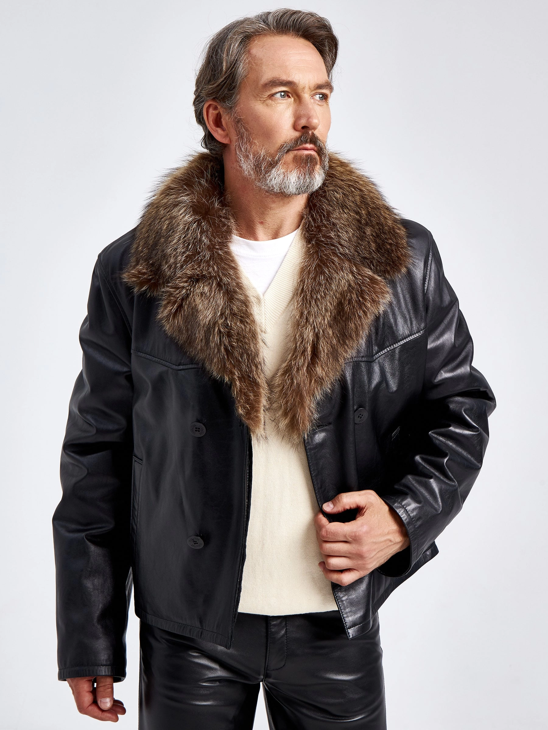 Интересным решением для холодной погоды- станет укороченная двубортная куртка прямого силуэта. Для ее изготовления, мастера использовали черную мягкую кожу и плотную овчину, которая особенно хорошо сохраняет тепло. За дополнительную защиту от ветра отвечают воротник и широкие лацканы из меха енота.