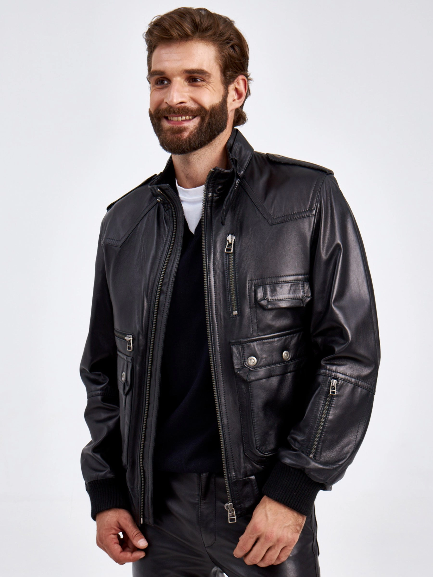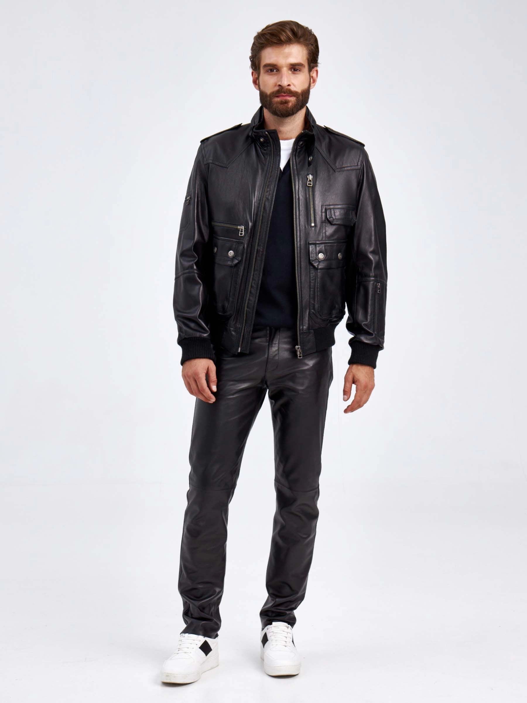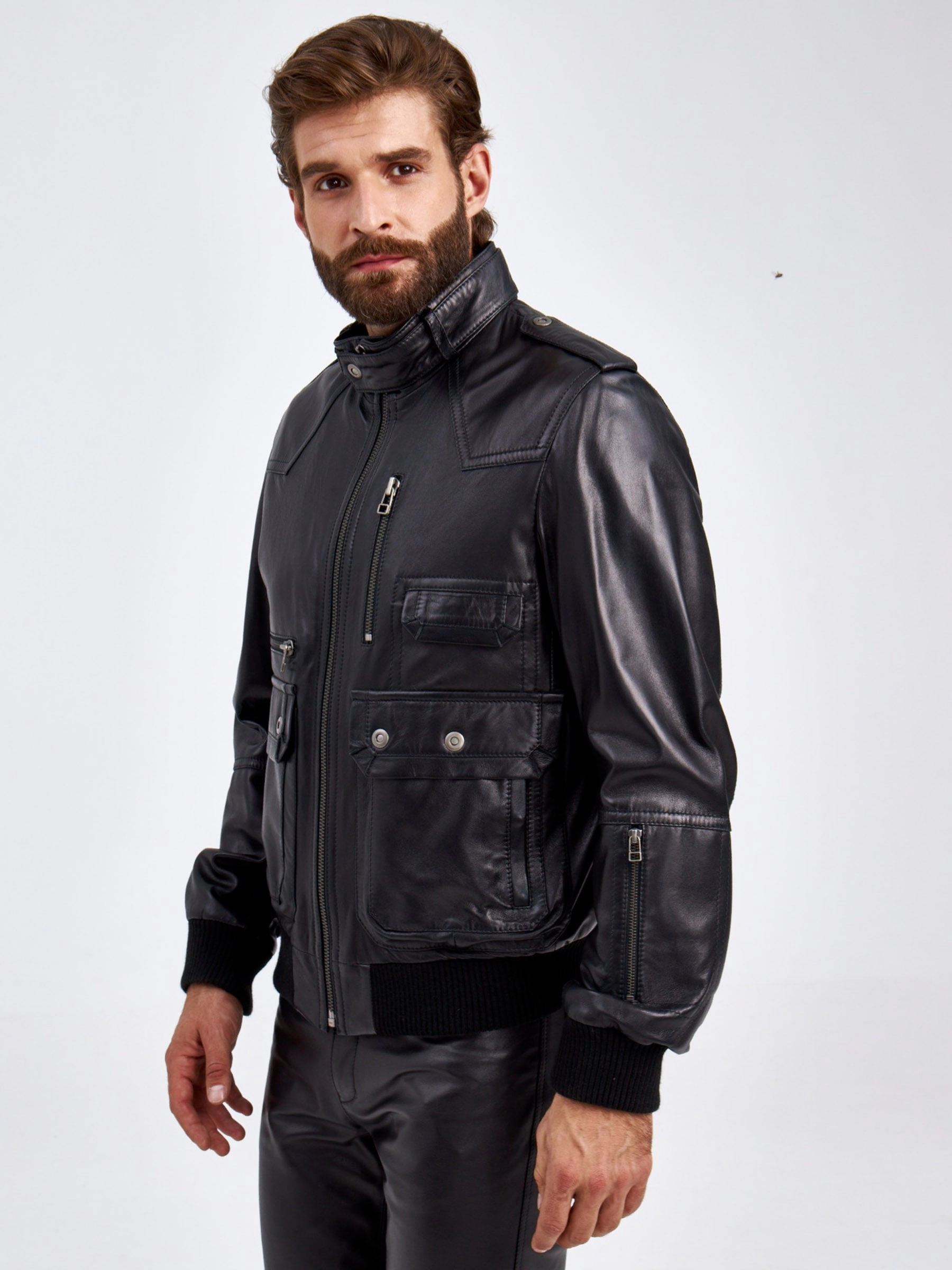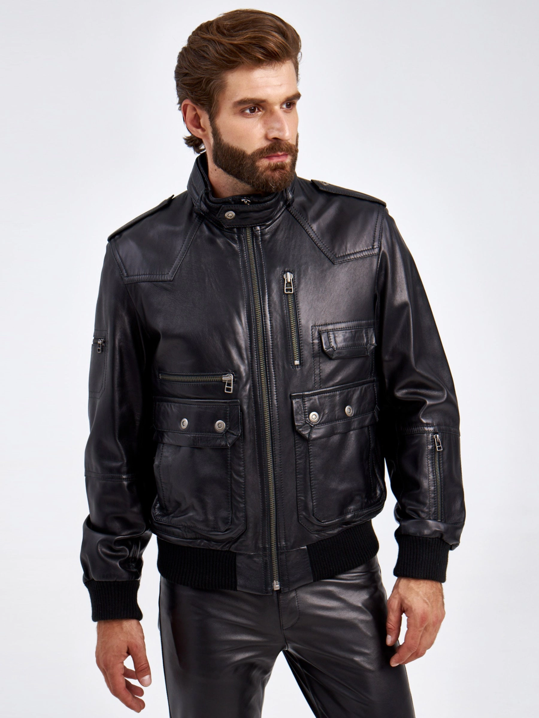 Кожаная куртка бомбер мужская Пит, черная, размер 50, артикул 29190