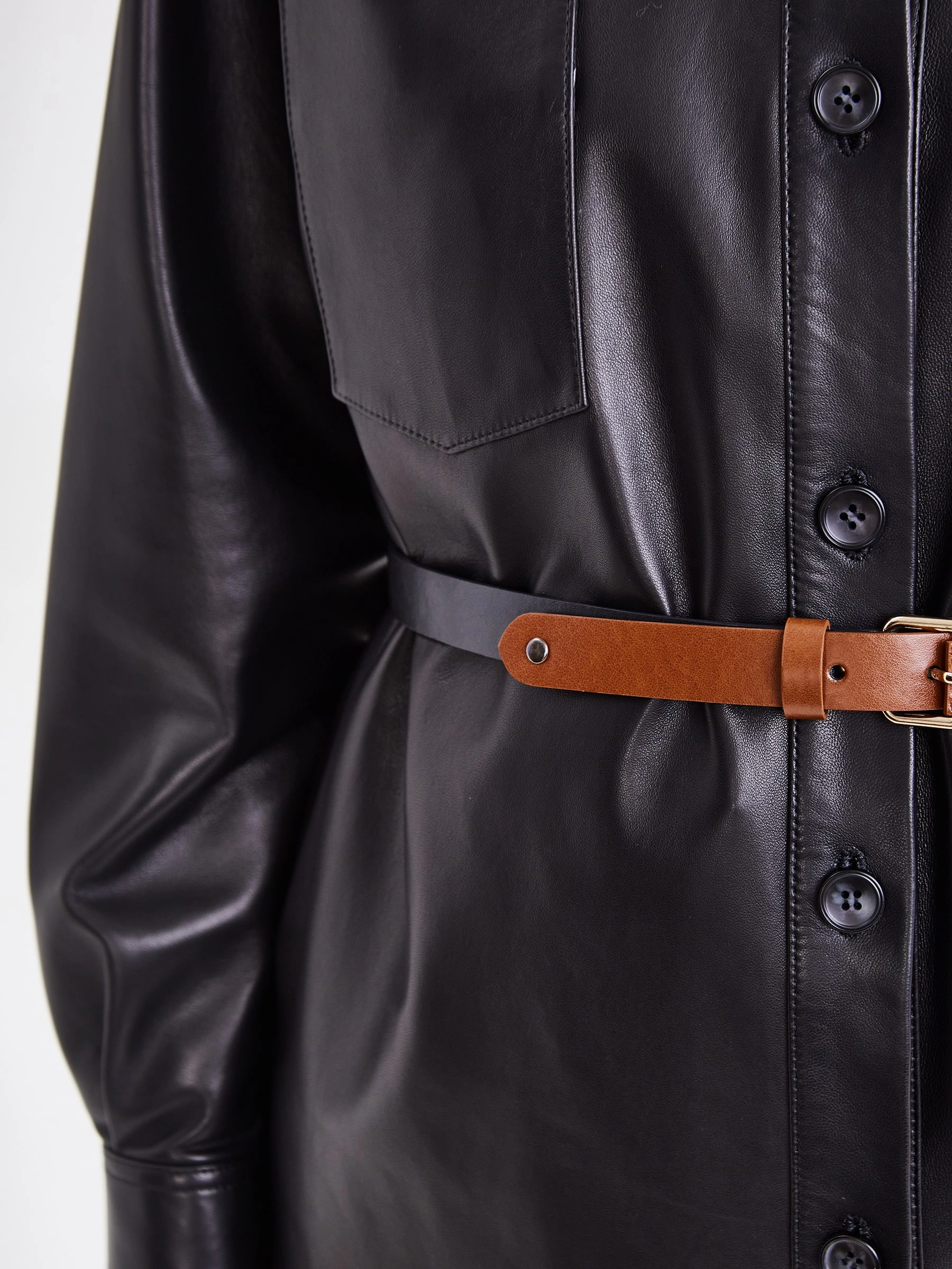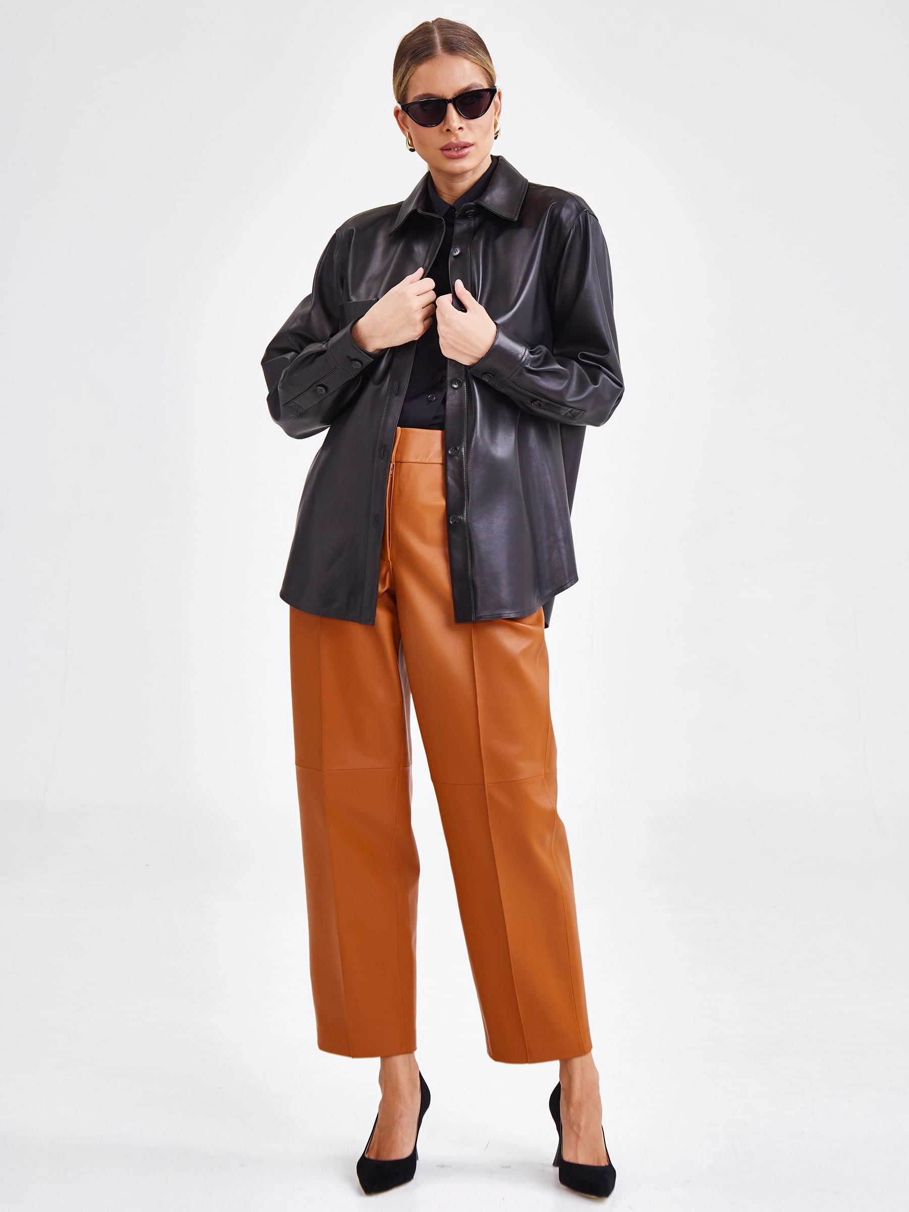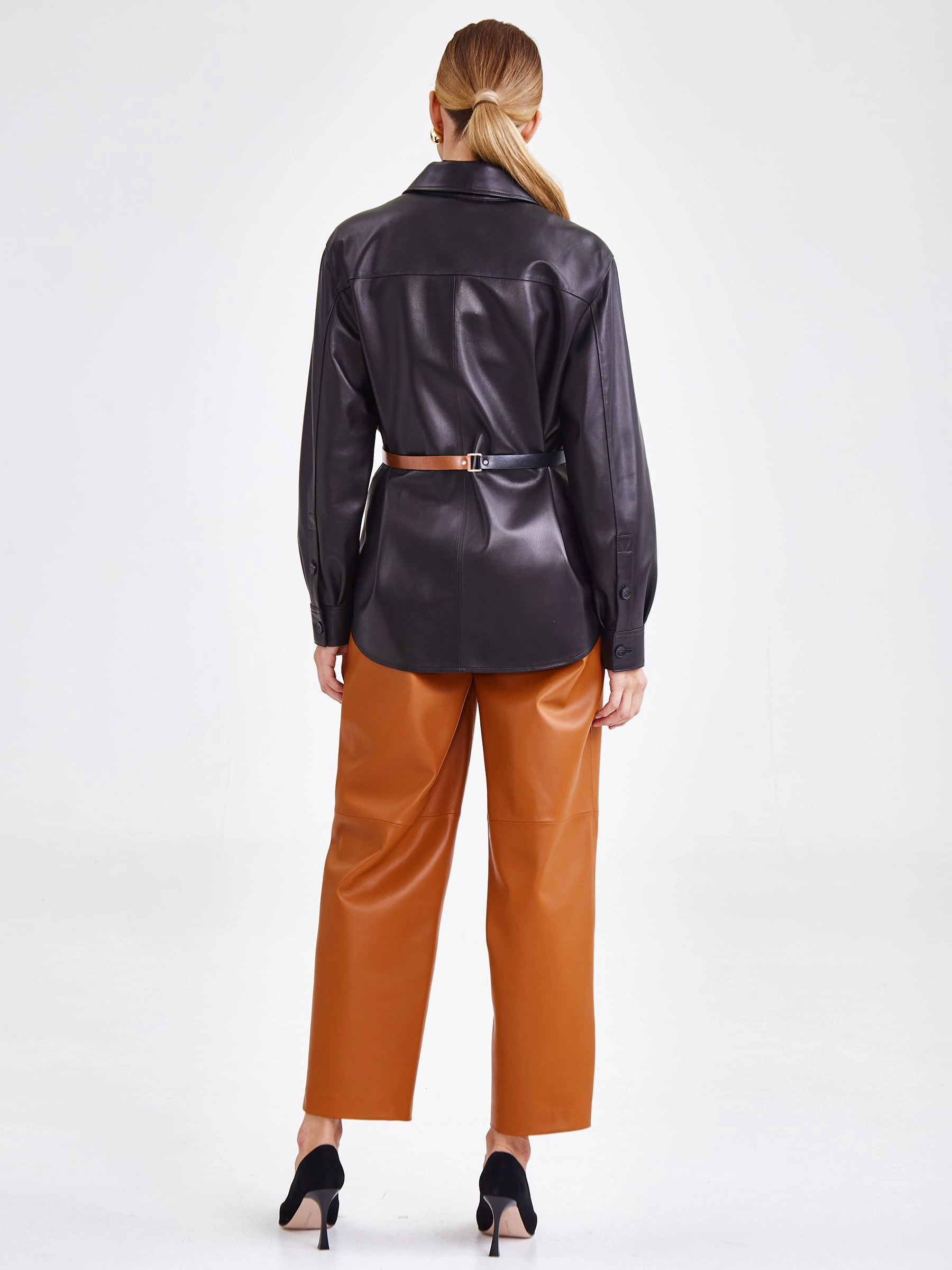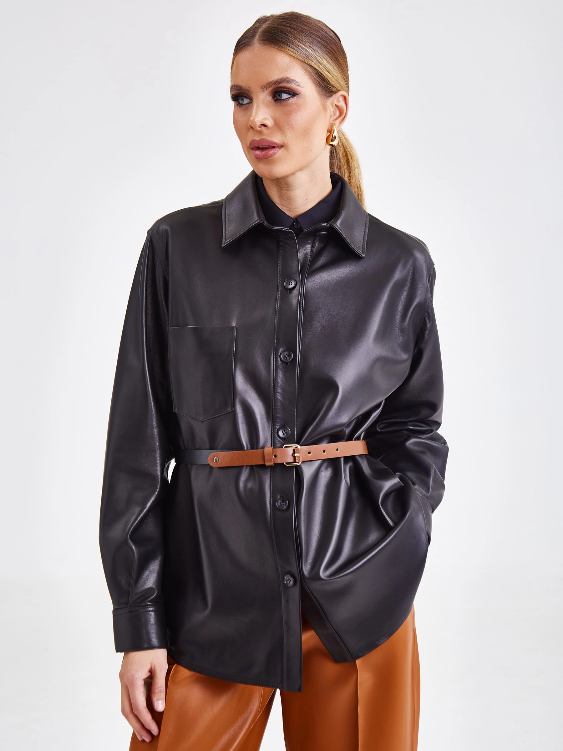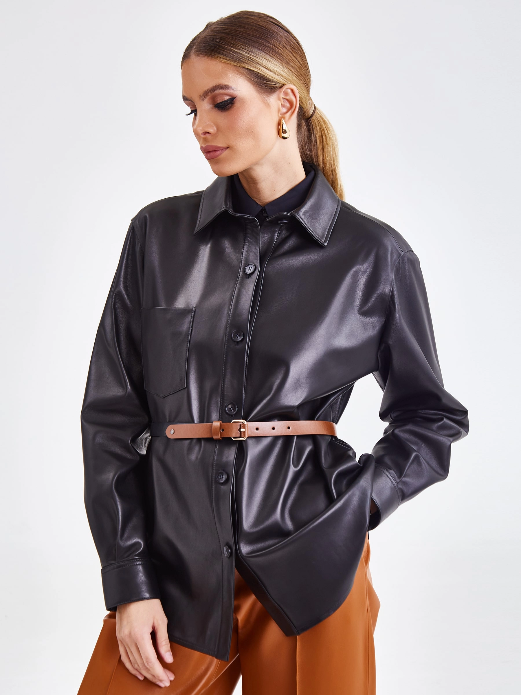 Элегантная женская рубашка прямого кроя выполнена из мягкой натуральной кожи премиум-класса. Это незаменимая деталь гардероба в прохладные дни сезона весна — лето. Длина модели составляет 75 см. Рубашка отличается свободным силуэтом, который можно скорректировать с помощью тонкого кожаного ремня. Среди других особенностей — длинные рукава со спущенной линией плеча, отложной воротник, минималистичный дизайн без отделки и подкладки, а также практичная застёжка на пуговицы. Модель сочетает в себе утончённость и практичность. Рубашка подойдёт как для повседневных, так и для формальных образов. Она отлично комбинируется с брюками, джинсами или юбками. Кожаный ремень позволяет варьировать силуэт — от приталенного до свободного.