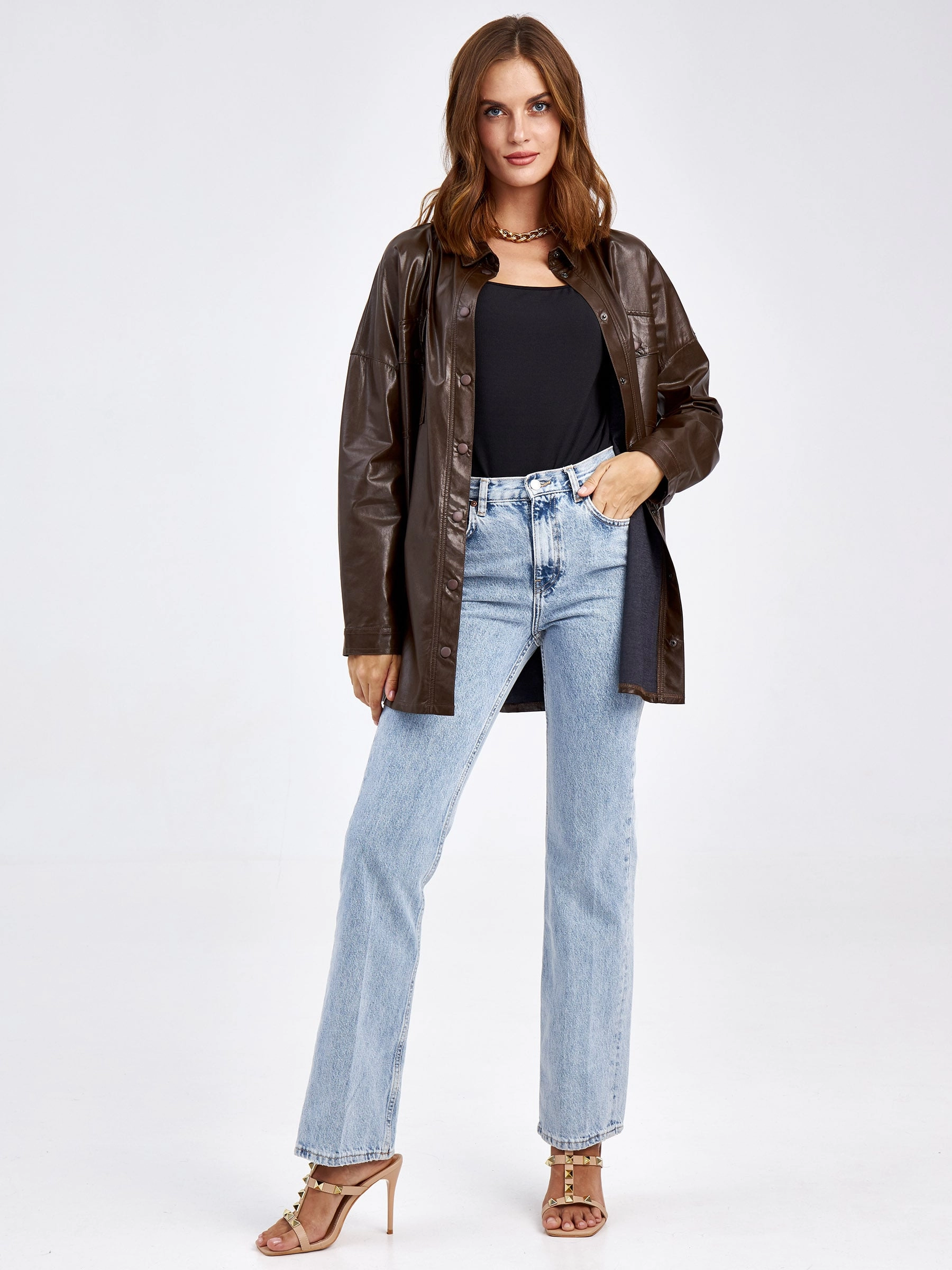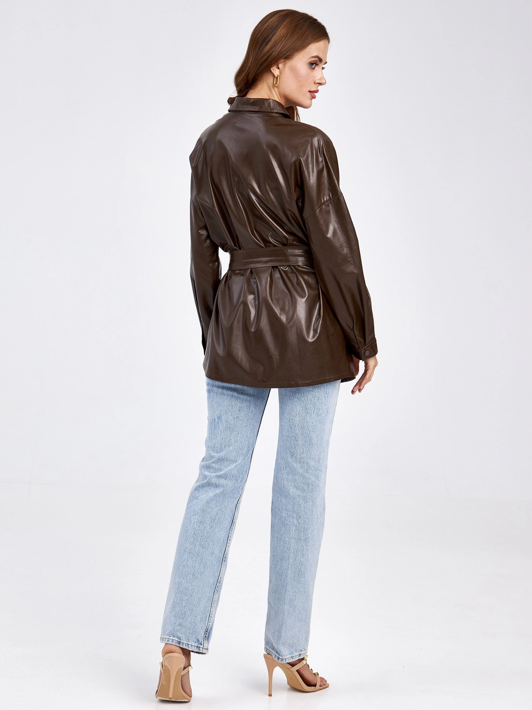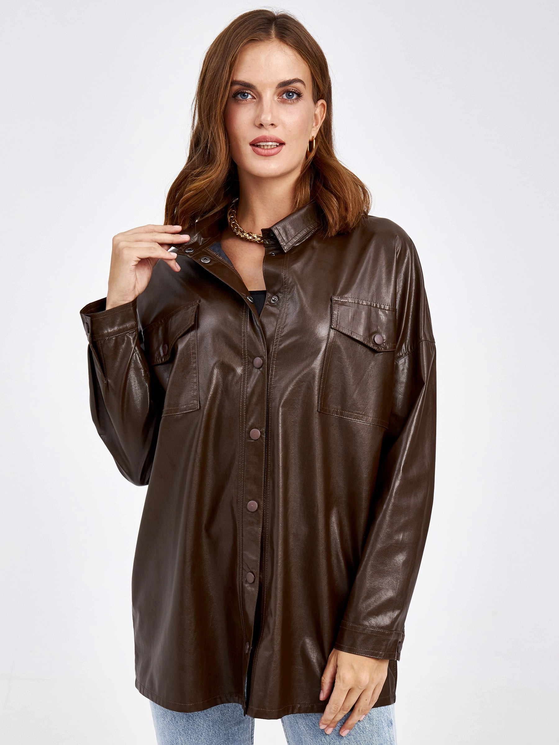 Товар кожаная рубашка женская из экокожи 4820781, коричневая, размер 46, артикул 85700 выполнен из экокожи с застежкой кнопки. Рассчитан на сезон: демисезон. Длина изделия 73 см, силуэт прямой.