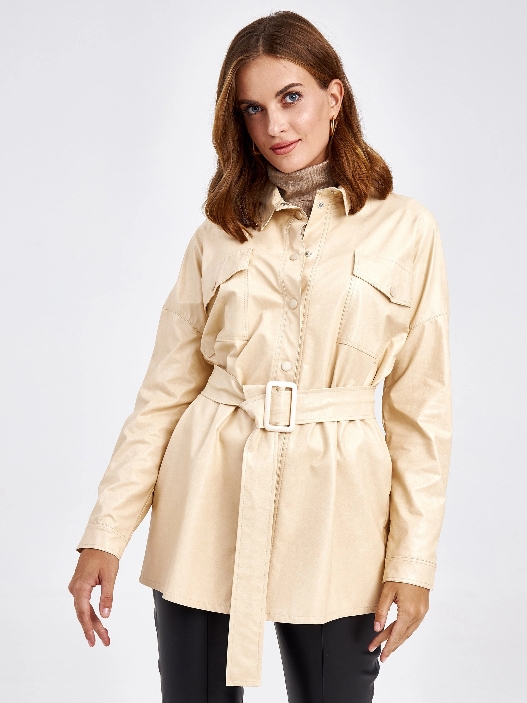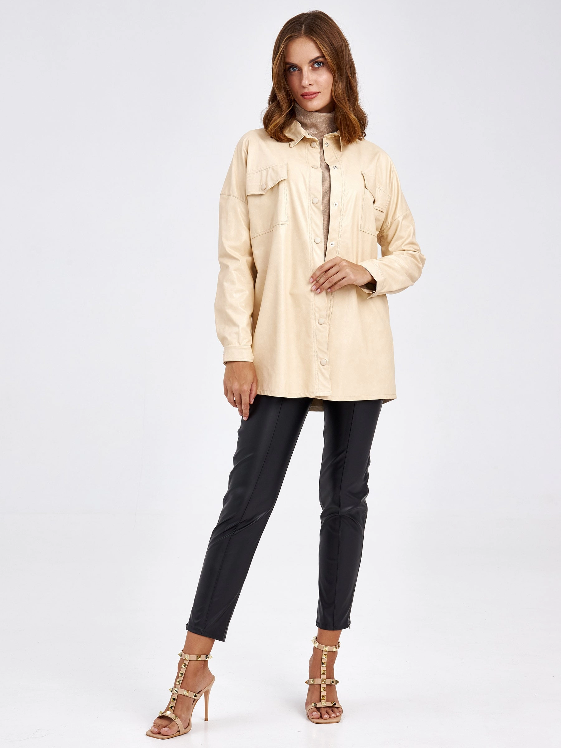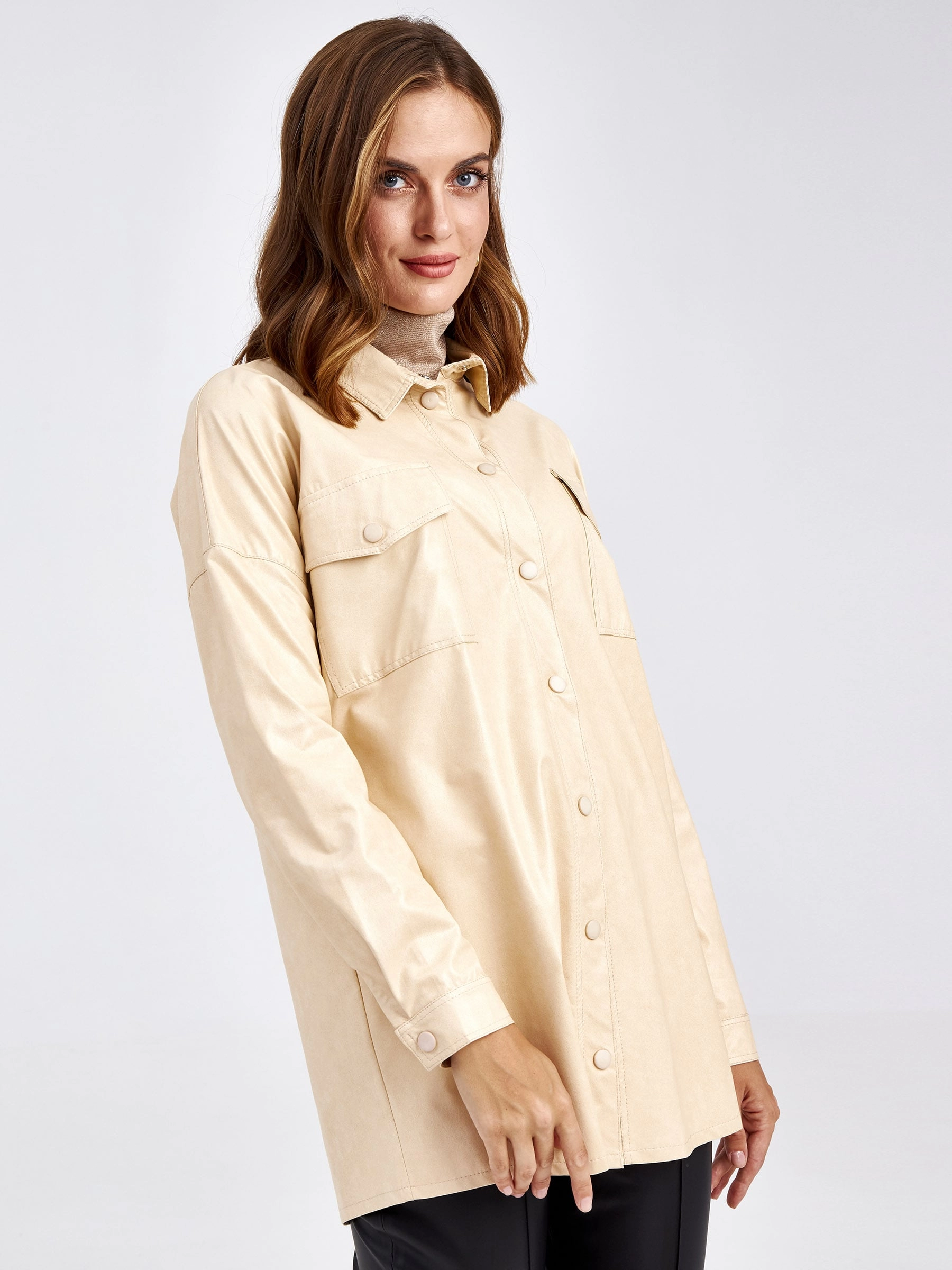Товар женская кожаная рубашка из экокожи 4820785, молочная, размер 44, артикул 85720 выполнен из экокожи с застежкой кнопки. Рассчитан на сезон: демисезон. Длина изделия 73 см, силуэт прямой.