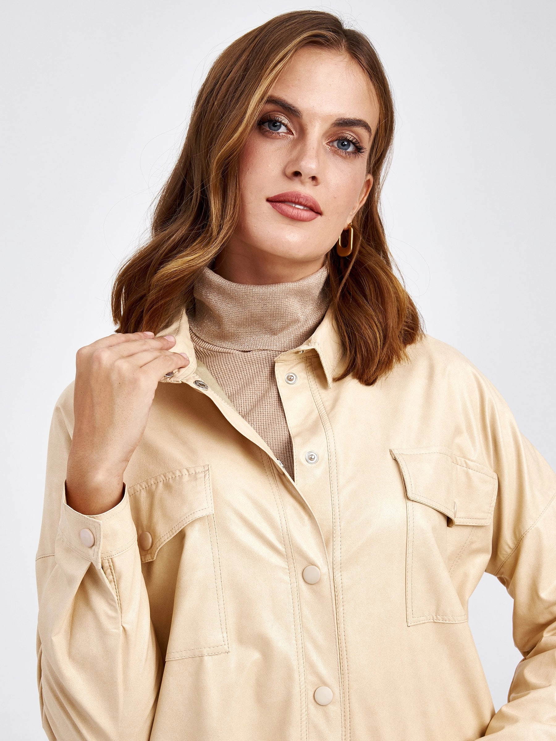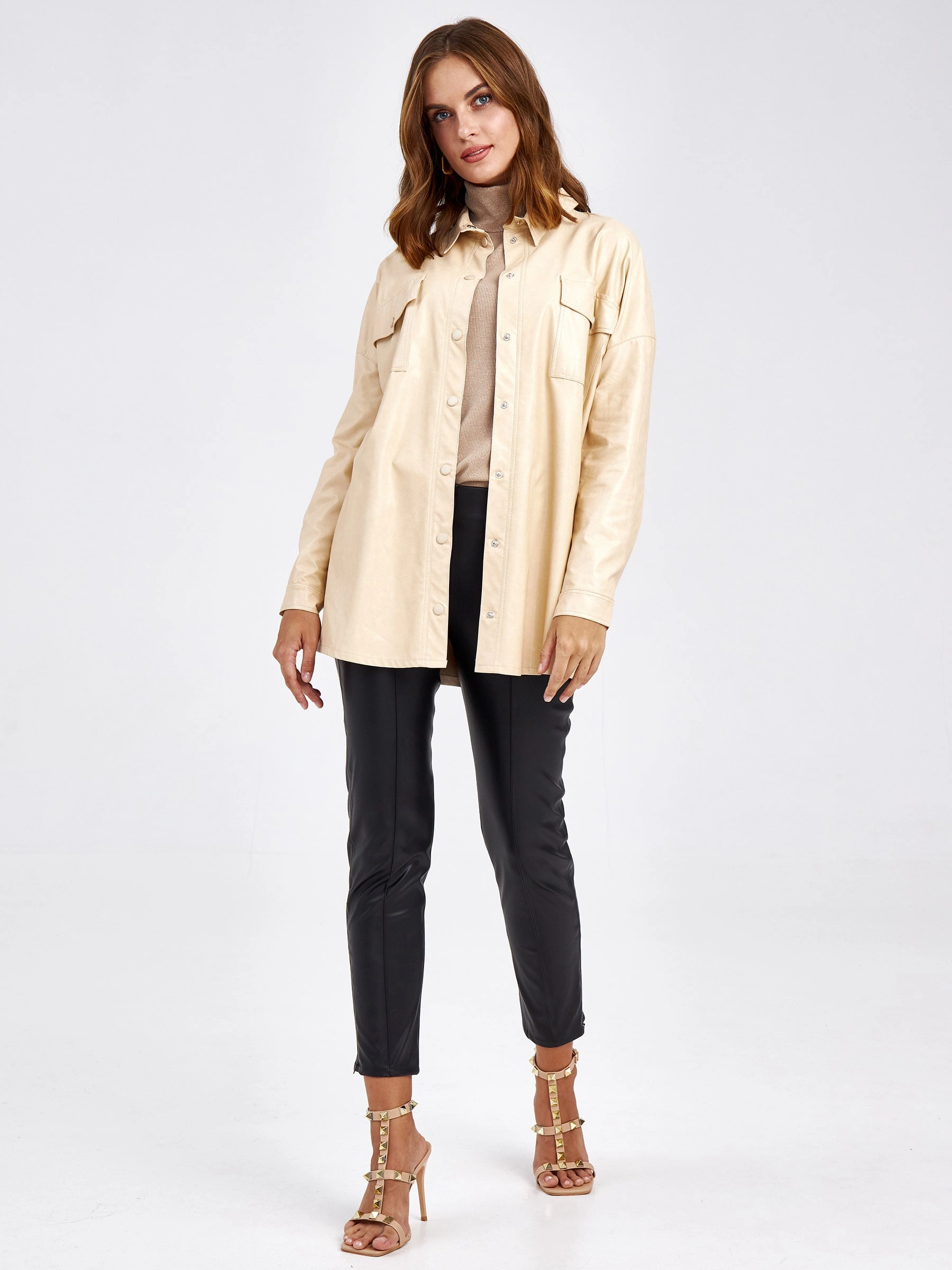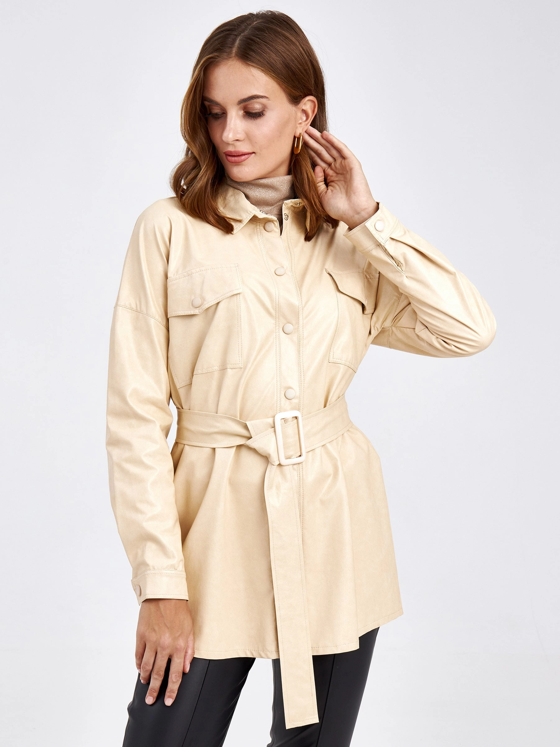 Товар женская кожаная рубашка из экокожи 4820785, молочная, размер 44, артикул 85720 выполнен из экокожи с застежкой кнопки. Рассчитан на сезон: демисезон. Длина изделия 73 см, силуэт прямой.
