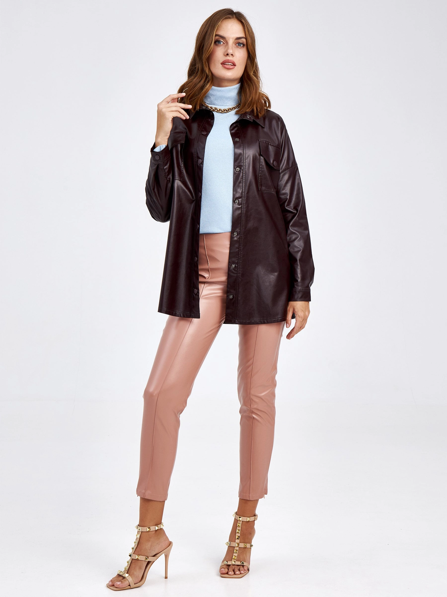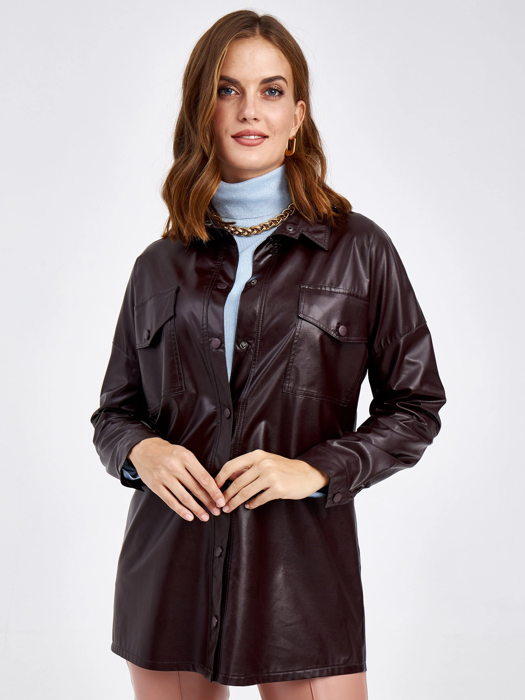 Товар кожаная рубашка женская из экокожи 4878441, темно-коричневая, размер 44, артикул 85710 выполнен из экокожи с застежкой кнопки. Рассчитан на сезон: демисезон. Длина изделия 73 см, силуэт прямой.