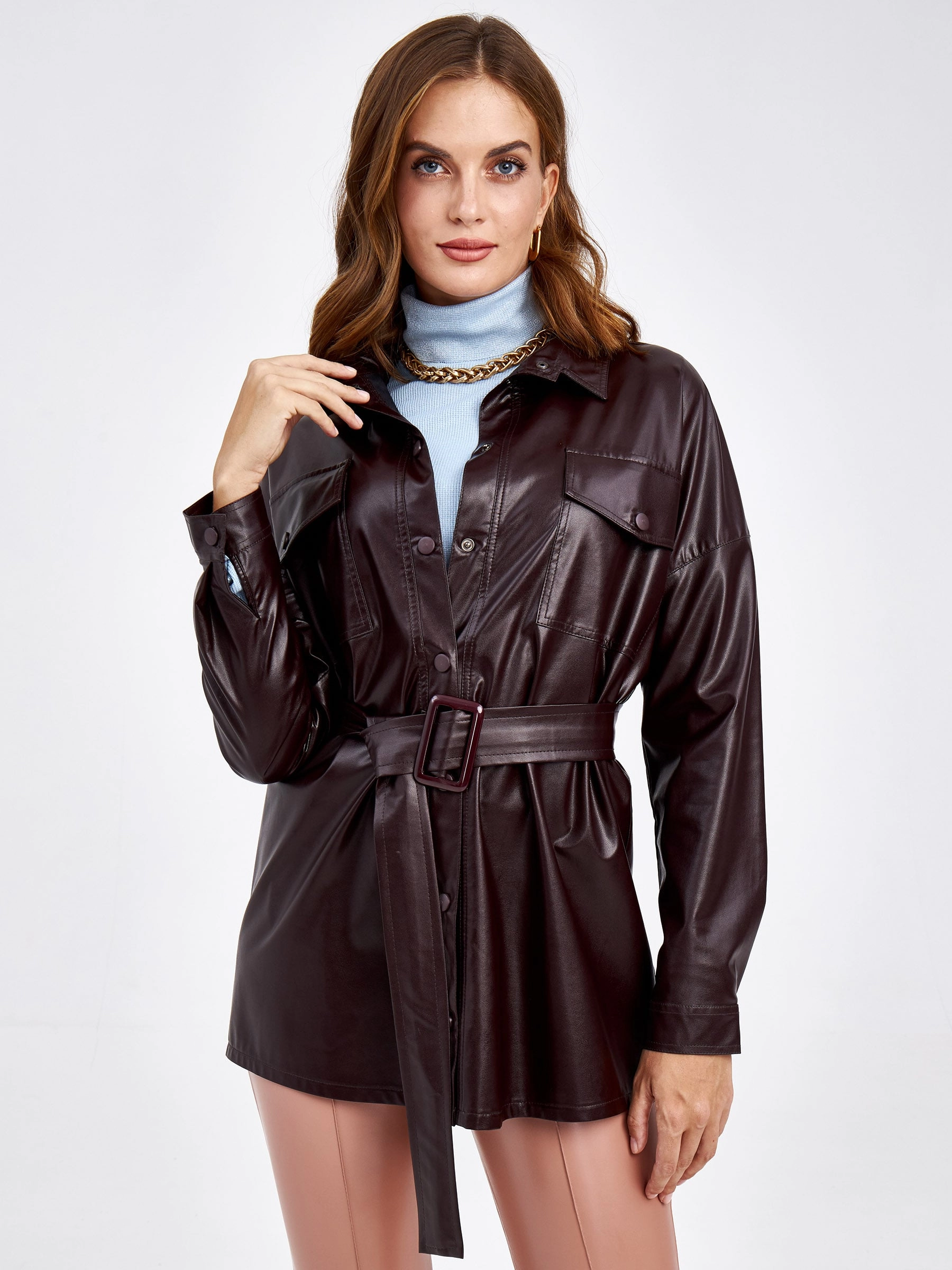 Стильная рубашка длиной 73 см из качественной экокожи прямого кроя. Спущенный рукав с манжетами на кнопках и отложной воротник создают современный силуэт. Нагрудные карманы и широкий пояс с пряжкой добавляют практичности и подчёркивают талию. Лёгкий и комфортный эко-материал делает модель универсальной — сочетайте с кожаными брюками для монохромного образа, джинсами-скинни для повседневного стиля или юбкой-карандаш для элегантного лука!