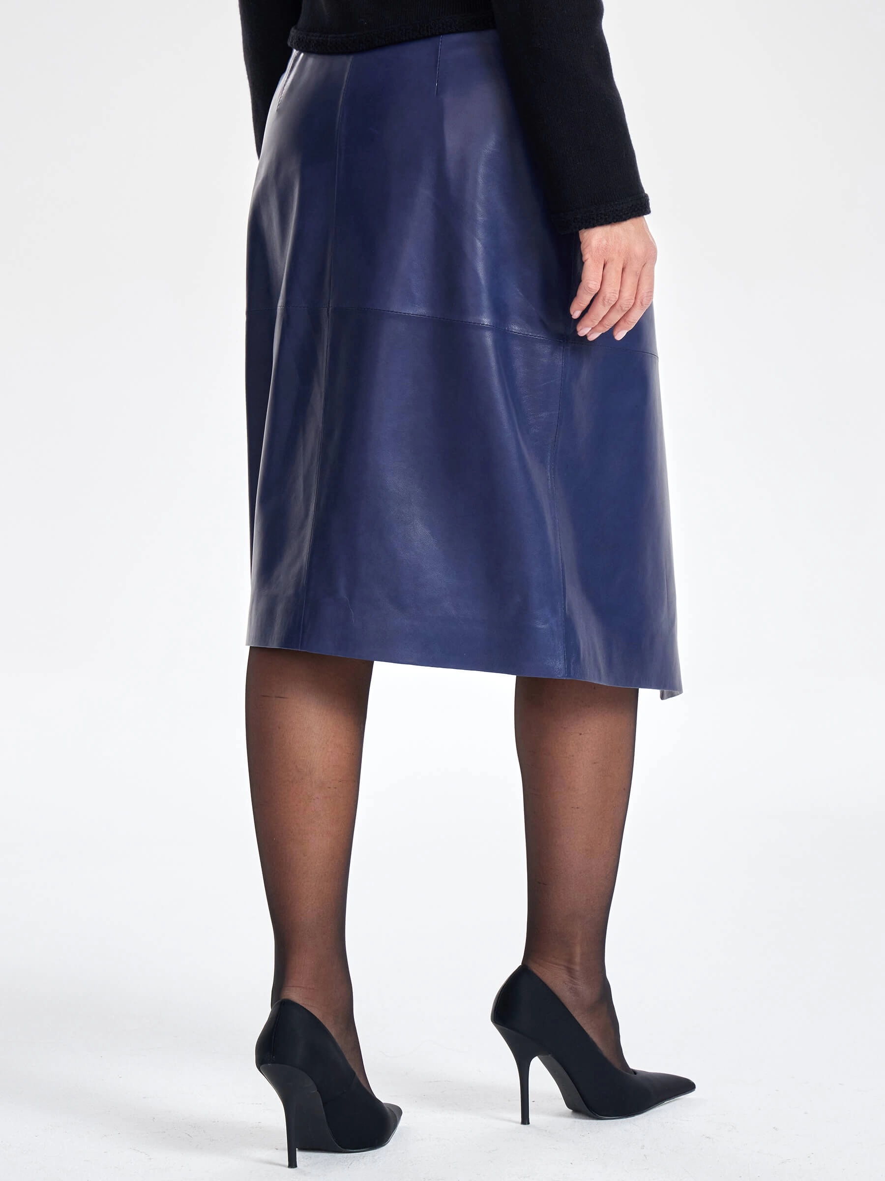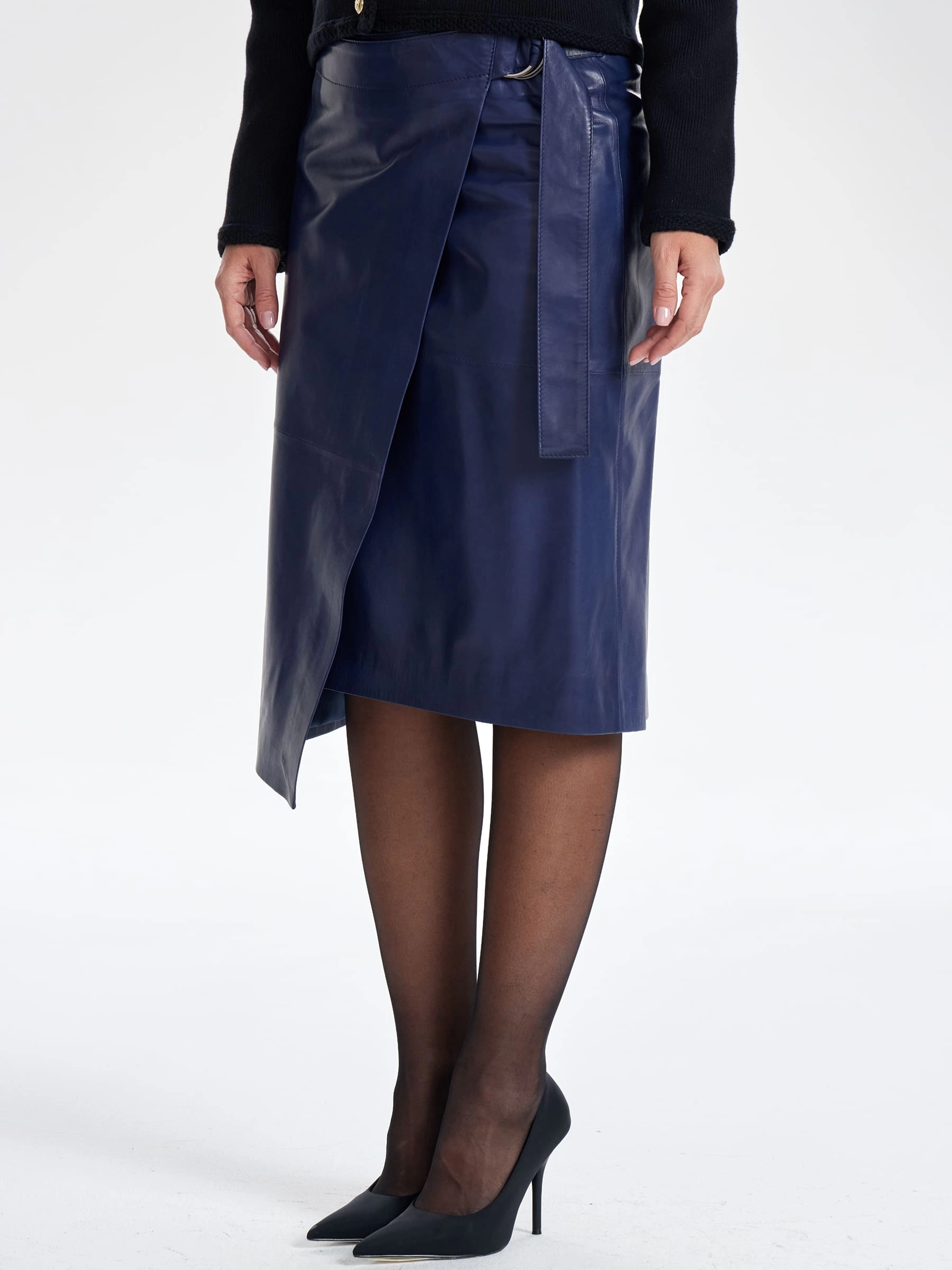 Товар кожаная юбка миди с запахом 07, синяя, размер 48, артикул 86372 выполнен из натуральной кожи с застежкой молния. Рассчитан на сезон: демисезон. Длина изделия 65 см, силуэт прямой.