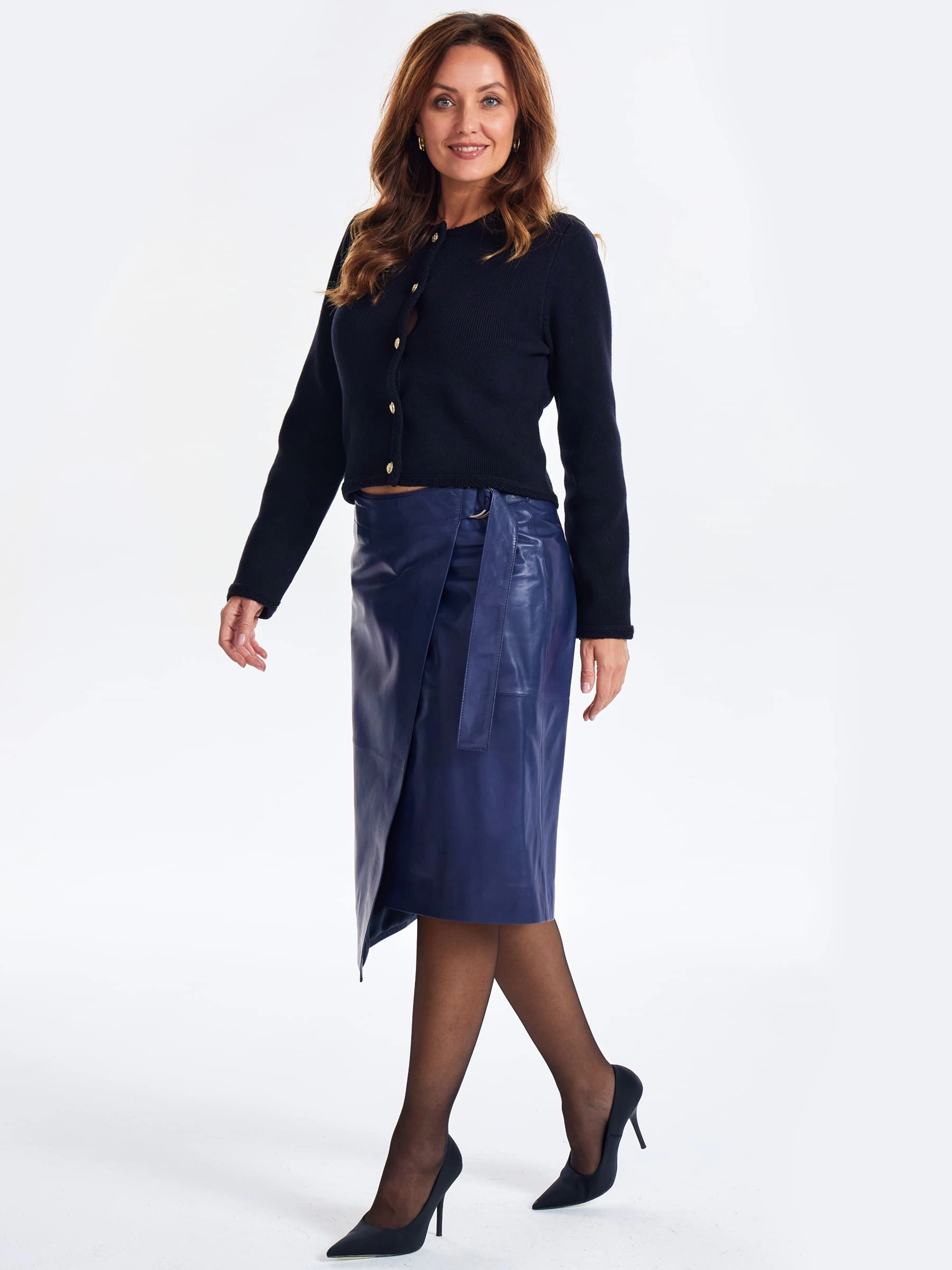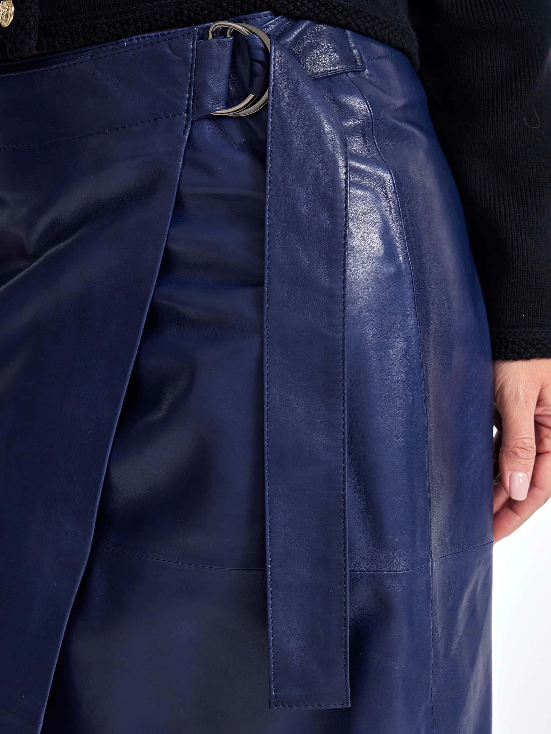 Кожаная юбка миди с запахом 07, синяя, размер 48, артикул 86372