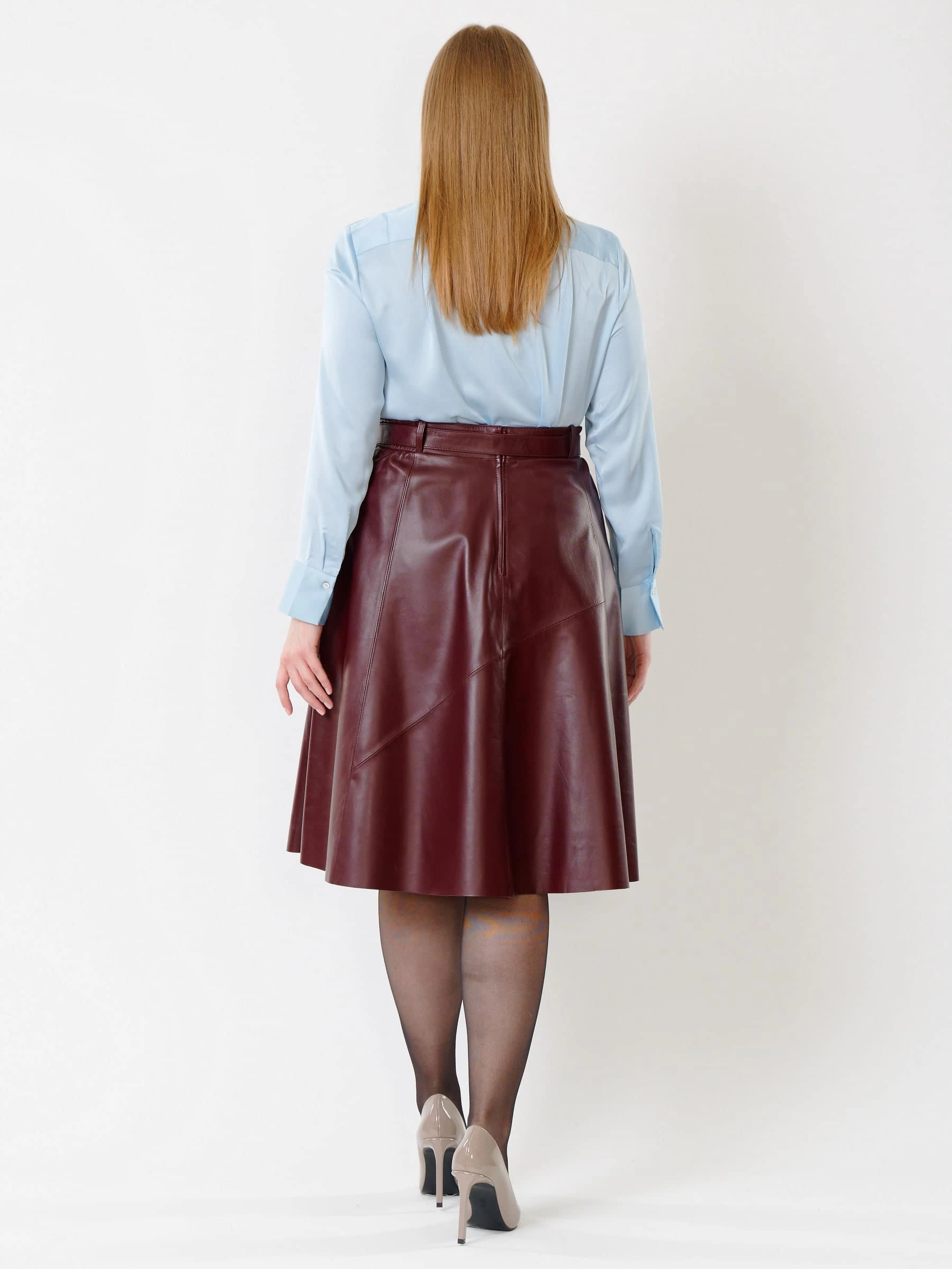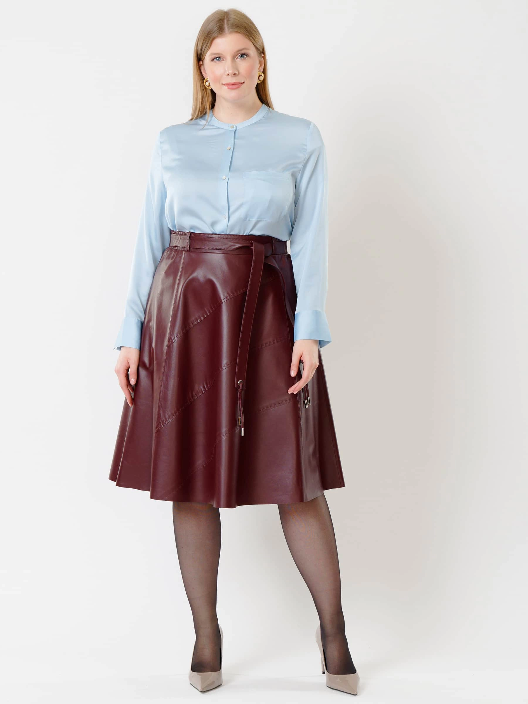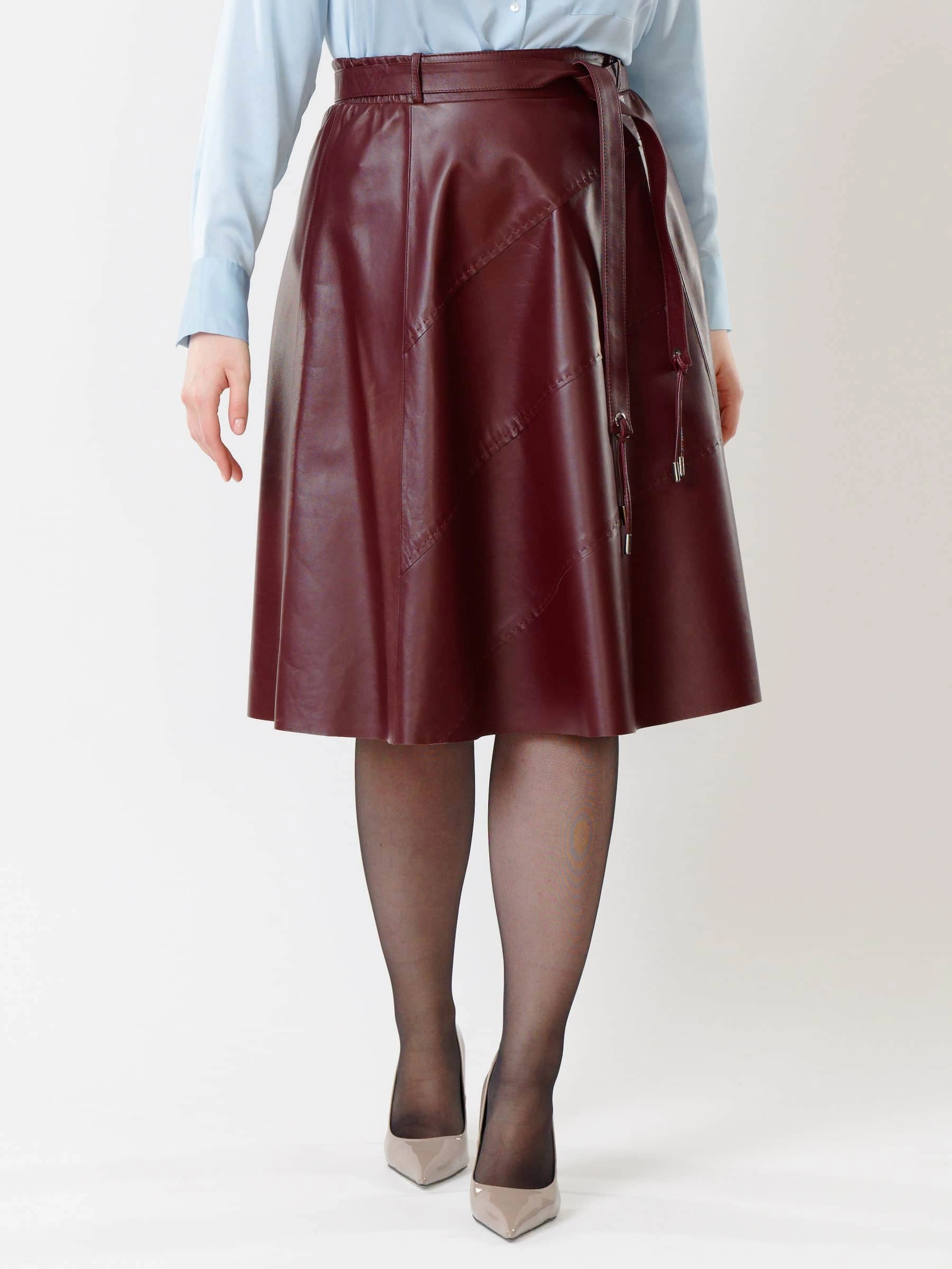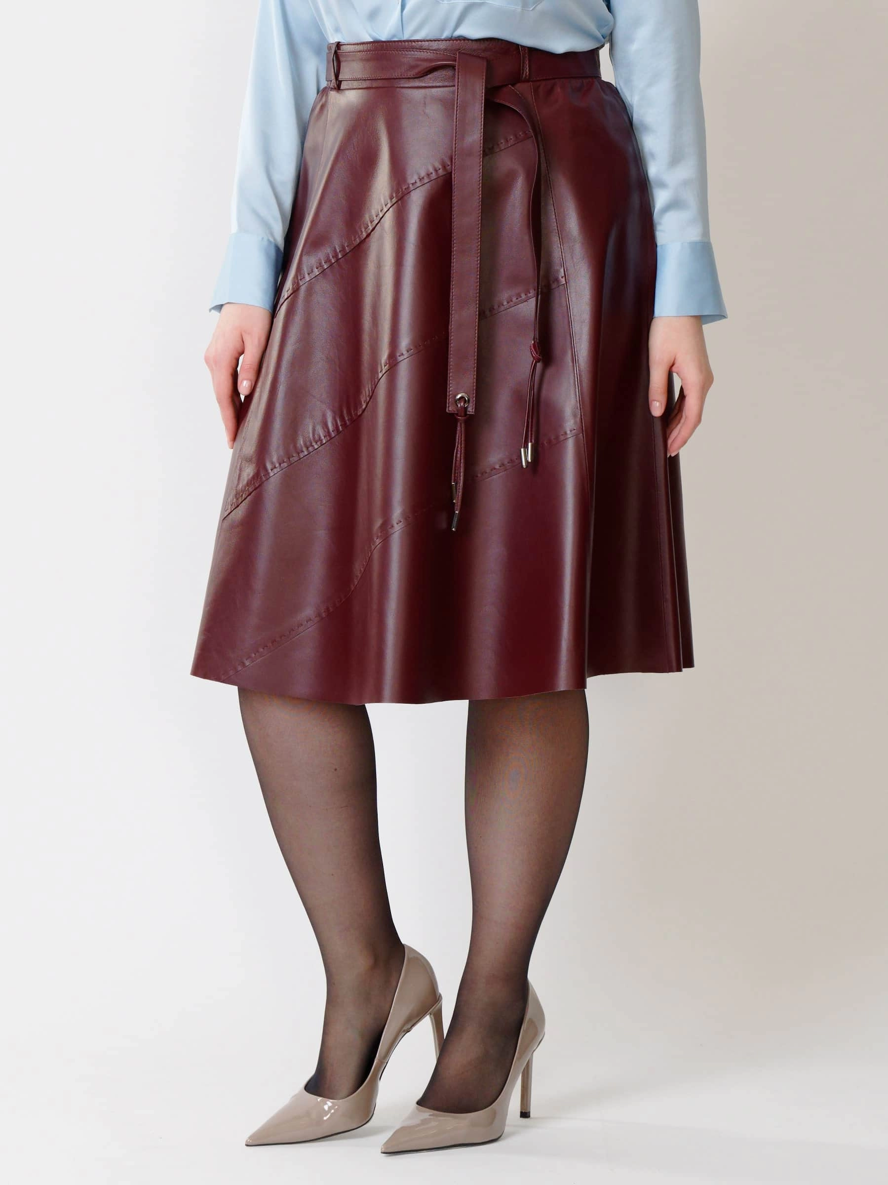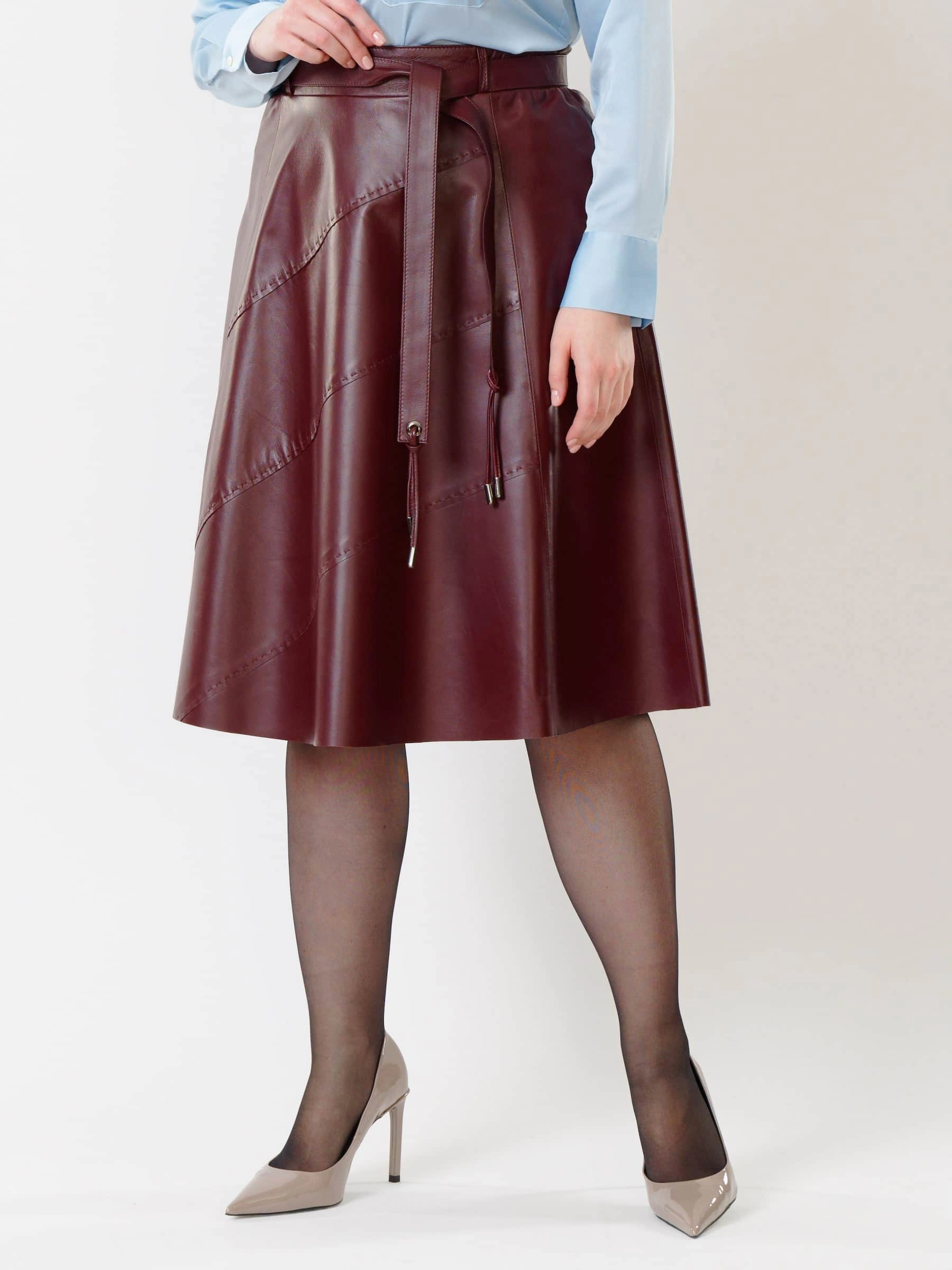 Товар кожаная расклешенная юбка из натуральной кожи 01рс, бордовая, размер 44, артикул 85441 выполнен из натуральной кожи с застежкой молния. Рассчитан на сезон: демисезон. Длина изделия 70 см, силуэт расклешенный.