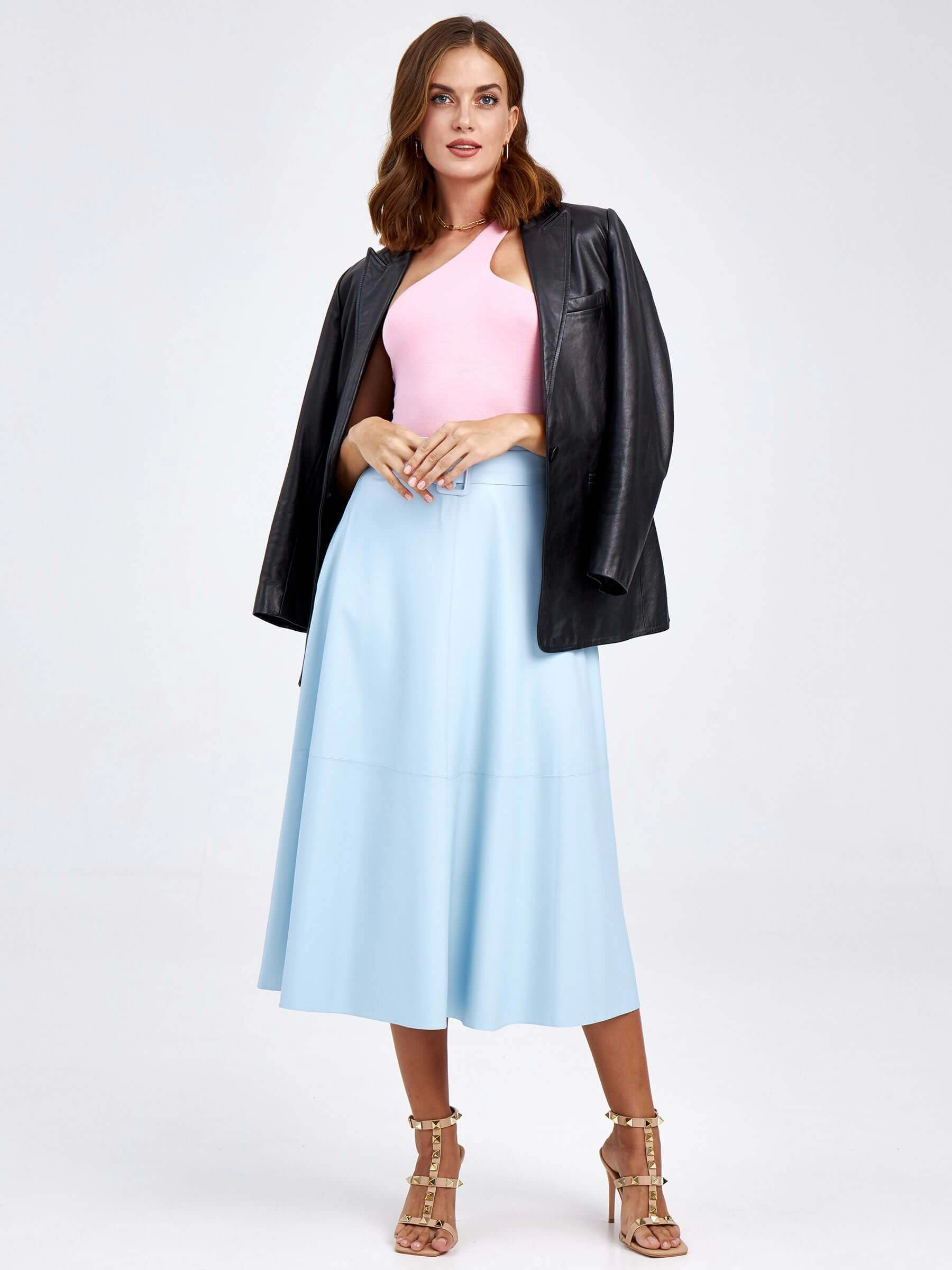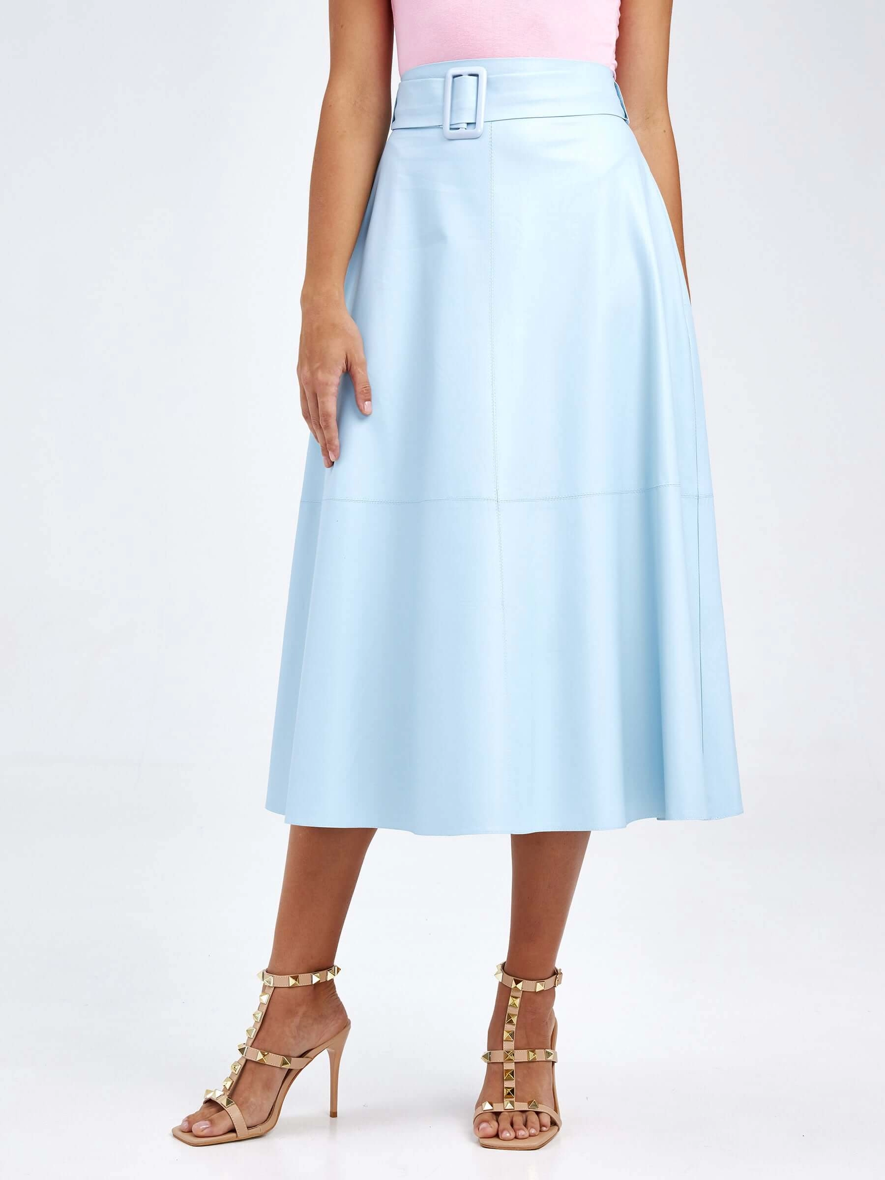 Товар женские кожаная юбка из экокожи 4820757, голубая, размер 48, артикул 85770 выполнен из экокожи с застежкой молния. Рассчитан на сезон: демисезон. Длина изделия 75-90 см, силуэт расклешенный.