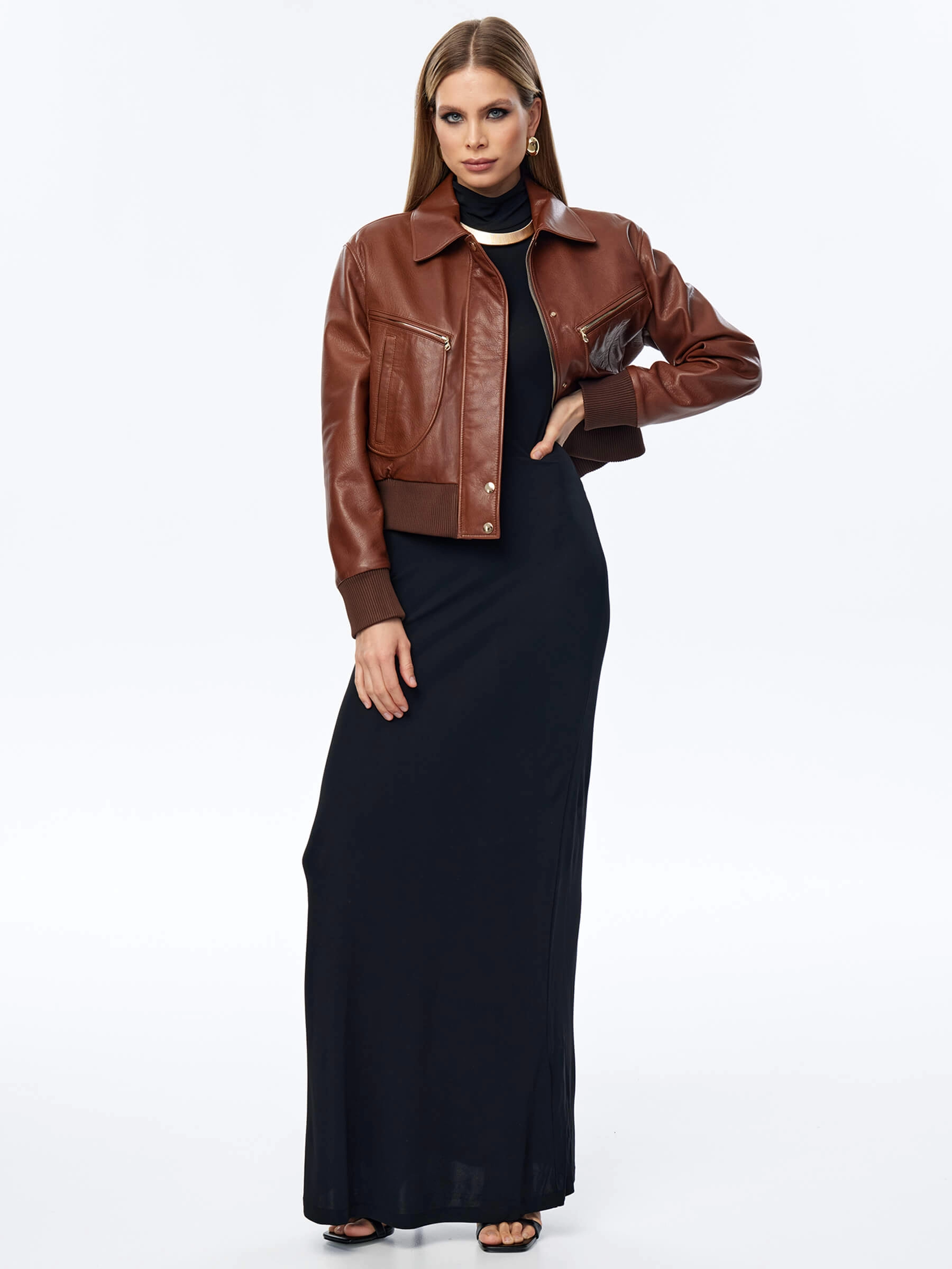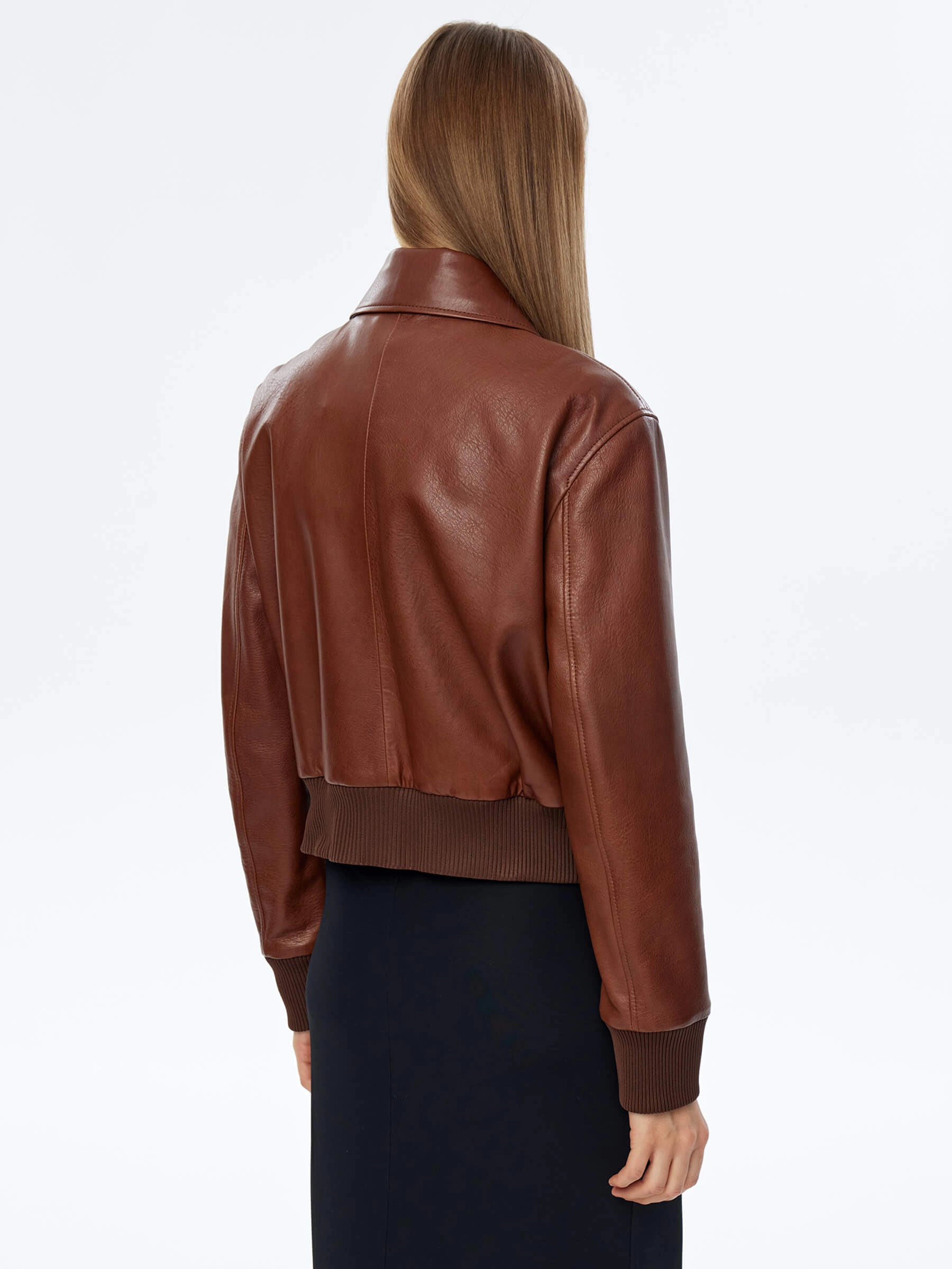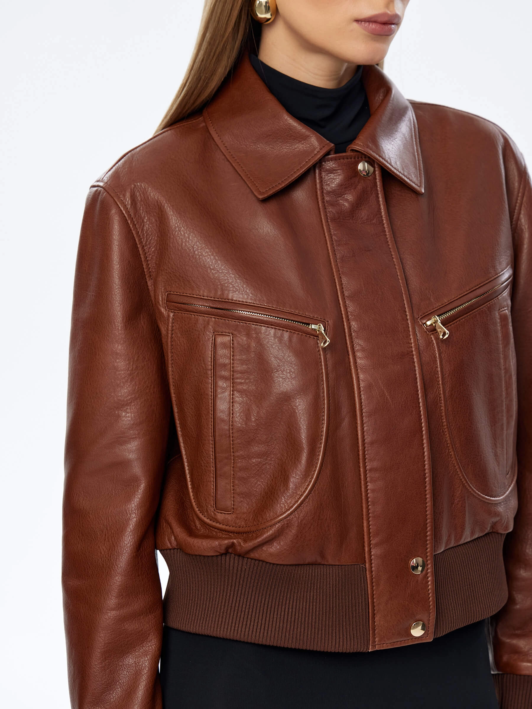 Для пошива короткой куртки-бомбер с отложным воротником и четырьмя карманами, использовали мелкозернистую кожу премиум класса. Бережная выделка сделала материал более мягким и пластичным. Модель свободного кроя со спущенной линией плеча комфортно садится по фигуре, не ограничивает движение. Изделие застегивается встречной молнией с широкой планкой. Манжеты и пояс дополнили трикотажной резинкой.