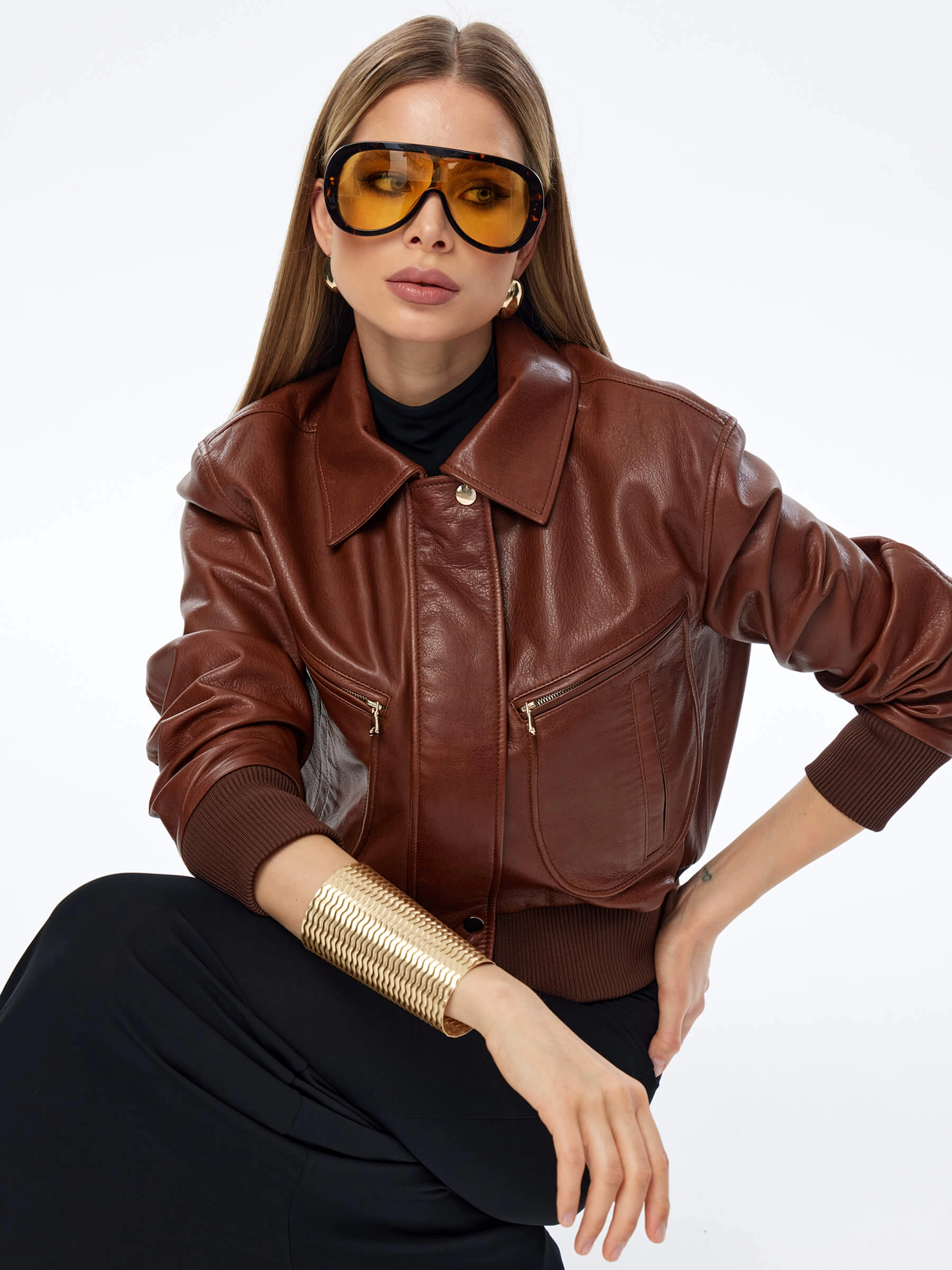 Кожаная женская куртка бомбер премиум класса 3066, песочная, размер 44, артикул 24070