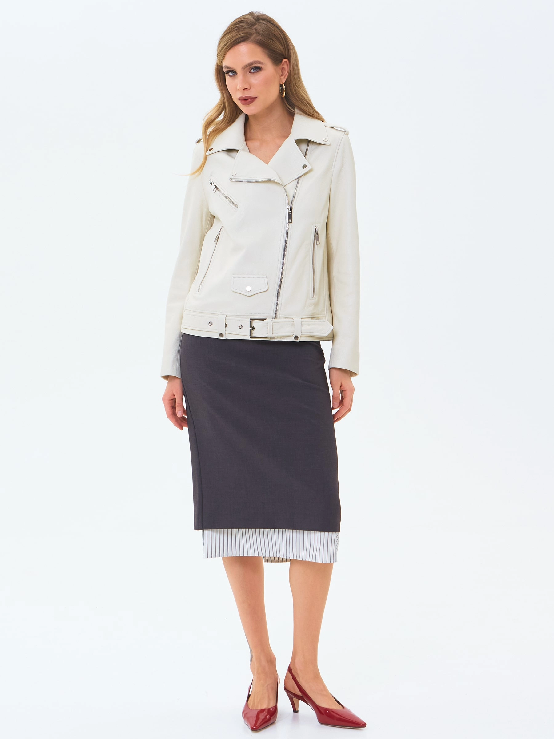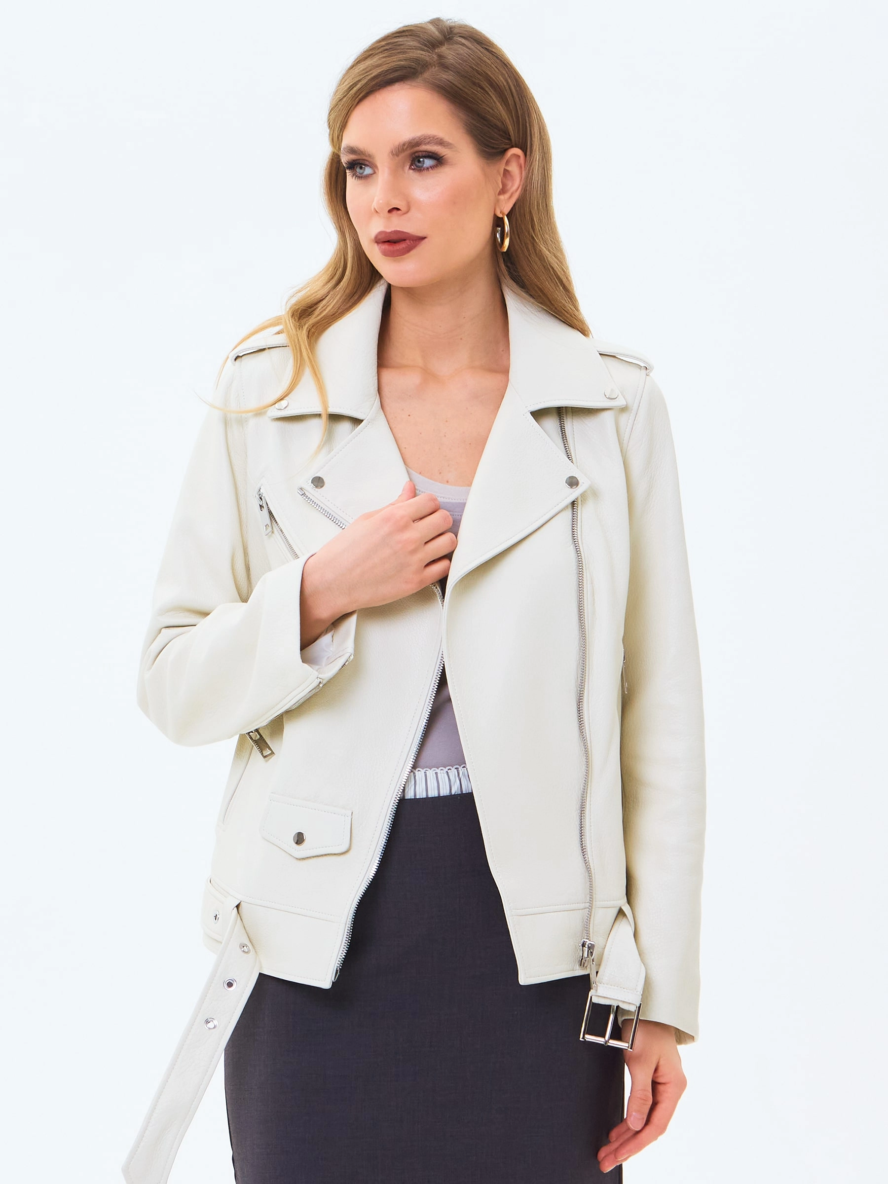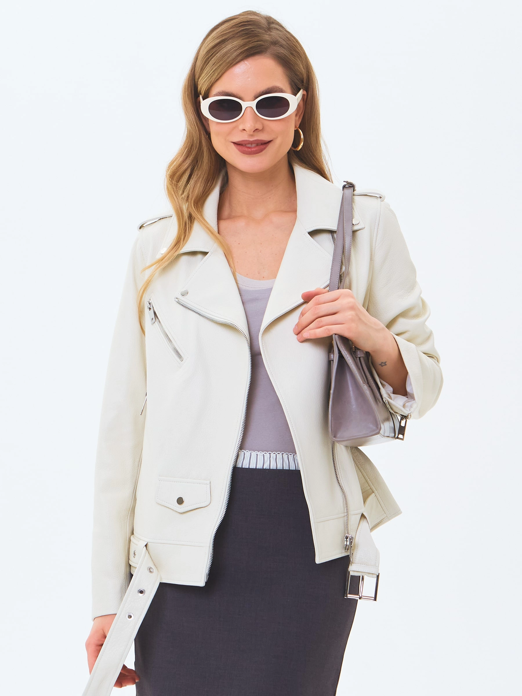 Кожаная женская куртка косуха с поясом премиум класса 3078, белая, размер 42, артикул 24520