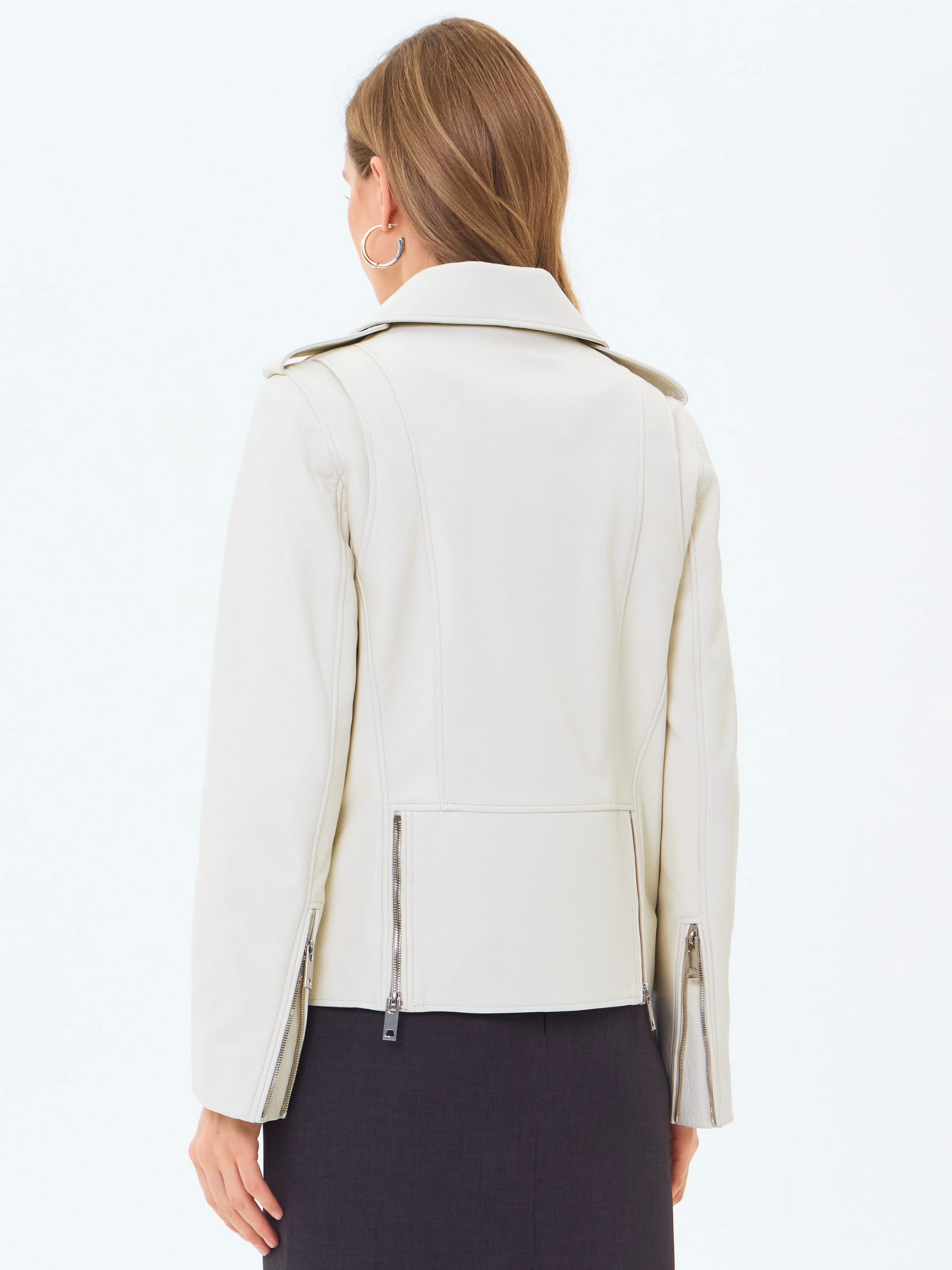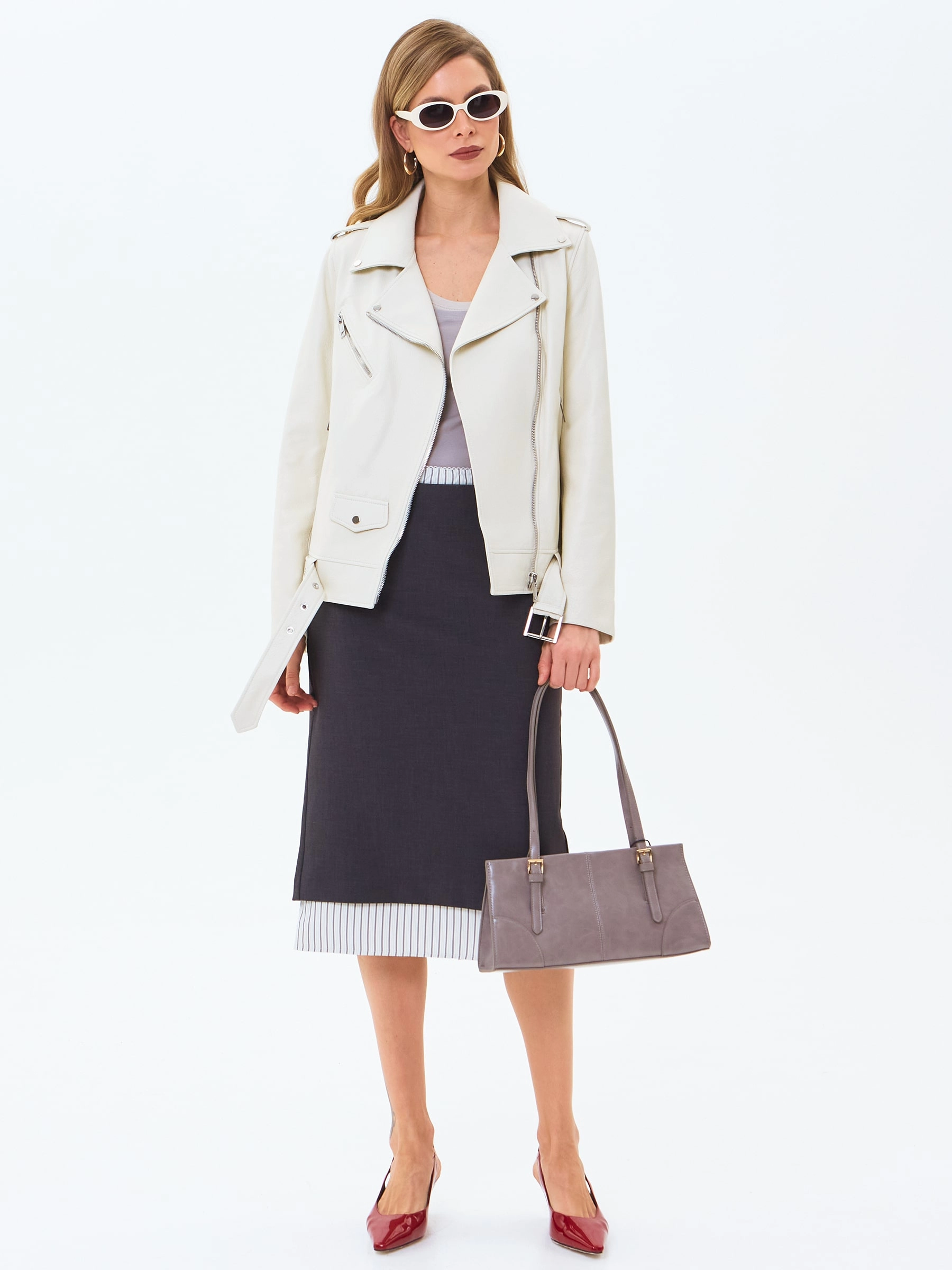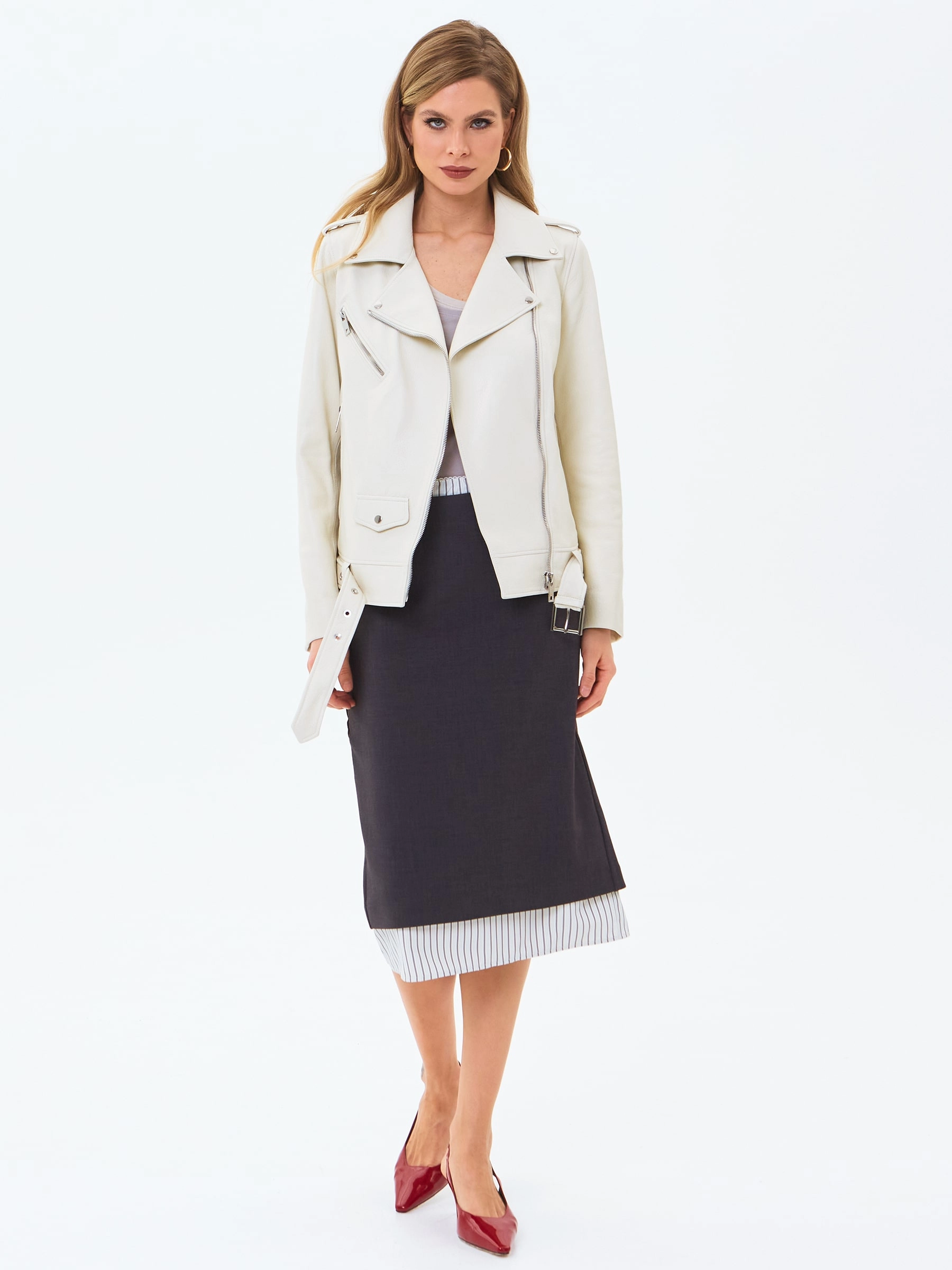 Кожаная женская куртка косуха с поясом премиум класса 3078, белая, размер 42, артикул 24520