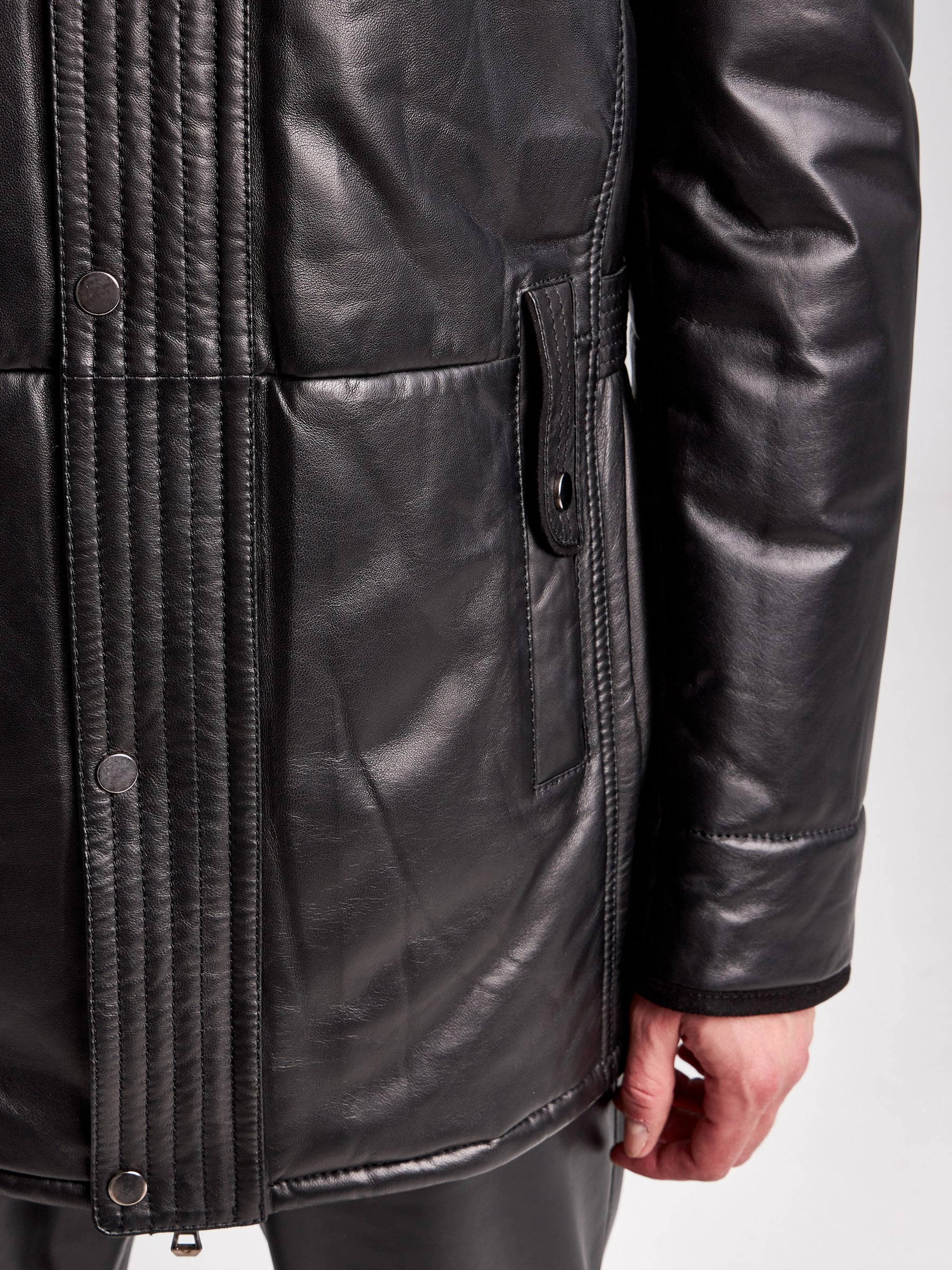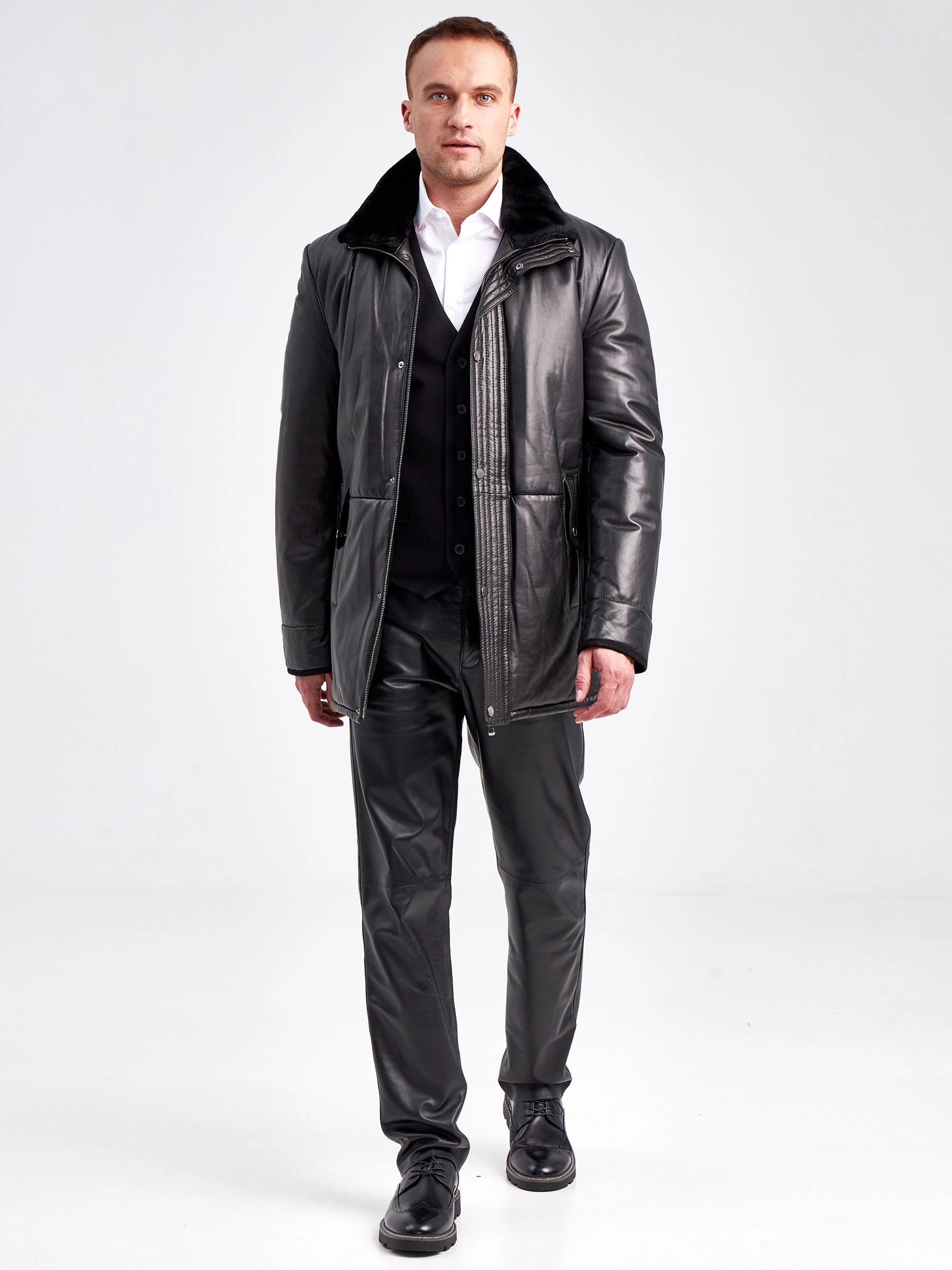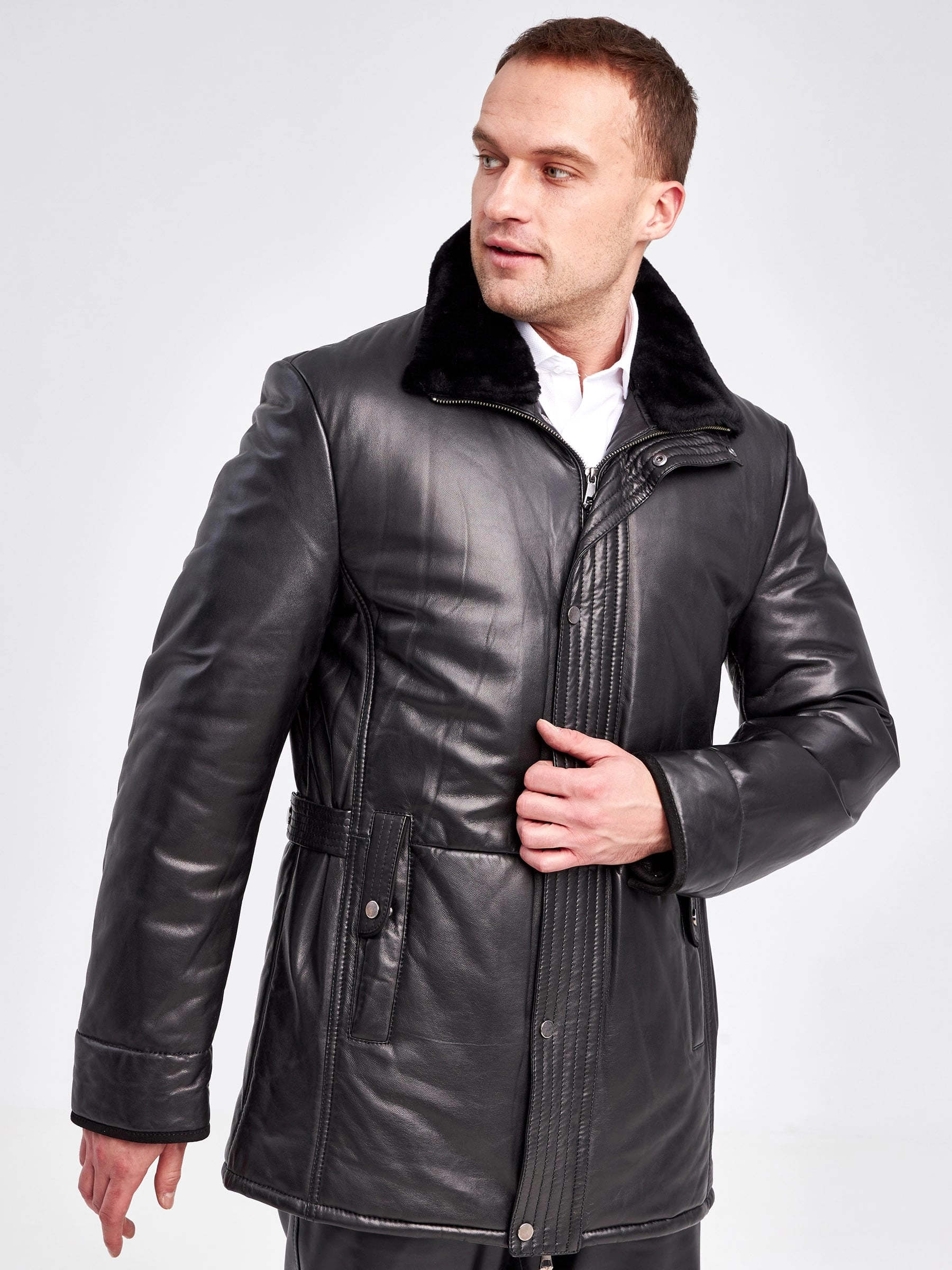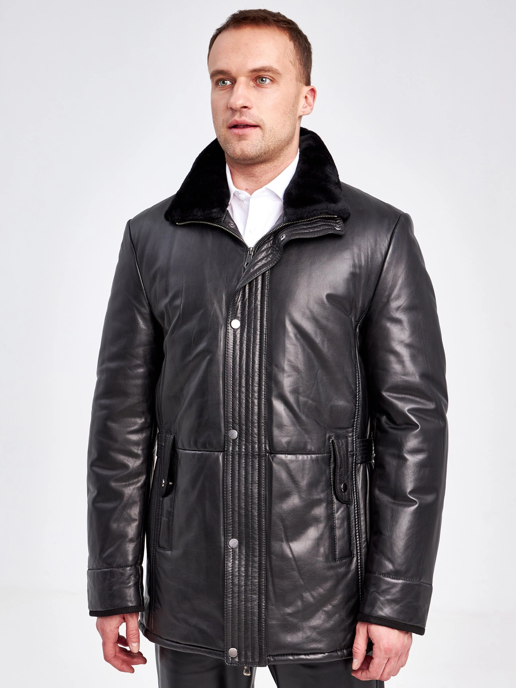 Товар кожаная зимняя мужская куртка с воротником из овчины 5723, черная, размер 46, артикул 40960 выполнен из натуральной кожи с застежкой молния. Рассчитан на сезон: осень-зима. Длина изделия 84 см, силуэт прямой.