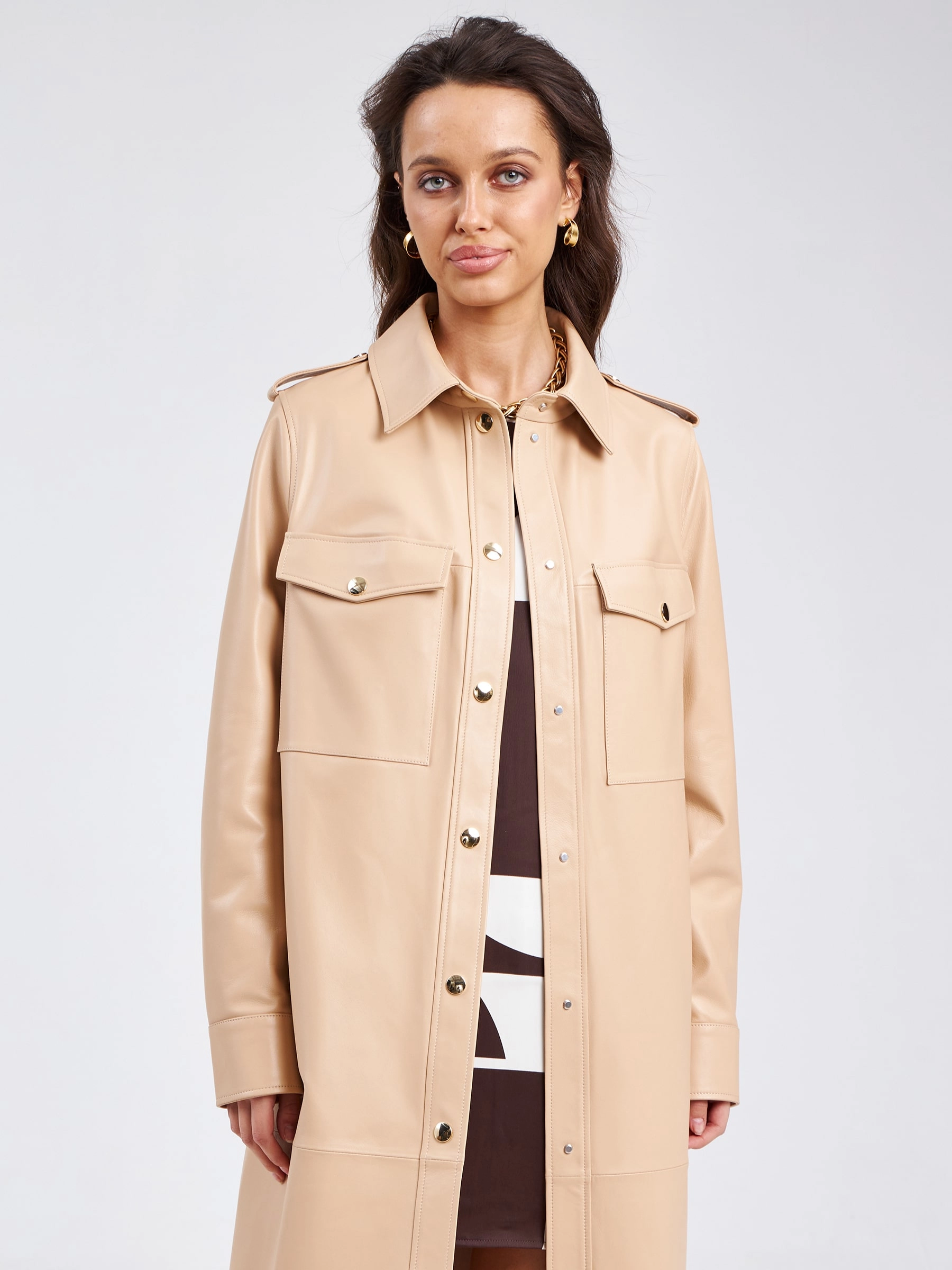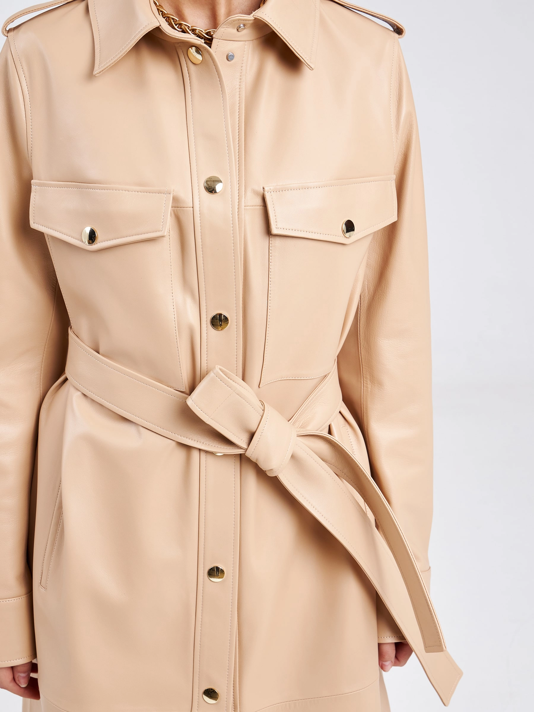 Товар кожаное женское платье рубашка из натуральной кожи премиум класса 03, бежевая, размер 44, артикул 23180 выполнен из натуральной кожи с застежкой кнопки. Рассчитан на сезон: весна-лето. Длина изделия 115 см, силуэт прямой.