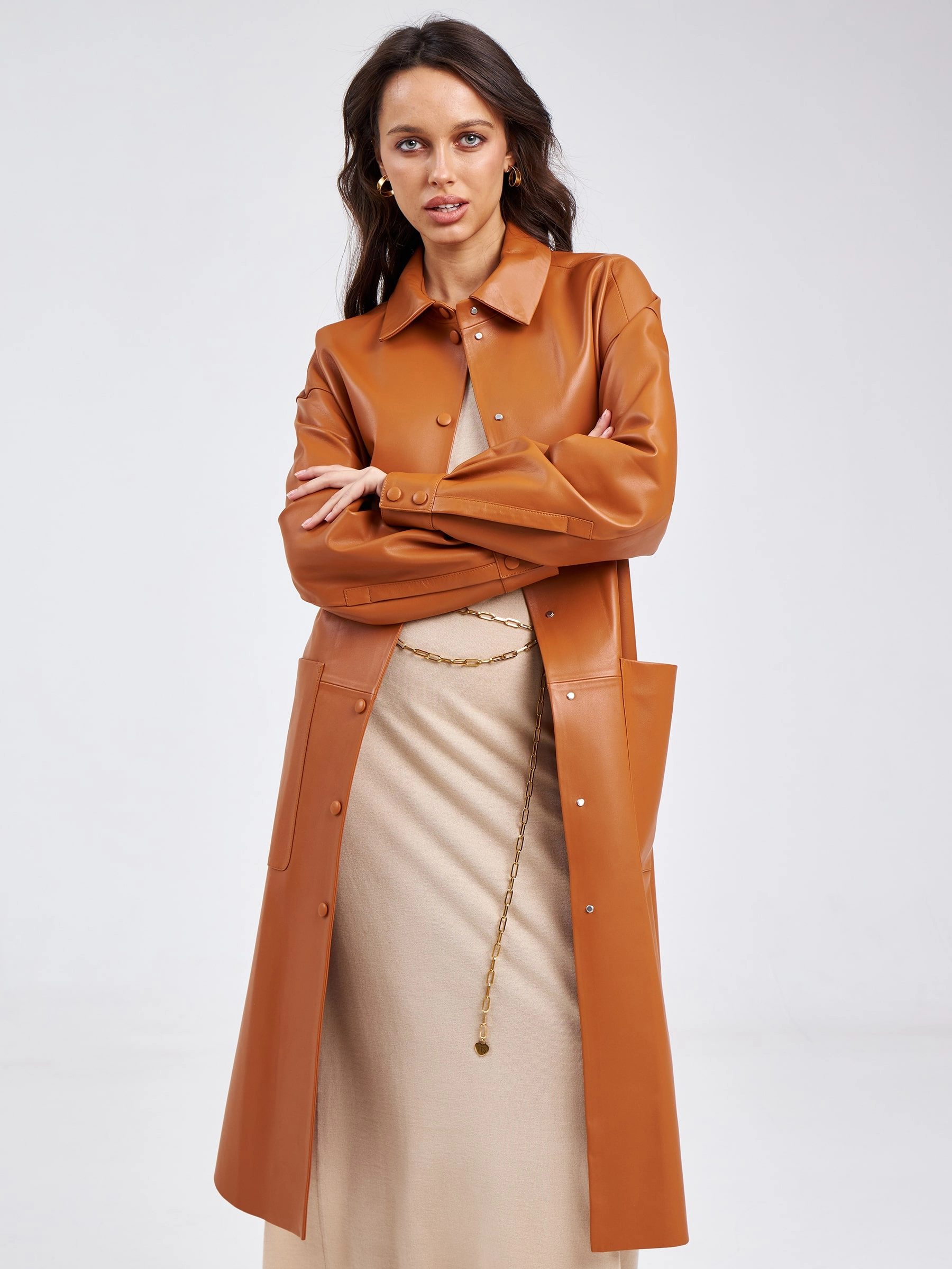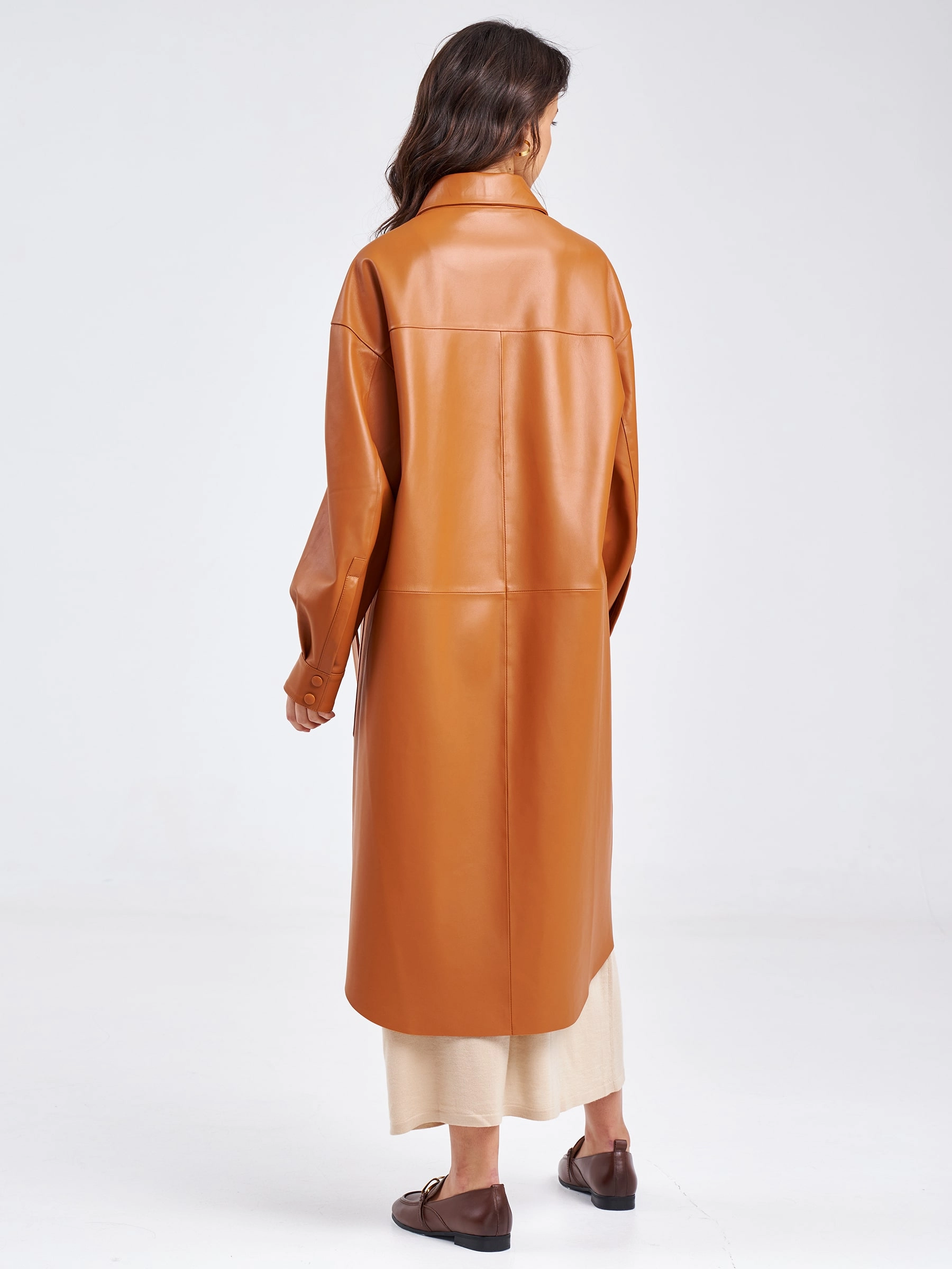 Повседневный весенний образ. Платье - рубашка прямого кроя с отложным воротником, двумя накладными карманами и поясом - лентой. Изделие выполнено из гладкой натуральной кожи премиум класса.