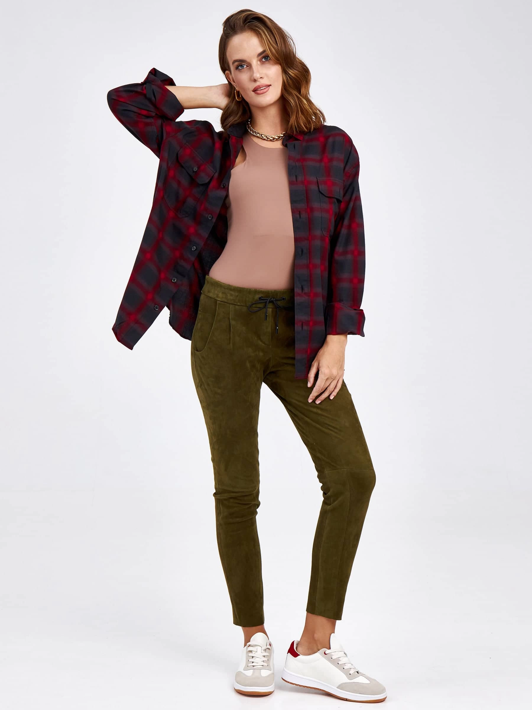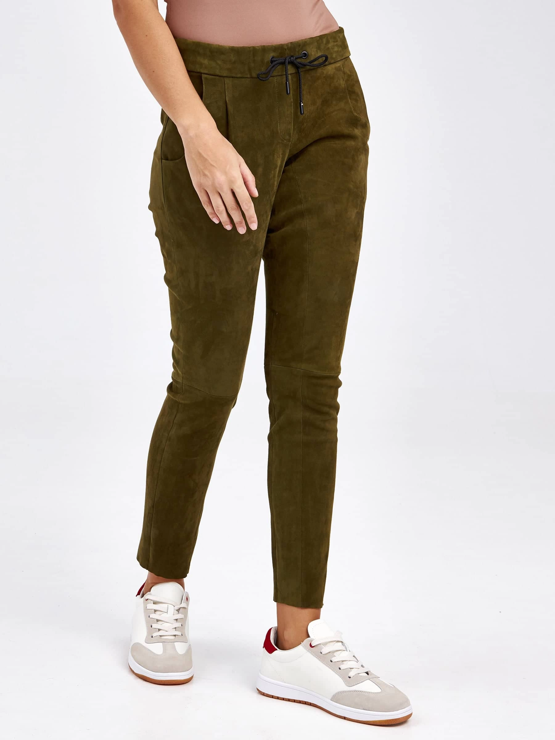 Товар кожаные женские брюки из натуральной замши 07_1, зеленые, размер 44, артикул 85620 выполнен из натуральной замши стрейч с застежкой резинка. Рассчитан на сезон: демисезон. Длина изделия свыше 90 см, силуэт облегающий.