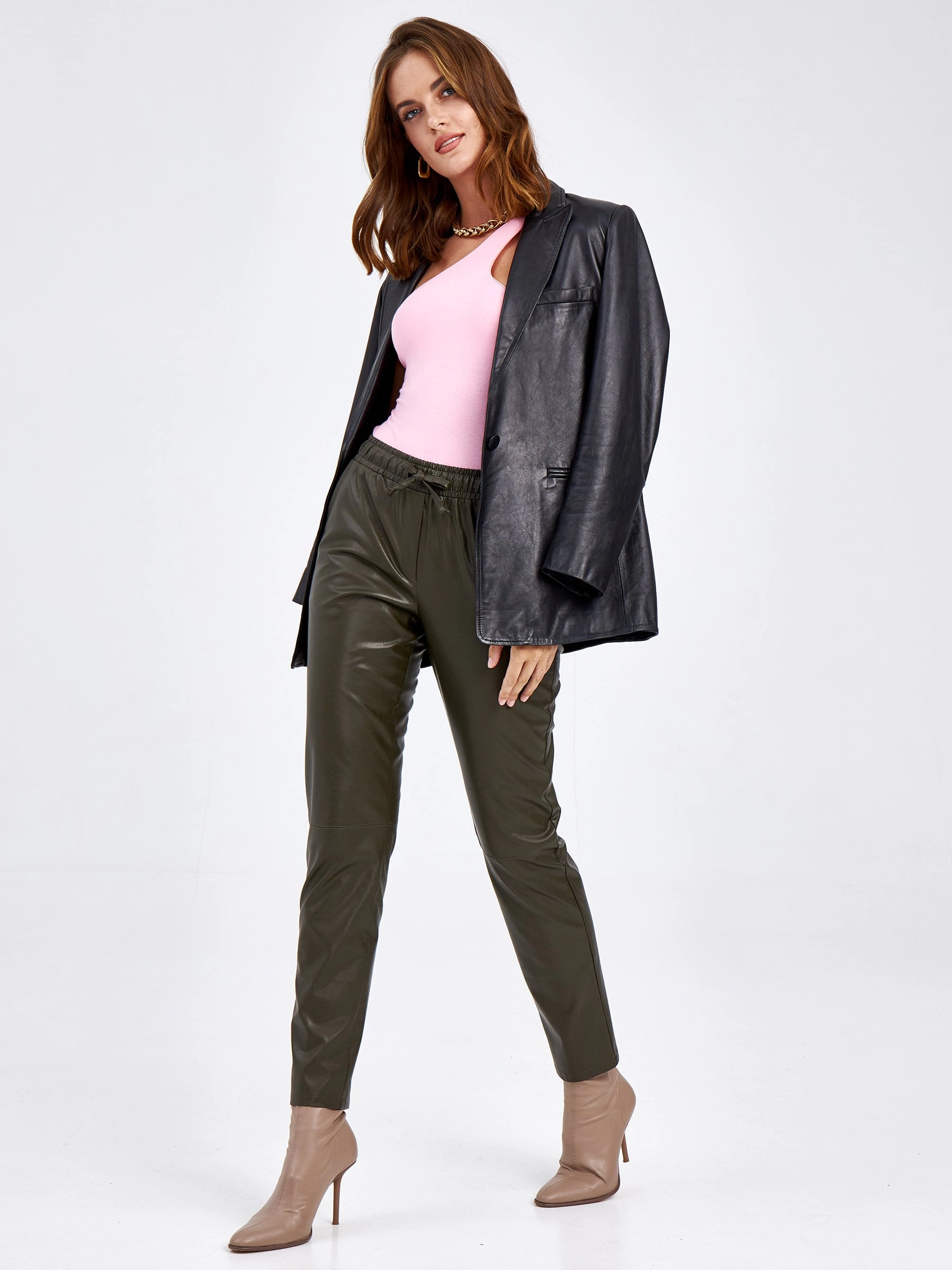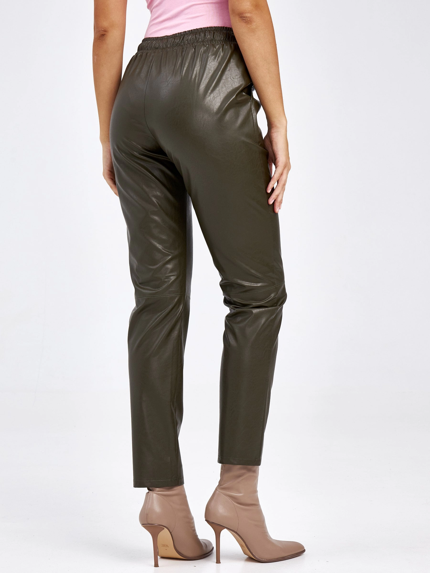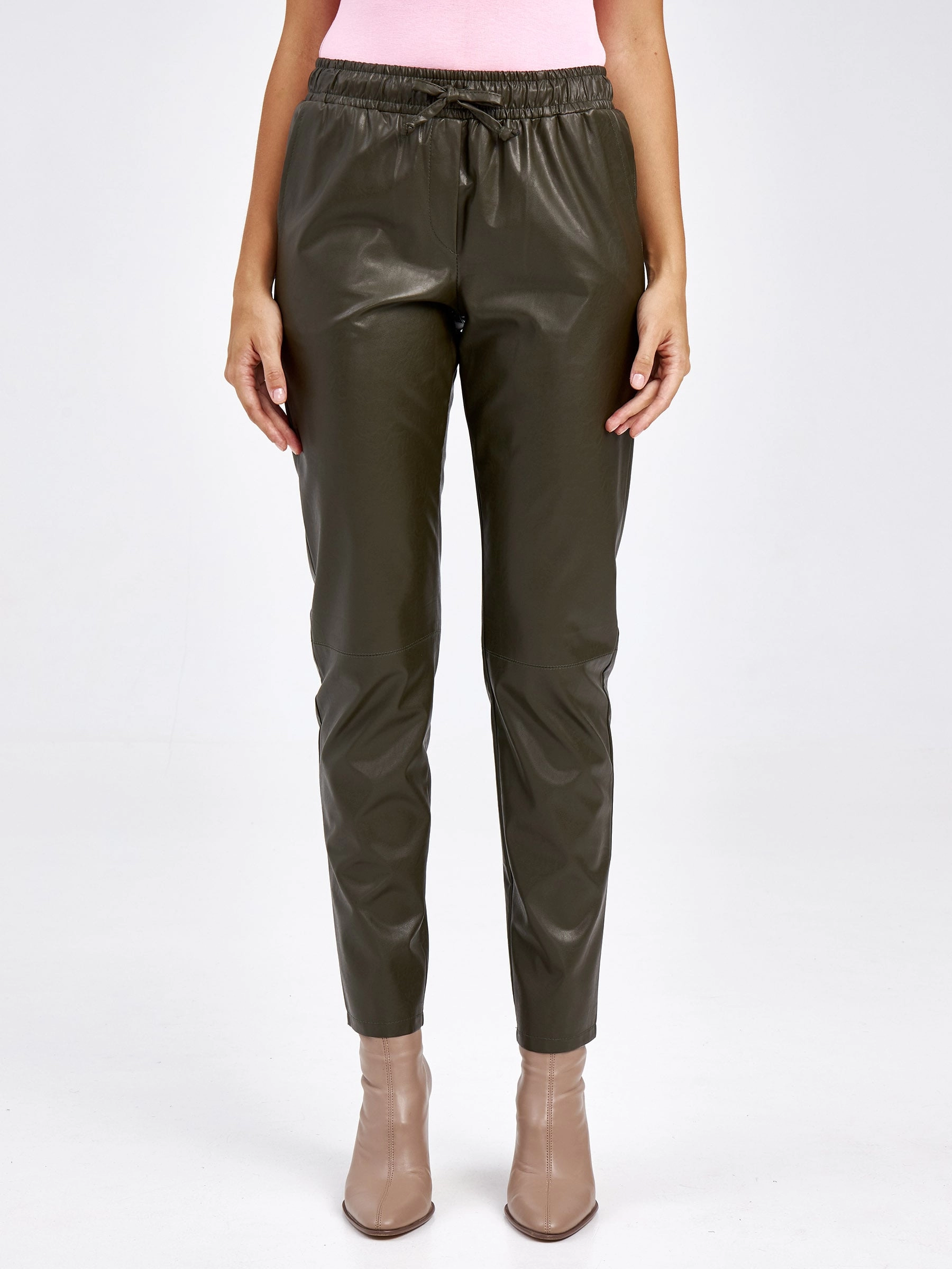 Товар женские кожаные брюки из экокожи 4616637, хаки, размер 44, артикул 85650 выполнен из экокожи с застежкой резинка. Рассчитан на сезон: демисезон. Длина изделия свыше 90 см, силуэт свободный.