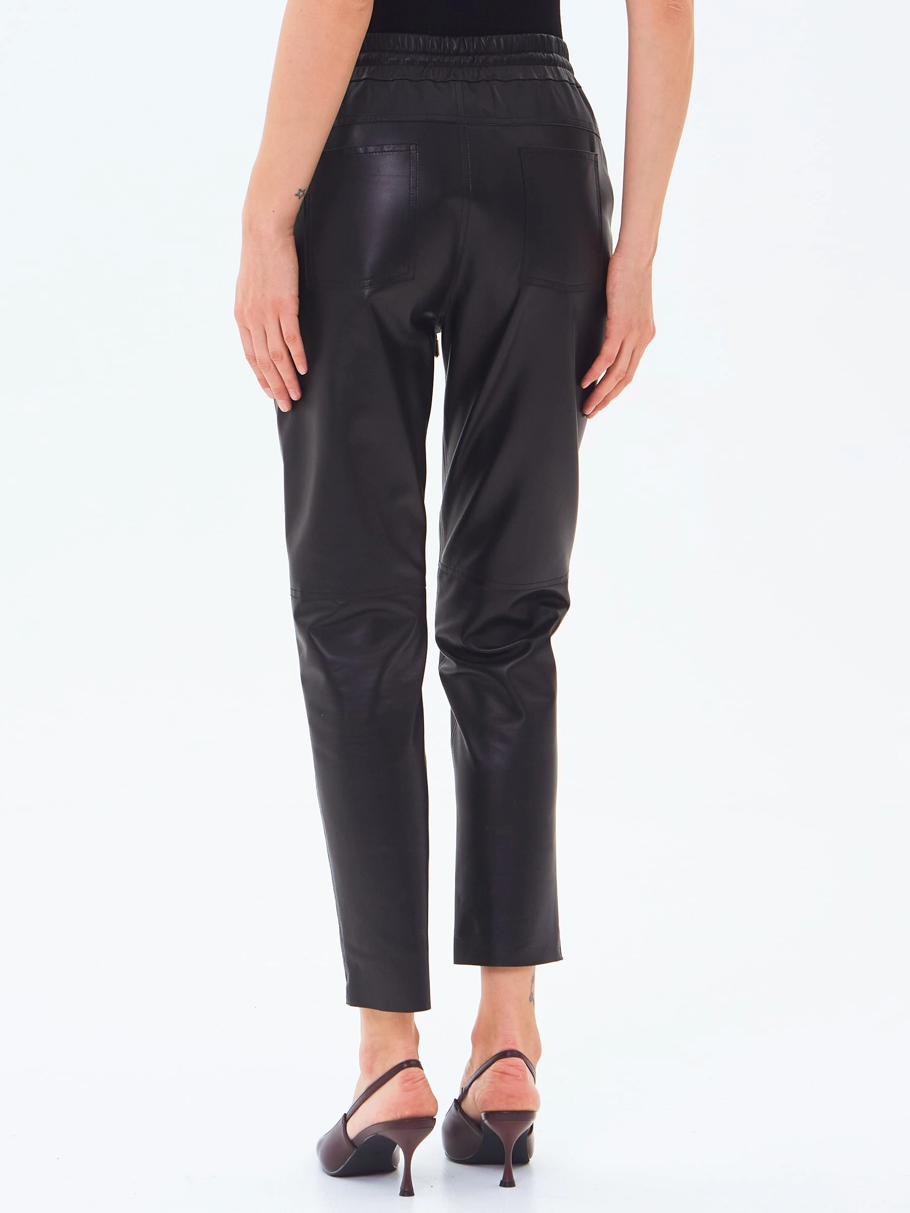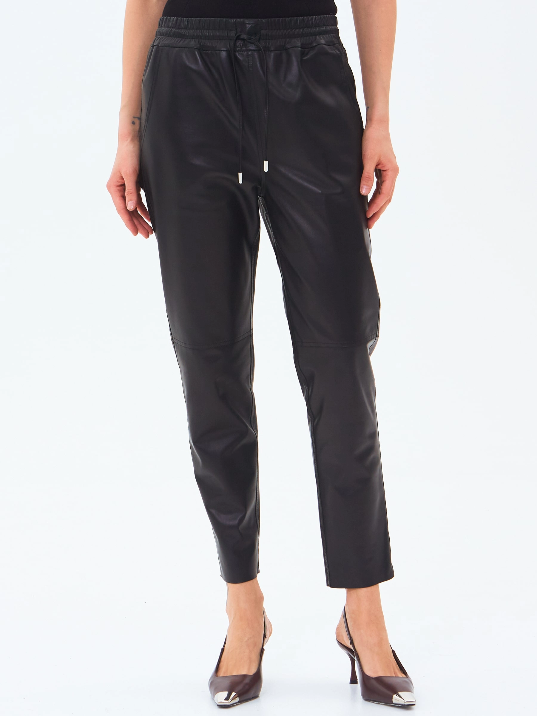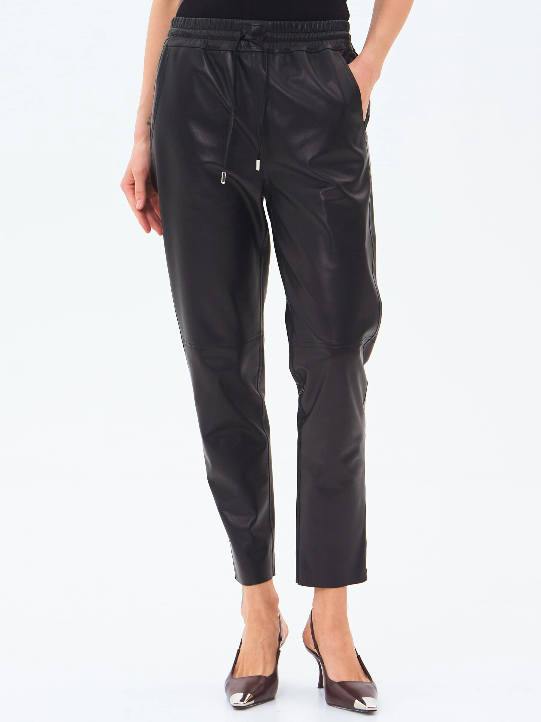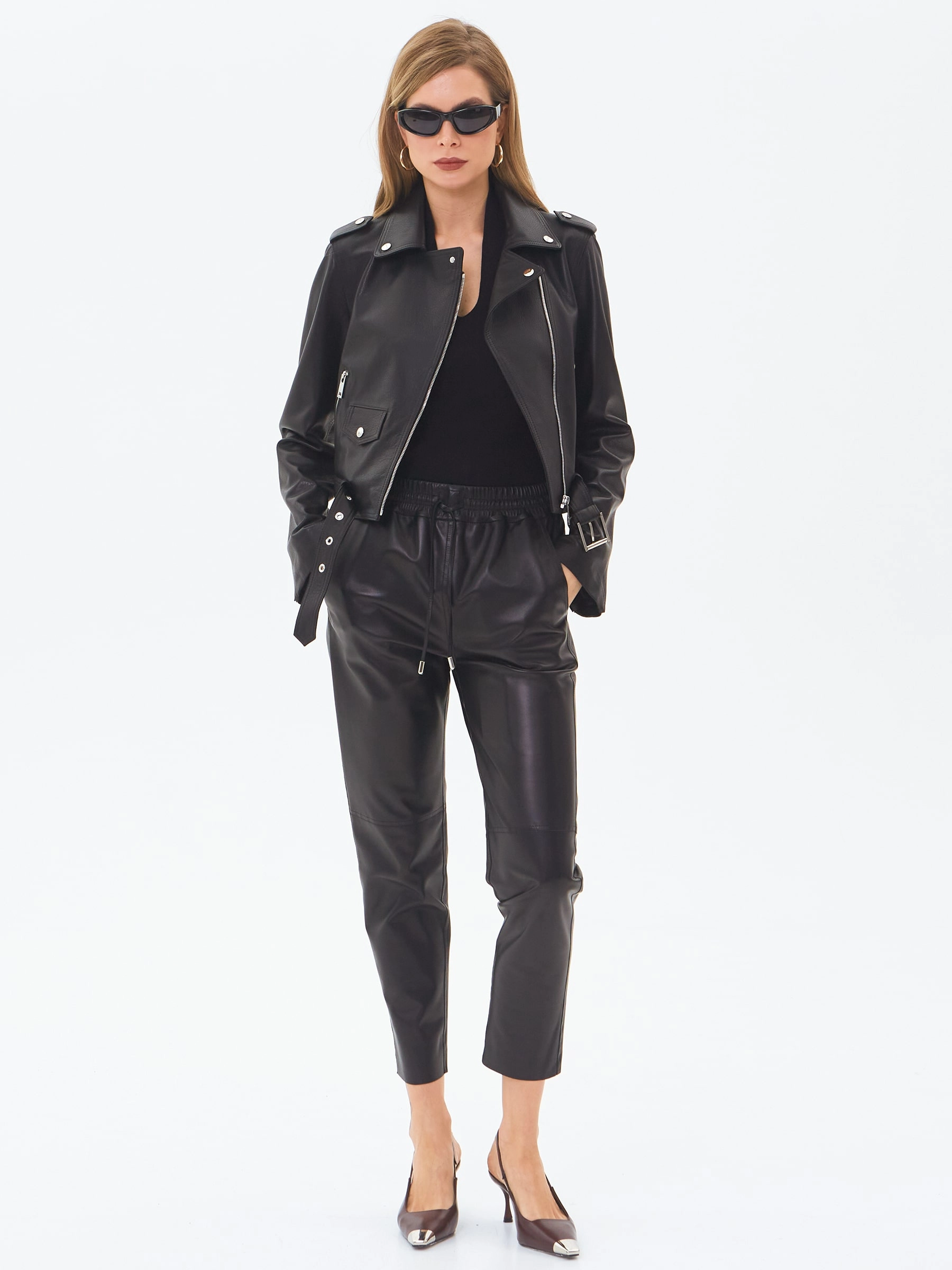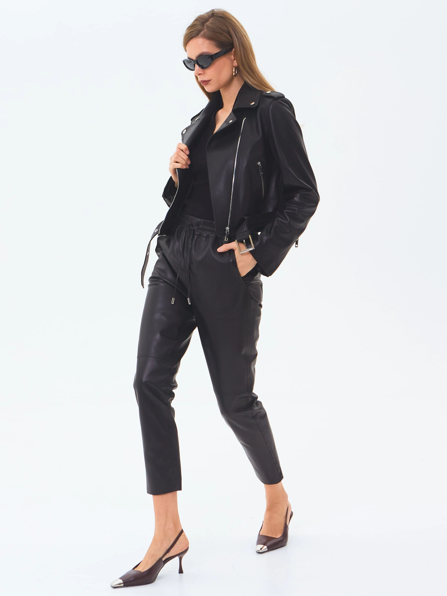Прямые брюки с двумя врезными и парой накладных карманов выполнили из тонкой кожи премиум класса. Посадка модели по талии регулируется кулисками