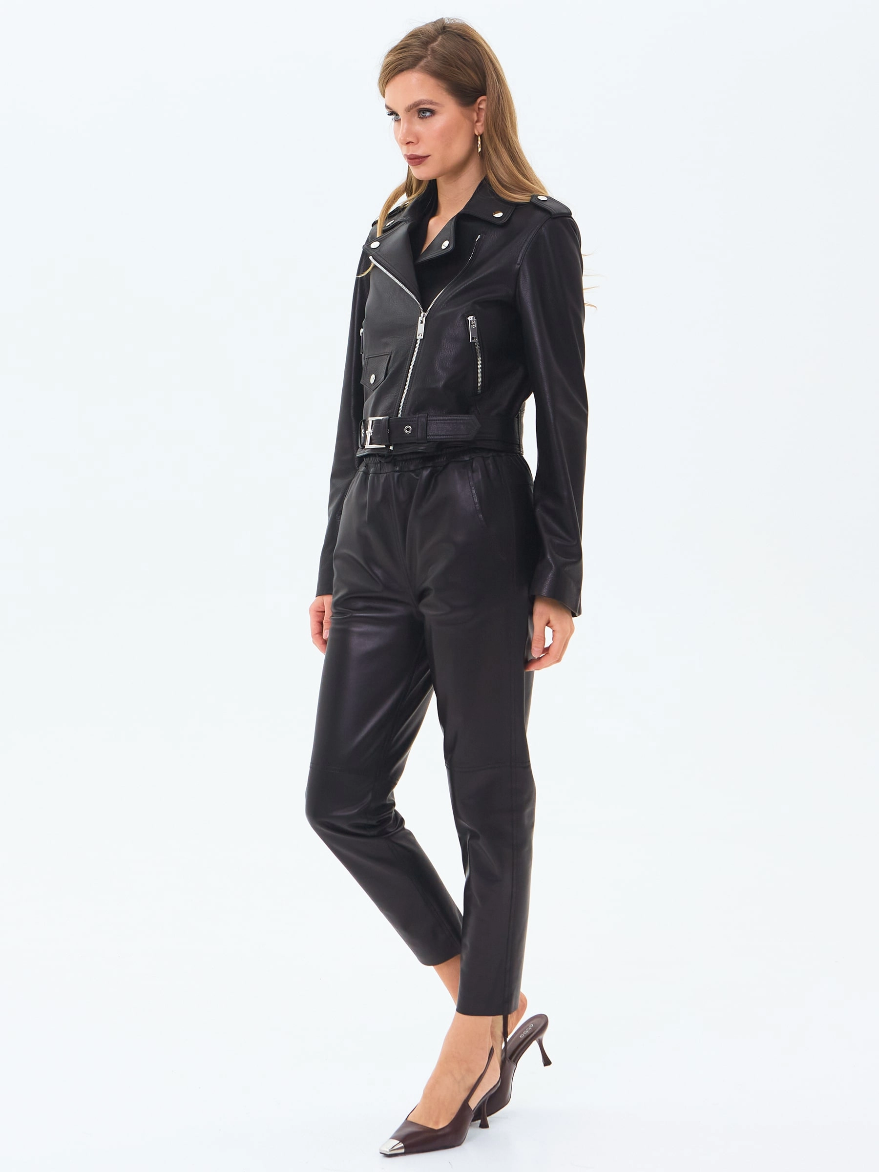 Кожаные прямые женские брюки из натуральной кожи 09, черные, размер 44, артикул 86010