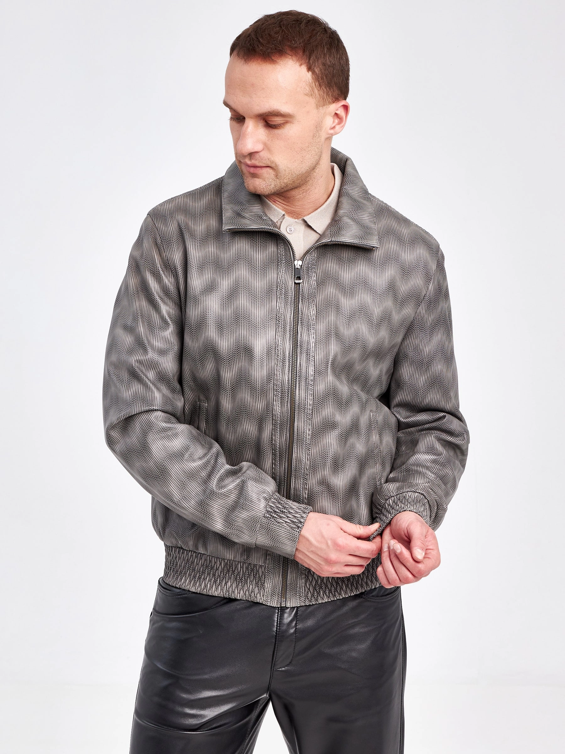 Кожаная куртка бомбер мужская Snake, серая, размер 52, артикул 29500
