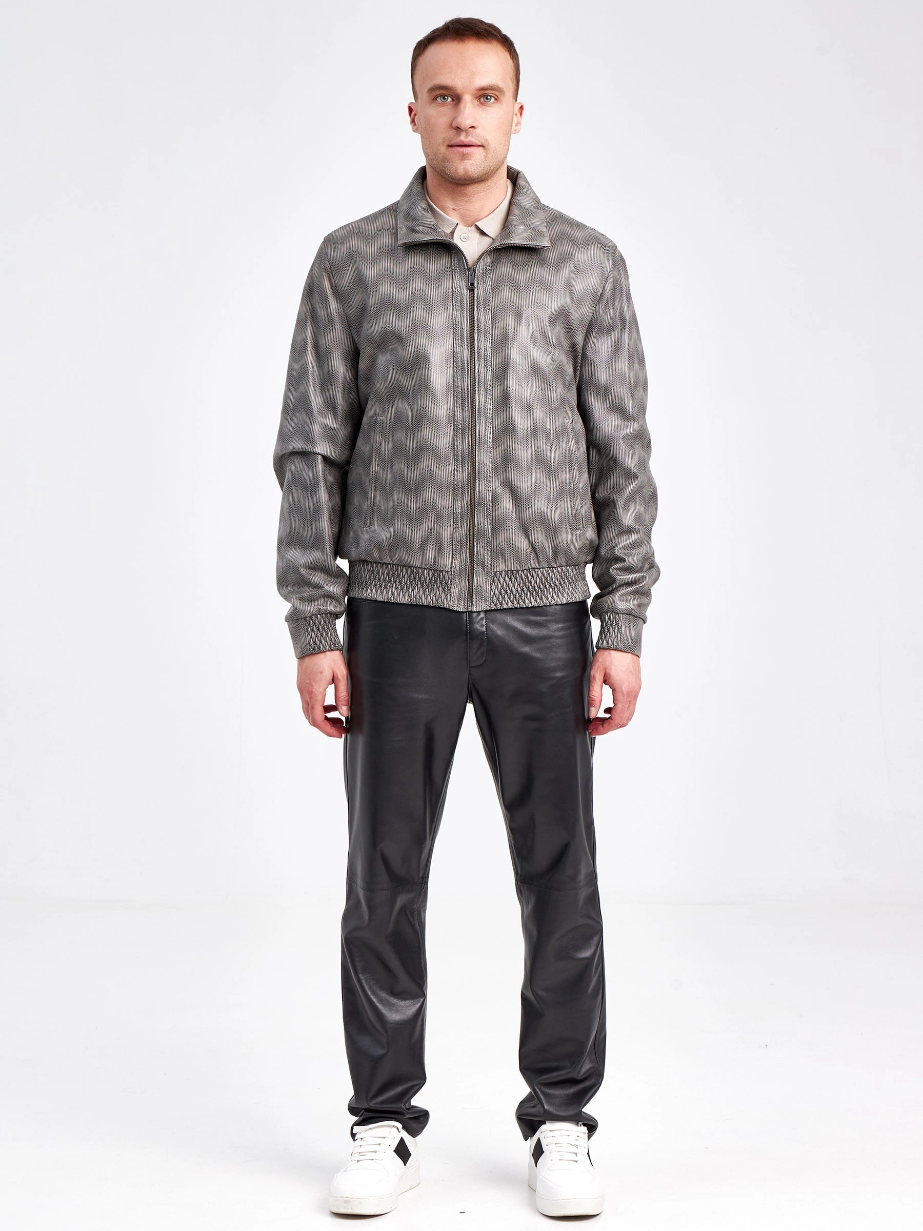 Товар кожаная куртка бомбер мужская snake, серая, размер 52, артикул 29500 выполнен из натуральной кожи с застежкой молния. Рассчитан на сезон: весна-осень. Длина изделия 67 см, силуэт свободный.