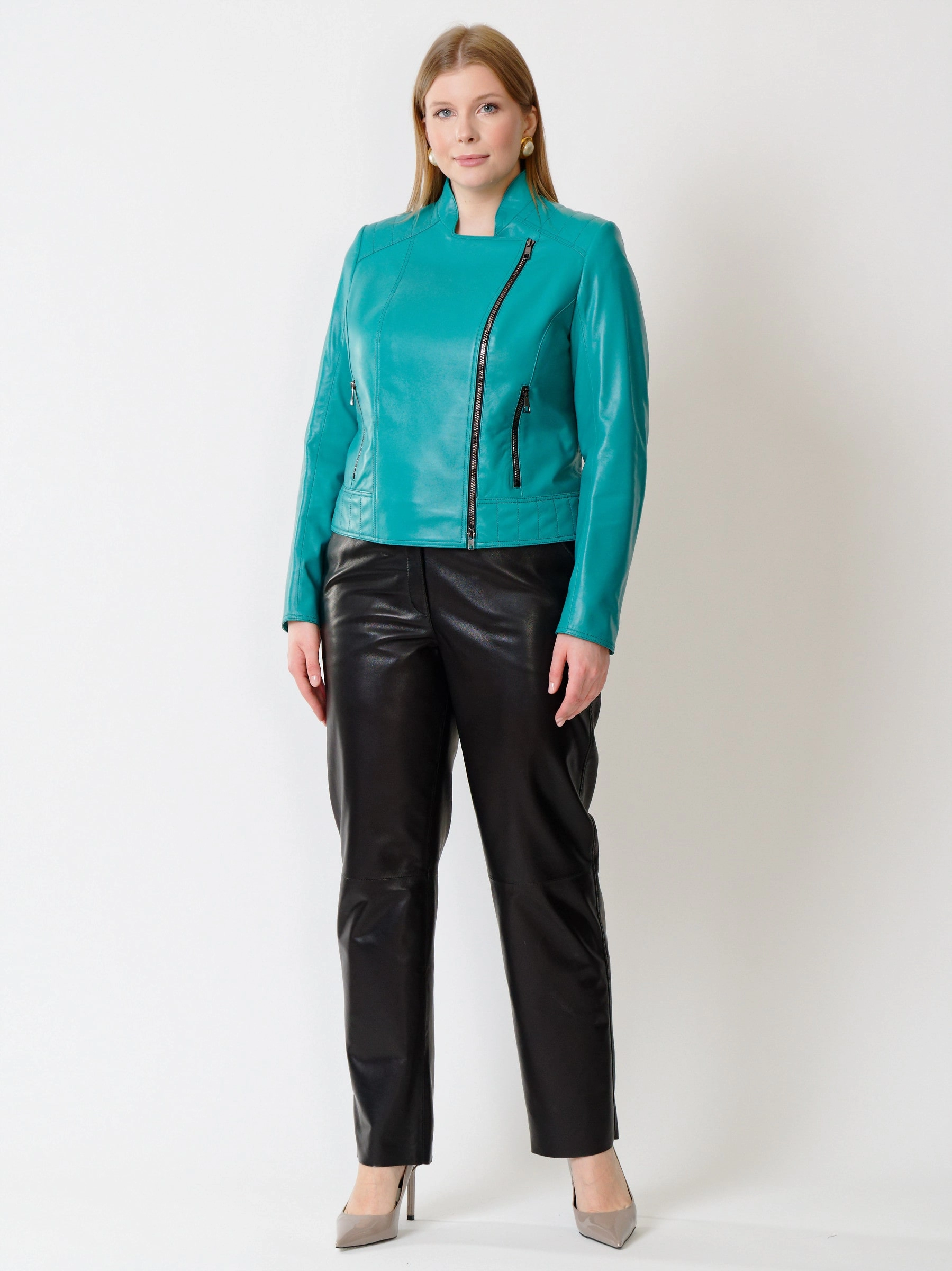 Кожаный комплект женский: Куртка 300 + Брюки 04, бирюзовый/черный, р. 44, арт. 111181
