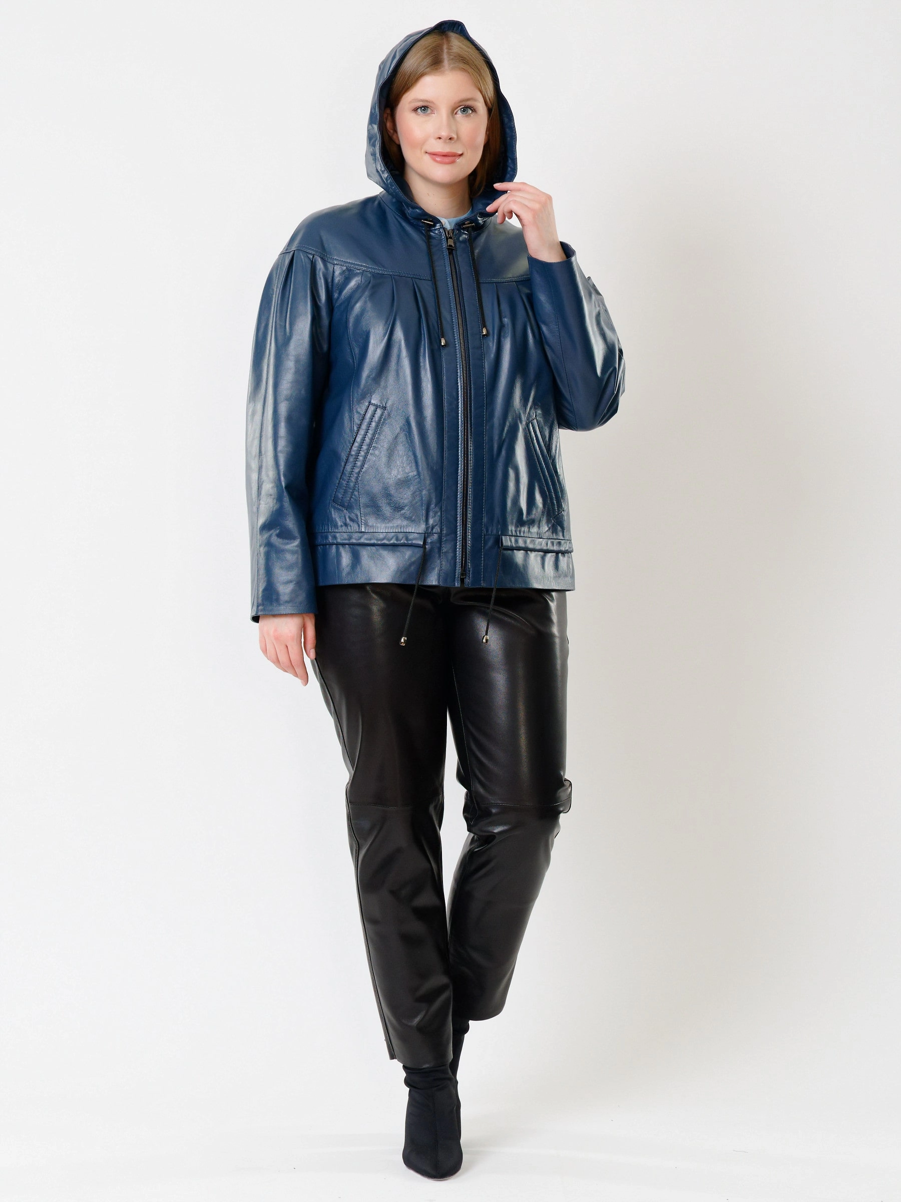Объёмная кожаная куртка свободного кроя с капюшоном в тандеме с брюками. Ничего лишнего. Всё очень удобно, функционально и качественно. Безупречная работа наших портных. Комфортная посадка по фигуре.