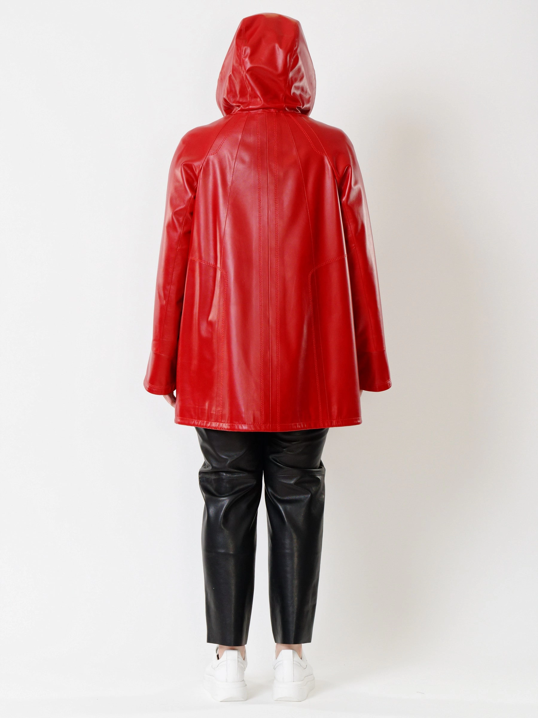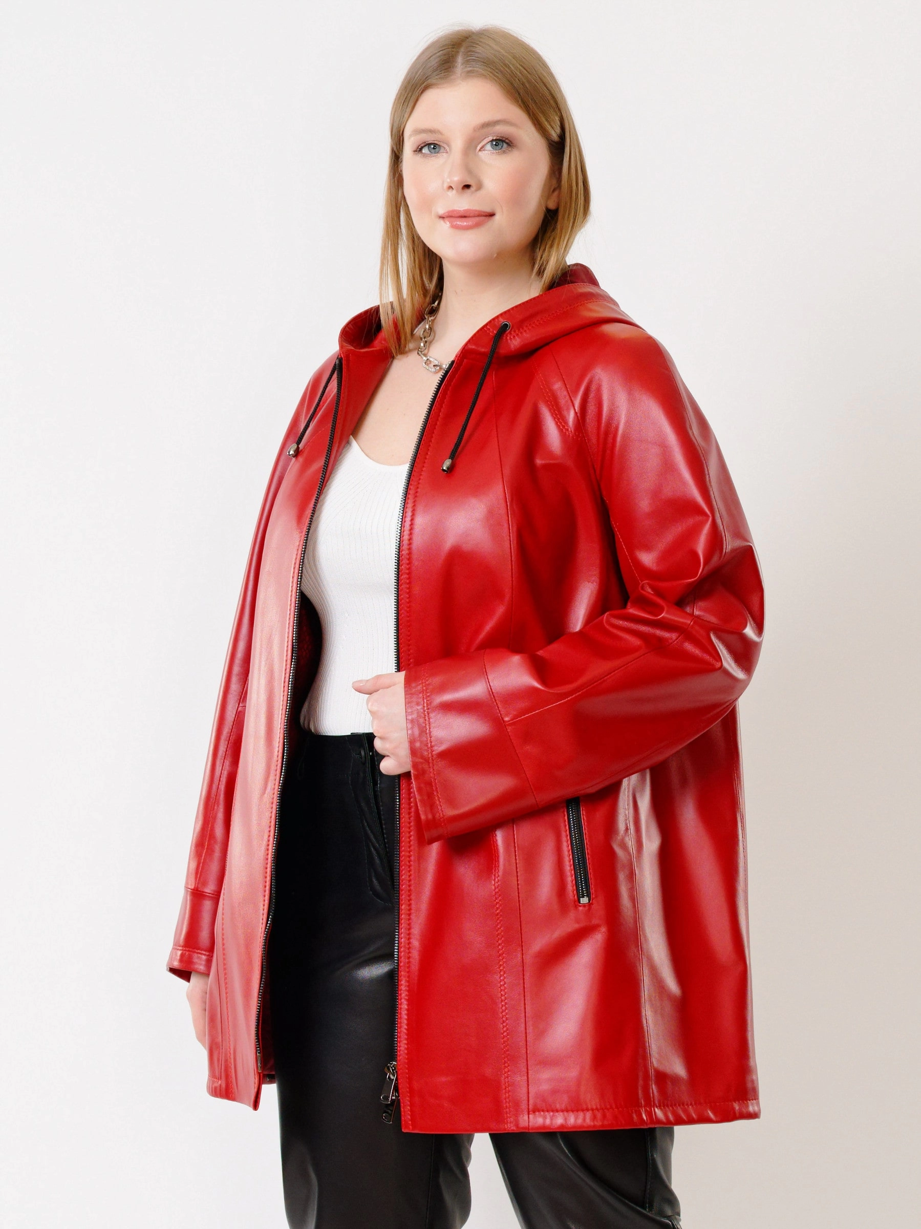 Кожаная куртка яркого бирюзового цвета и чёрные кожаные брюки. Свободный крой не будет сковывать движения, а удобный капюшон обеспечит дополнительную защиту от ветра. Премиальное качество материалов. Ювелирная работа наших портных. Стильный современный образ.