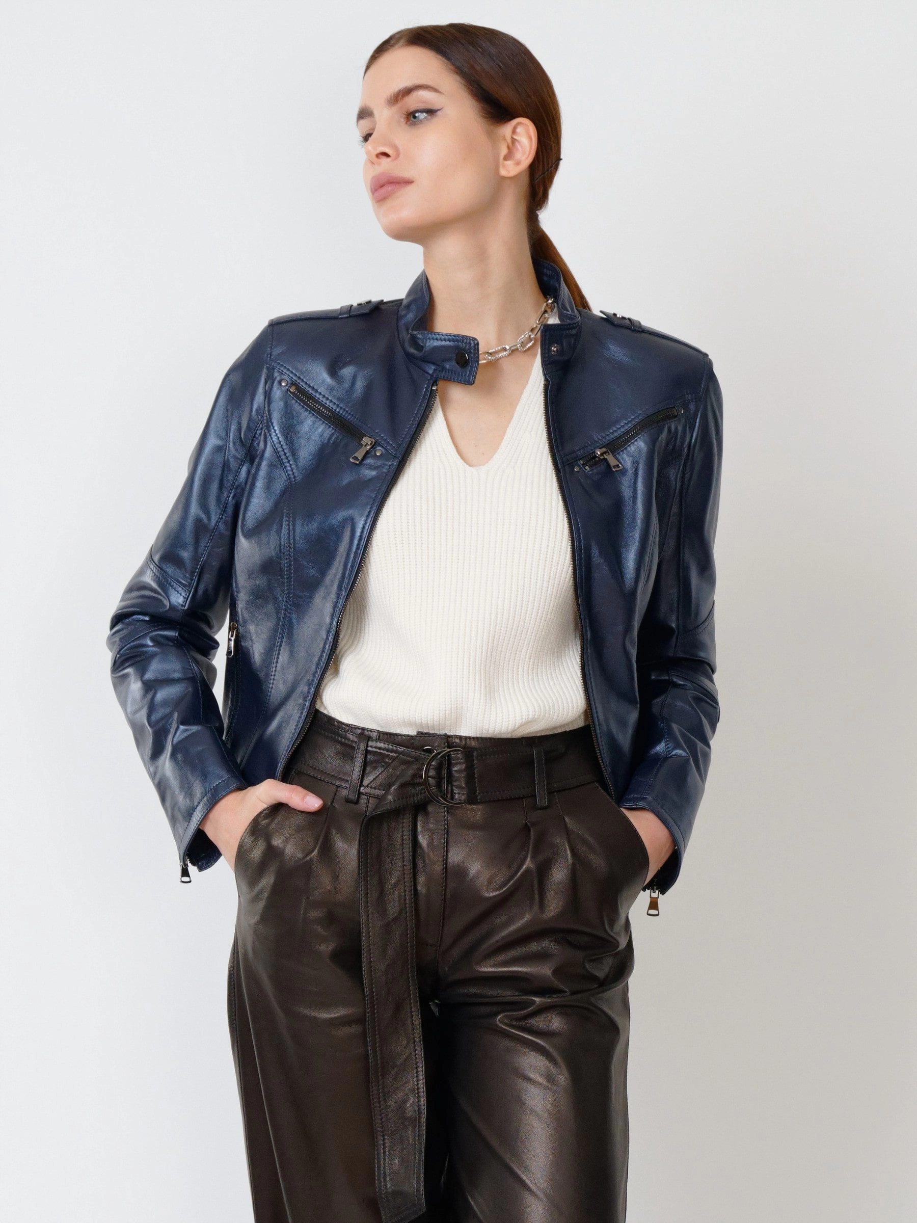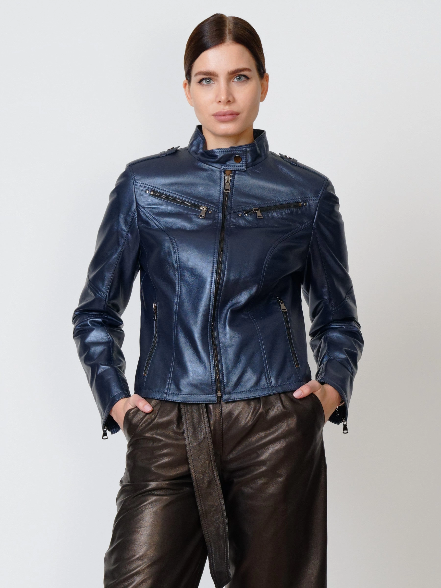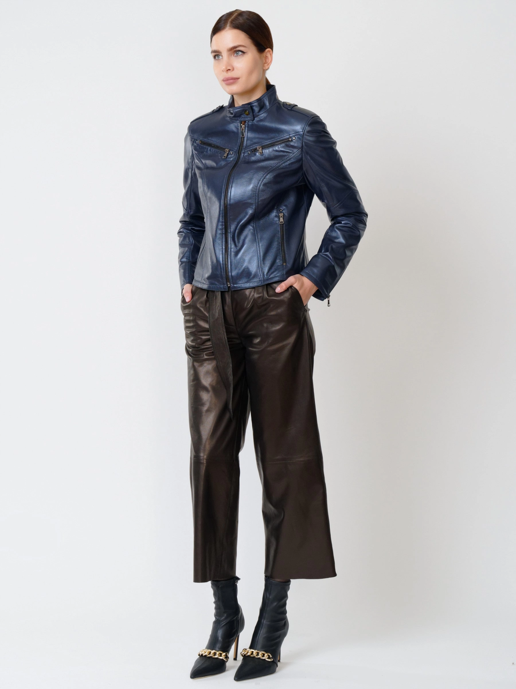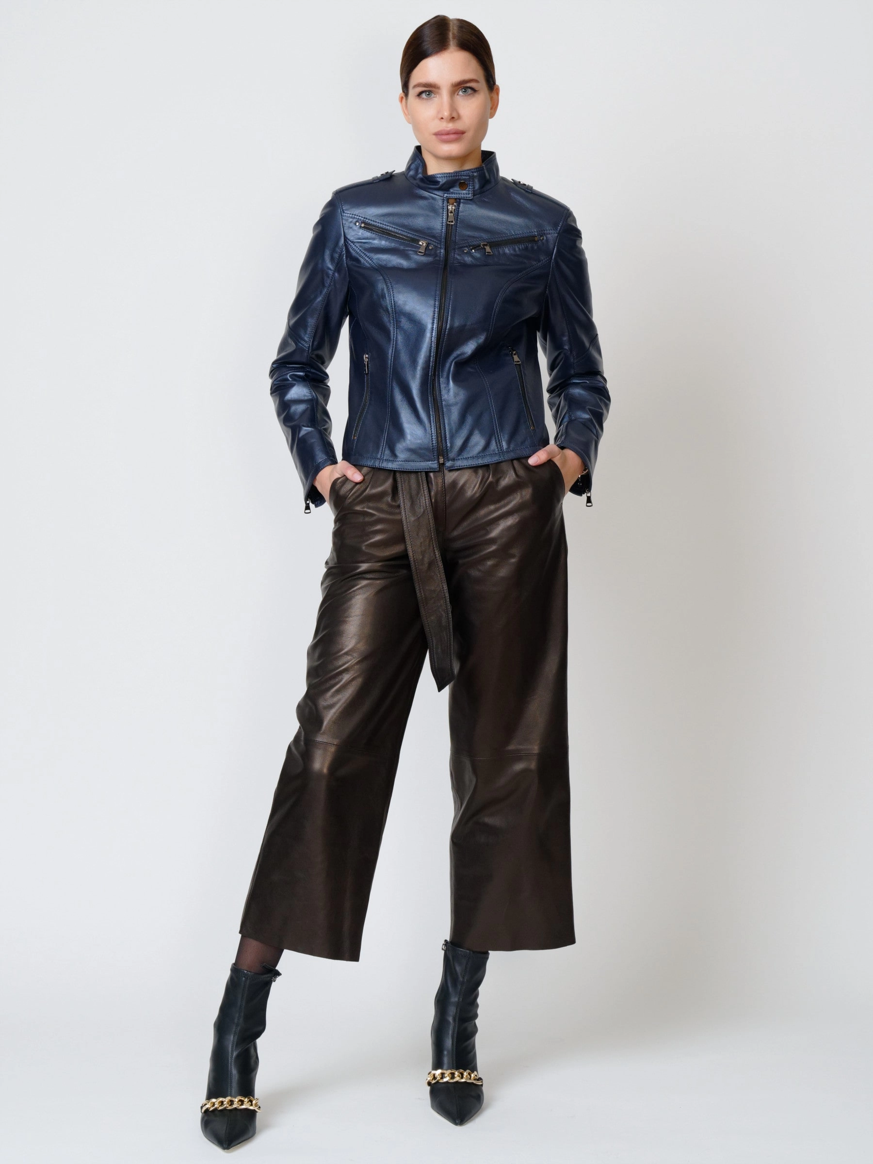 Стильная куртка глубокого синего цвета с перламутровым отливом и широкие кожаные брюки. Натуральной кожа премиального уровня. Ювелирная работа наших портных. Безупречная посадка по фигуре.