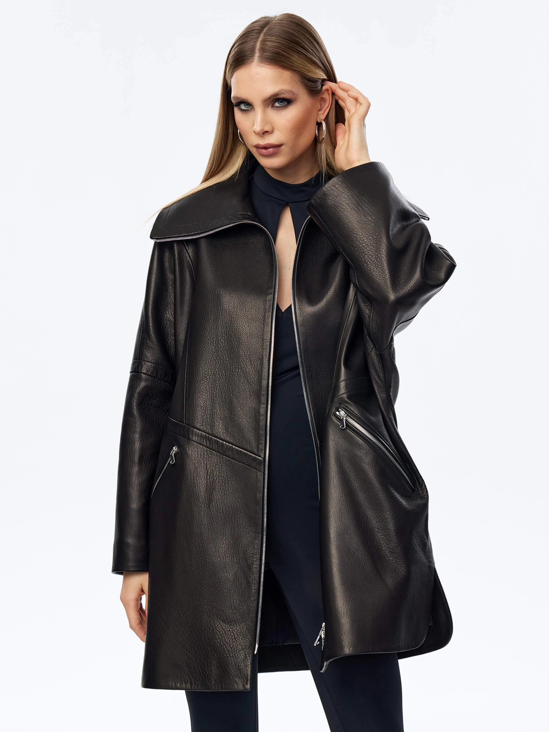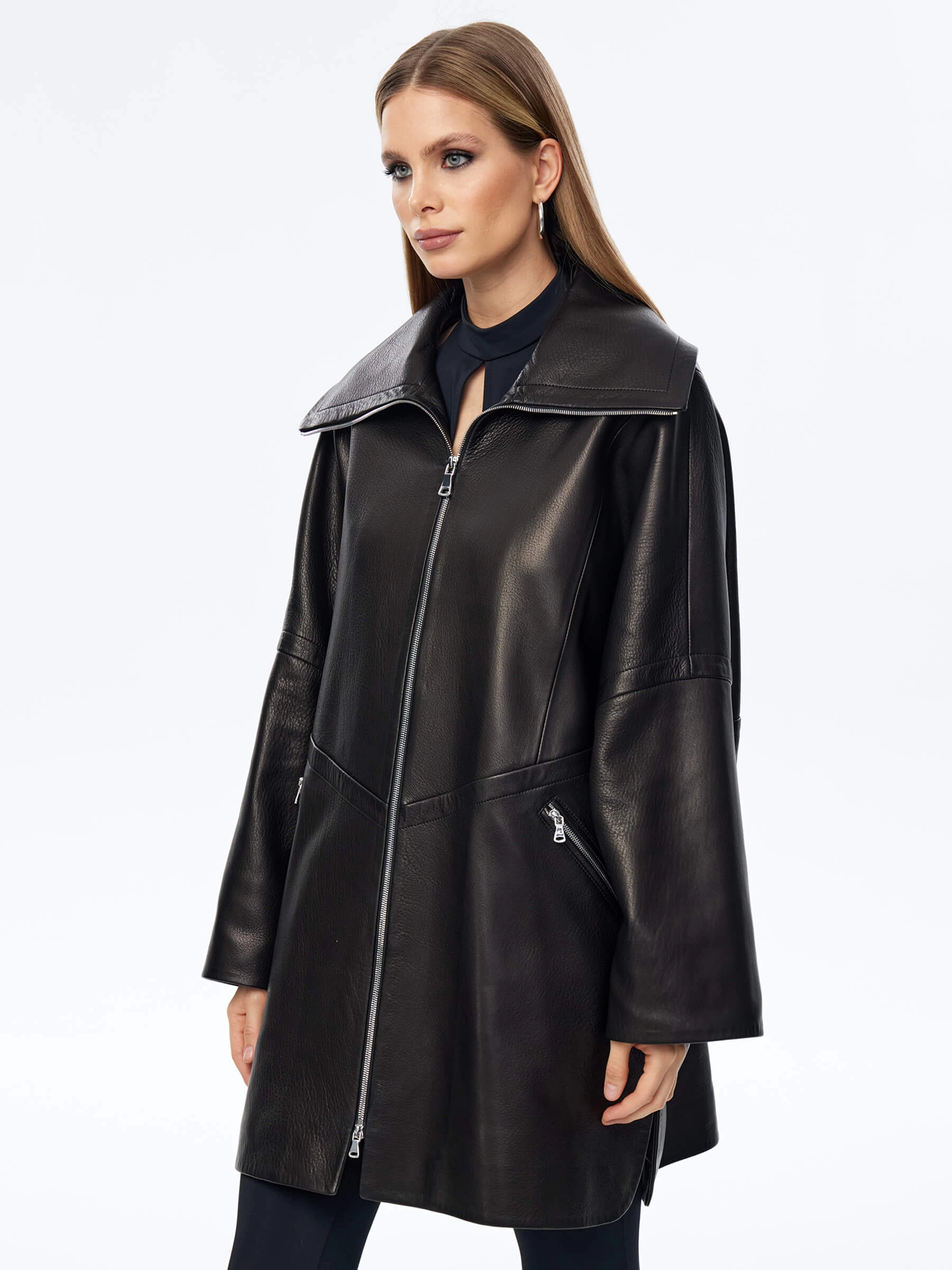 Этот плащ мастера выполнили для дам, которые привыкли ценить стиль и комфорт в одежде. Для пошива модели, застегивающейся встречной молнией, использовали фактурную мягкую кожу премиум класса. Свободный крой изделия удобно садится по фигуре, рукав регулируется широким манжетом. Воротник-стойка станет надежной защитой в ветренную погоду. Для большей свободы движения предусмотрены боковые разрезы.
