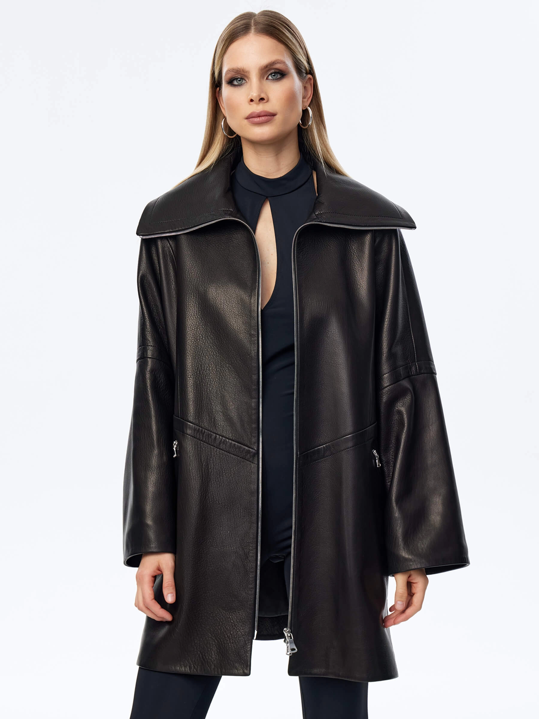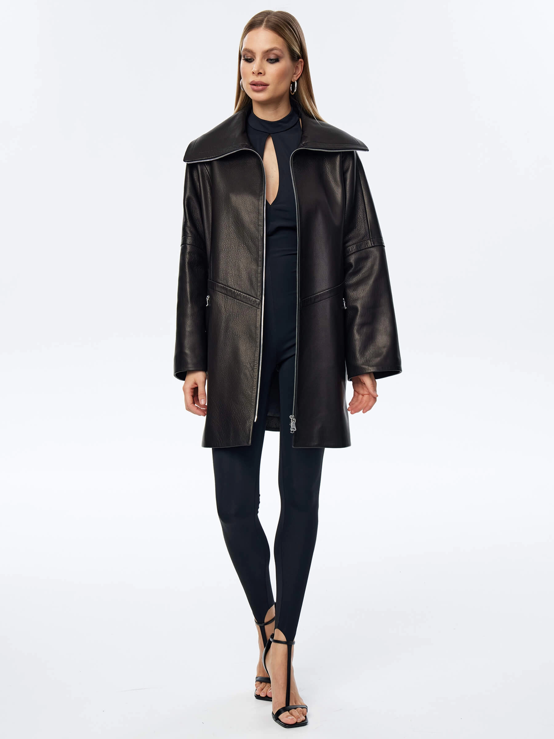 Товар кожаный плащ оверсайз на молнии для женщин премиум класса 3057, черный, размер 52, артикул 23520 выполнен из натуральной кожи с застежкой молния. Рассчитан на сезон: весна-осень. Длина изделия 87 см, силуэт оверсайз.