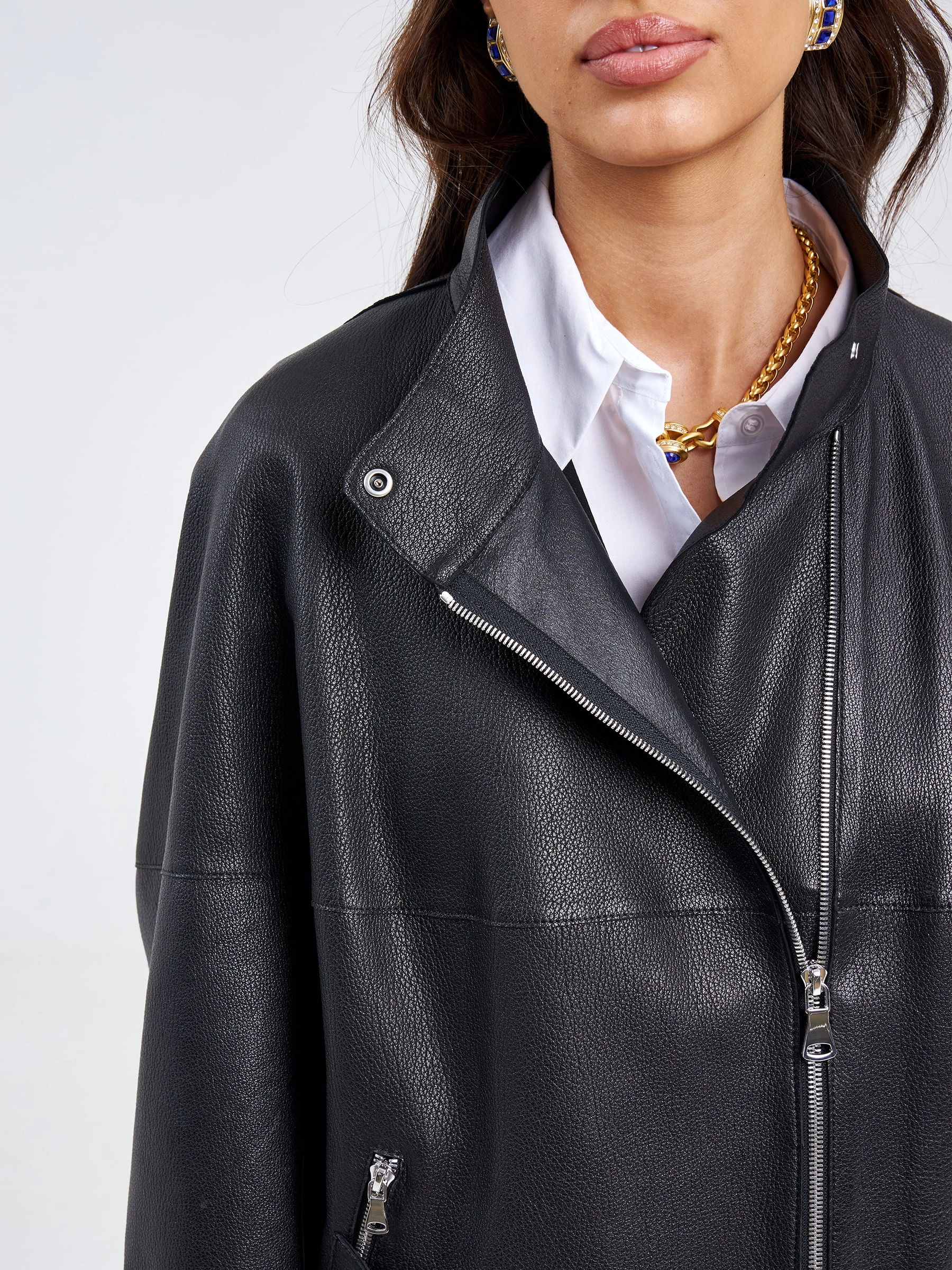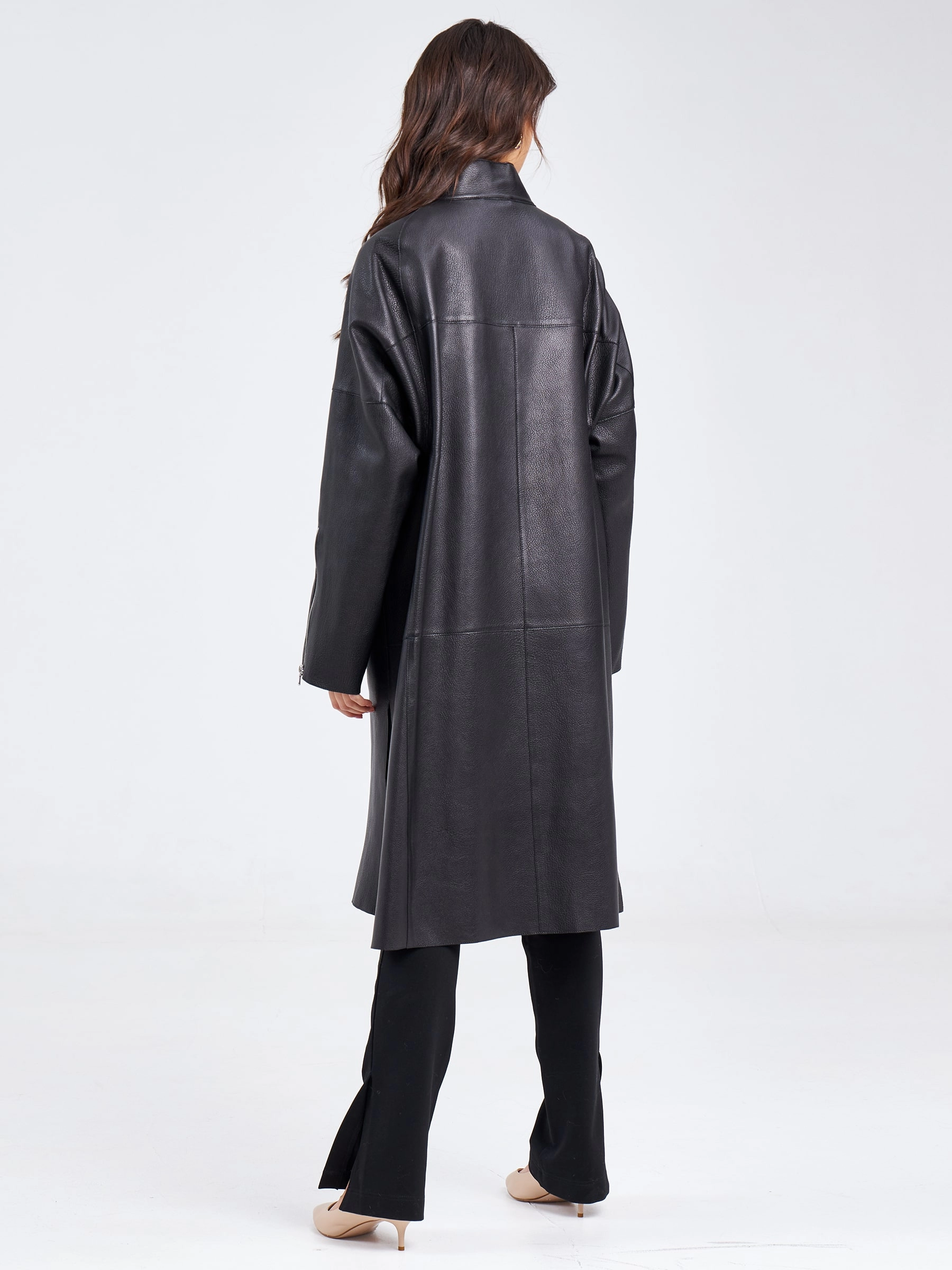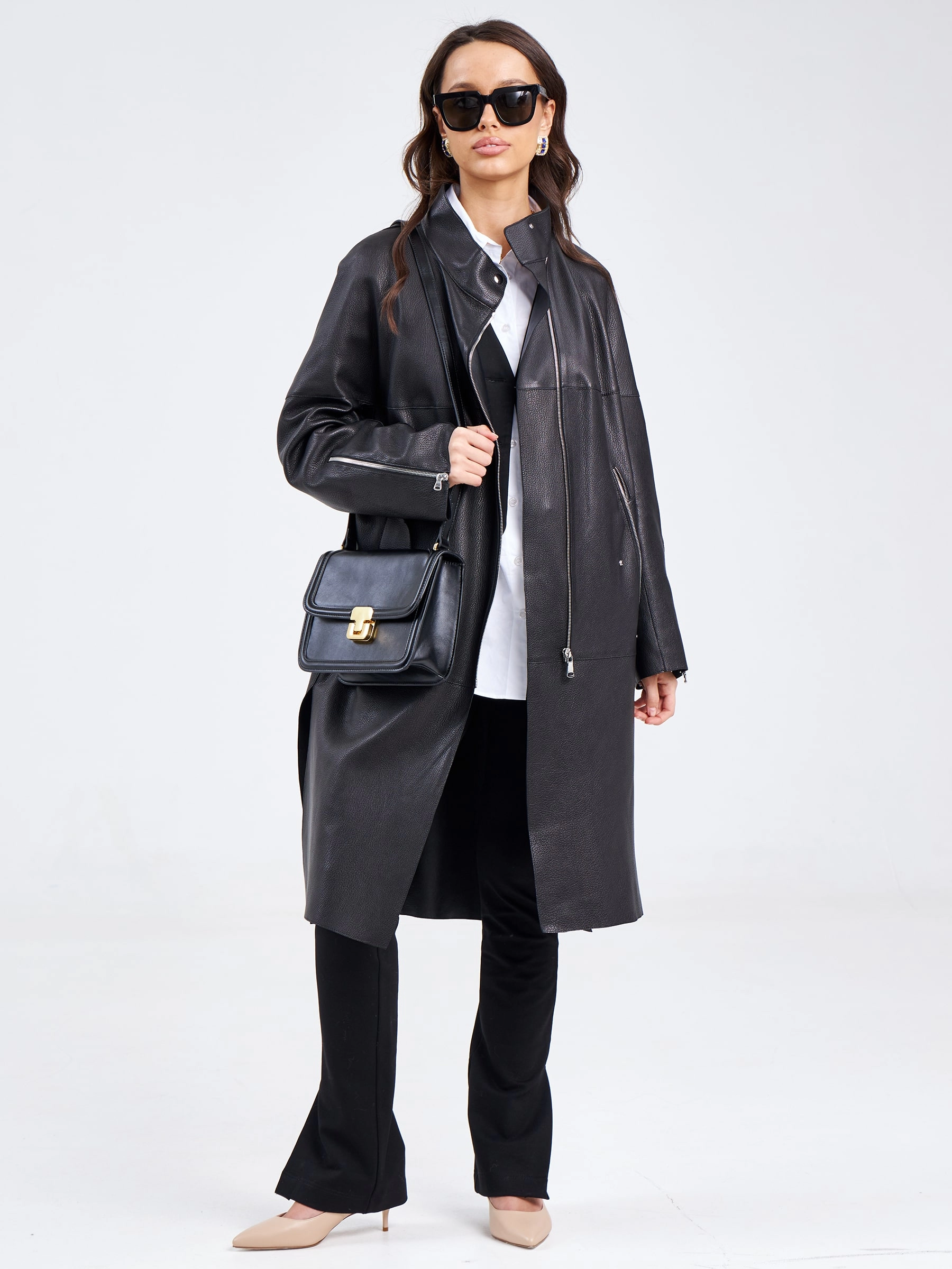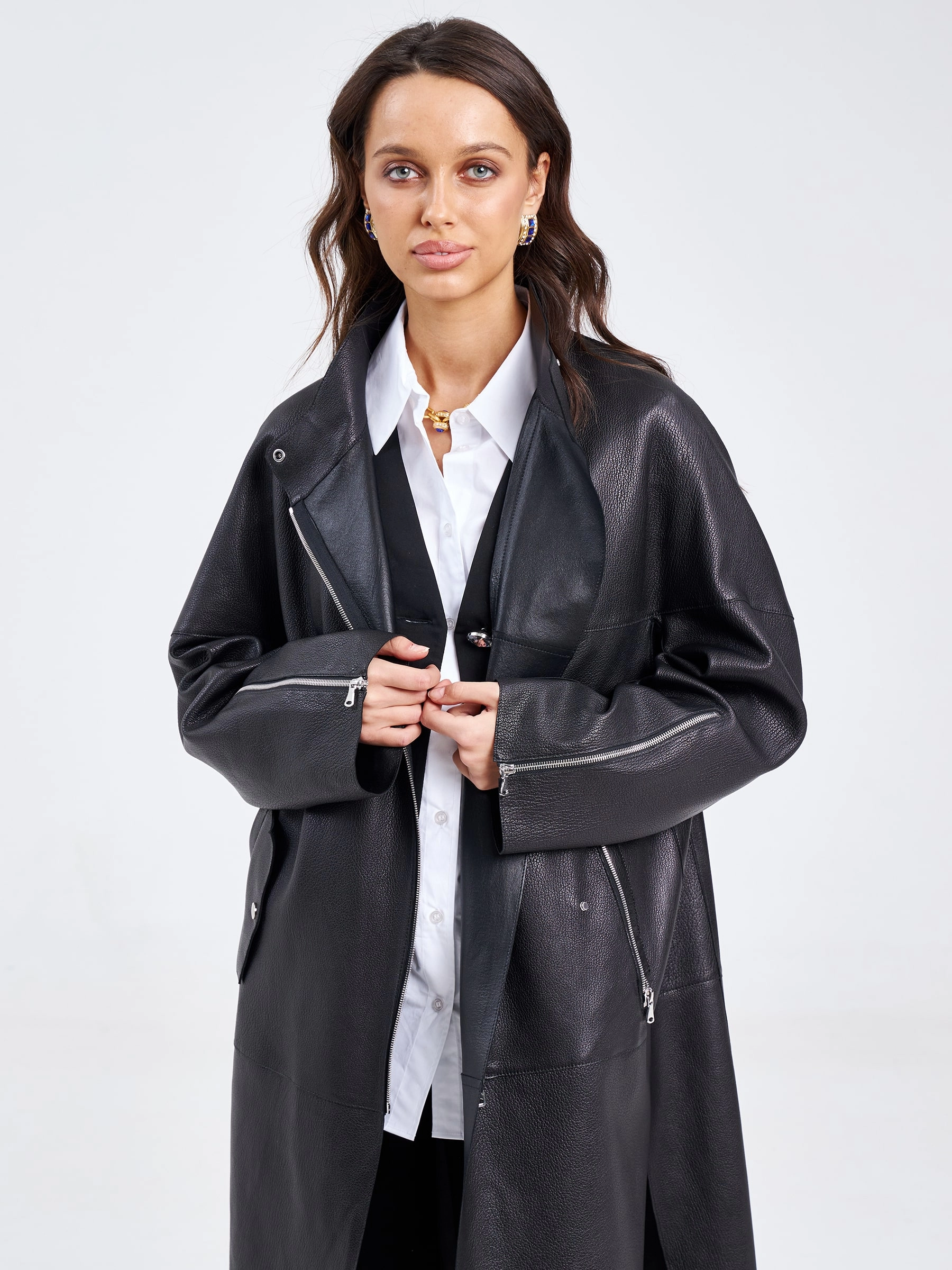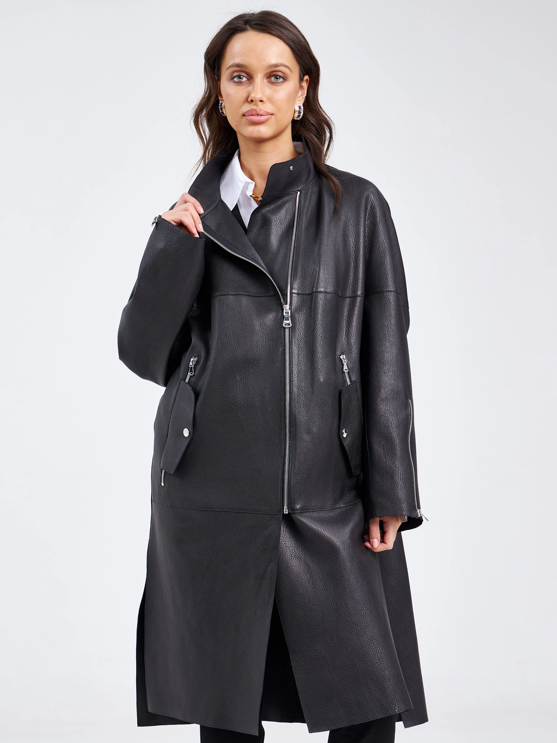 Товар женский кожаный плащ на молнии премиум класса 3041, черный, размер 48, артикул 91890 выполнен из натуральной кожи с застежкой молния. Рассчитан на сезон: весна-лето. Длина изделия 105 см, силуэт свободный.