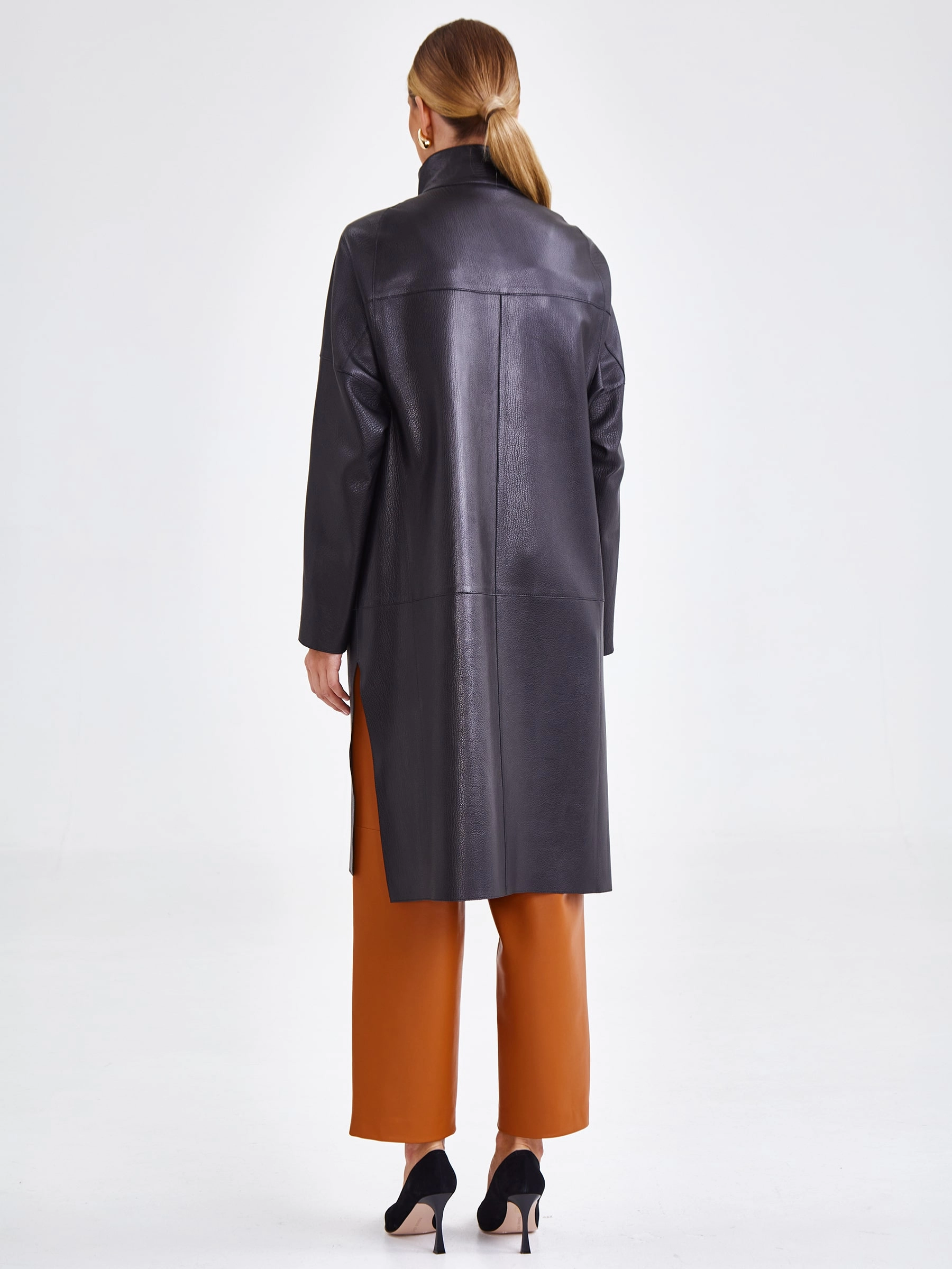 Плащ из нежной кожи премиум класса не оставит равнодушной ни одну модницу. Стиль и комфорт этой модели говорят сами за себя. Свободный крой, воротник стойка, широкий рукав, глубокие разрезы по бокам. Дополнением к модели послужили молнии на рукавах и карманах в тандеме с клапанами на кнопках.