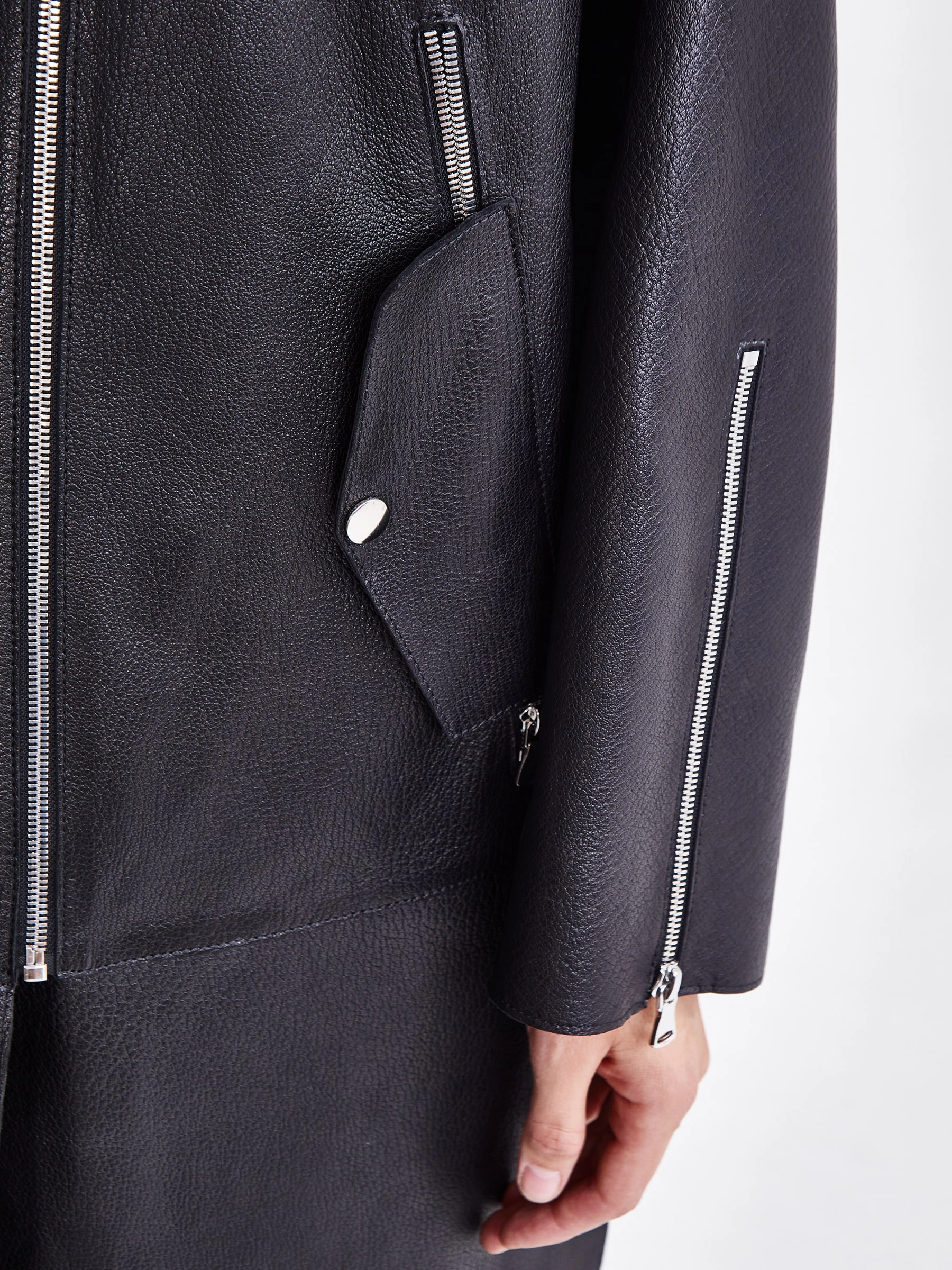Товар женский кожаный плащ на молнии премиум класса 3041, черный, размер 48, артикул 91891 выполнен из натуральной кожи с застежкой молния. Рассчитан на сезон: весна-лето. Длина изделия 105 см, силуэт свободный.