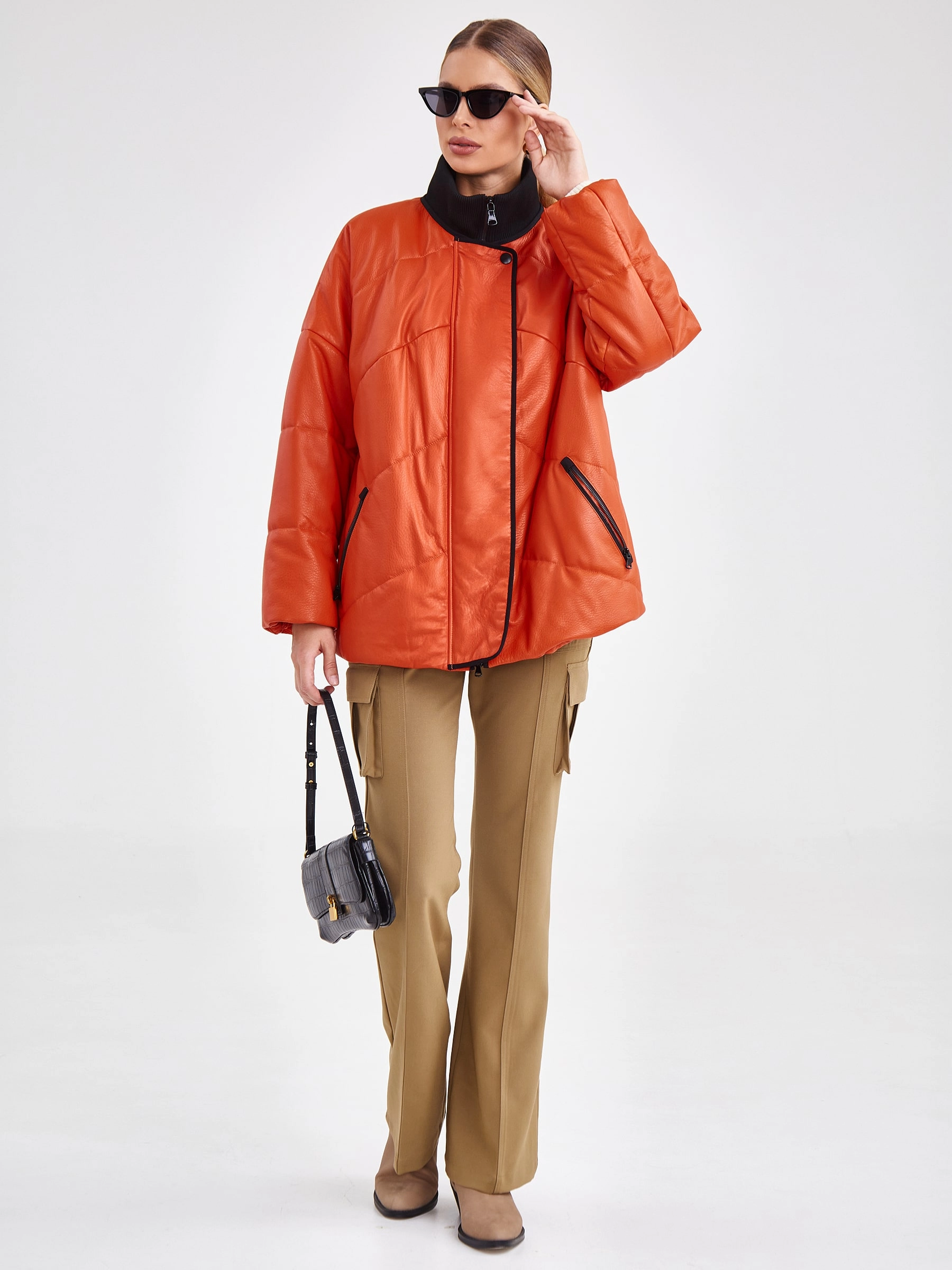 Короткий пуховик свободного кроя длиной до середины бедра (51–74 см) сшит из натуральной кожи насыщенного оранжевого цвета, который заряжает энергией и улучшает настроение. Лаконичный дизайн без декора и застёжка-молния с ветрозащитным клапаном делают модель универсальной, а высокая стойка из плотного трикотажа обеспечивает комфорт и защиту от ветра. Практичность дополняют подкладка из 100% полиэстера и немецкий утеплитель синтепон Freudenberg, гарантирующий отличную теплоизоляцию, воздухопроницаемость и простой уход в демисезонный период. Совет стилиста: Яркий акцент вашего образа — носите эту куртку с нейтральной базой (чёрные, белые, серые или джинсовые вещи), чтобы цвет стал главным героем. Идеально сочетать с облегающими брюками или джинсами и минималистичной обувью, например, кроссовками или ботильонами на плоской подошве.