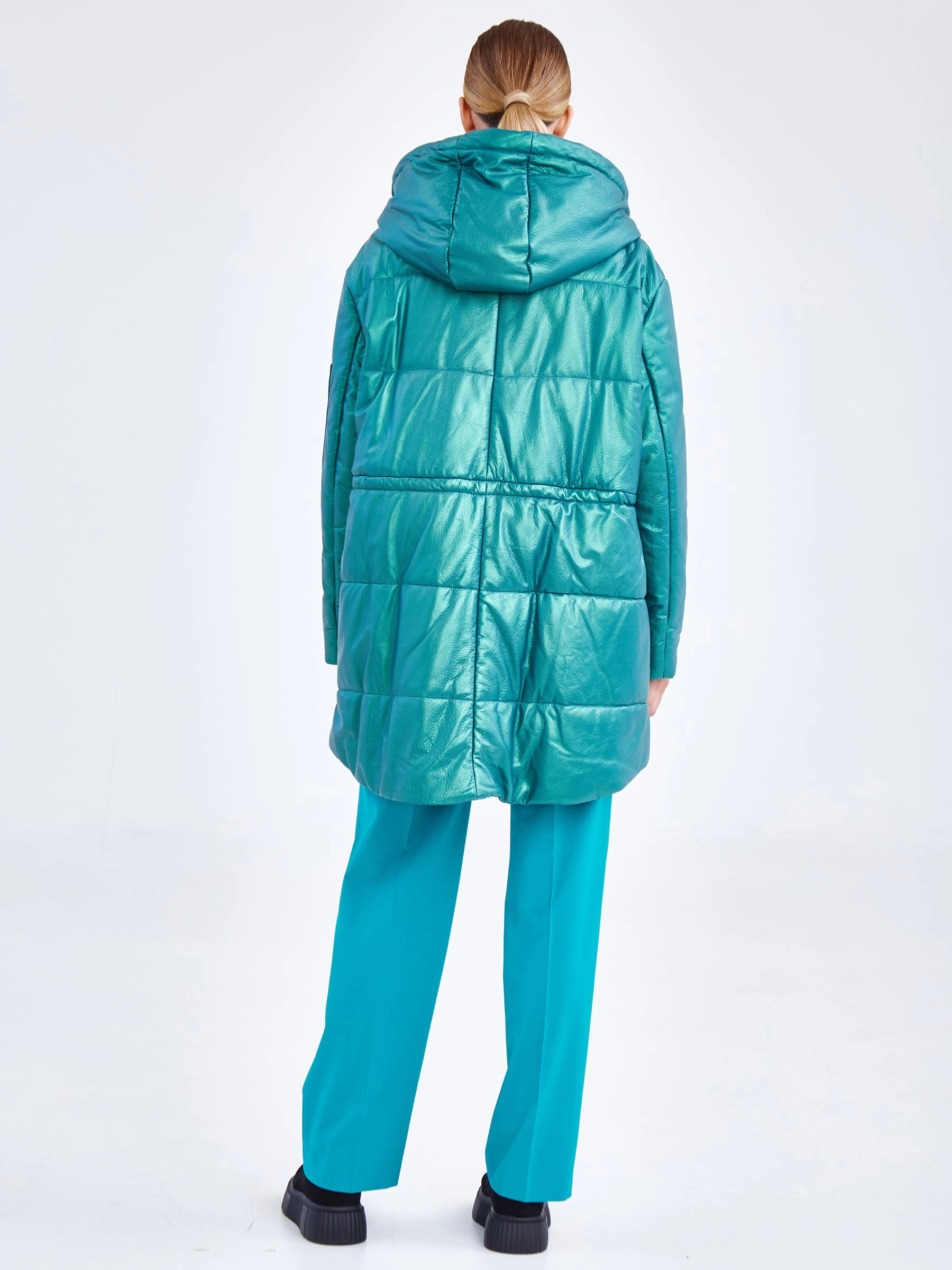 Этот удлинённый кожаный пуховик в спортивном стиле — воплощение современной утилитарной эстетики. Его свободный оверсайз-силуэт (длина 75-90 см) с рукавами спущенного плеча и переливчатый зелено-перламутровый оттенок кожи создают смелый и выразительный городской образ. Функциональность сфокусирована на деталях: внутренний регулируемый пояс-кулиска позволяет мгновенно подчеркнуть талию, преобразуя летящий крой в более приталенный. Модель утеплена высокотехнологичным синтепоном Freudenberg — гарантия эффективного тепла, превосходной паропроницаемости и лёгкого ухода. Несъёмный капюшон, надёжная застёжка-молния и лаконичный дизайн без отделки подчёркивают чистоту линий и качество материала, создавая вещь, которая обеспечивает не только тепло, но и полную свободу движений в демисезон.