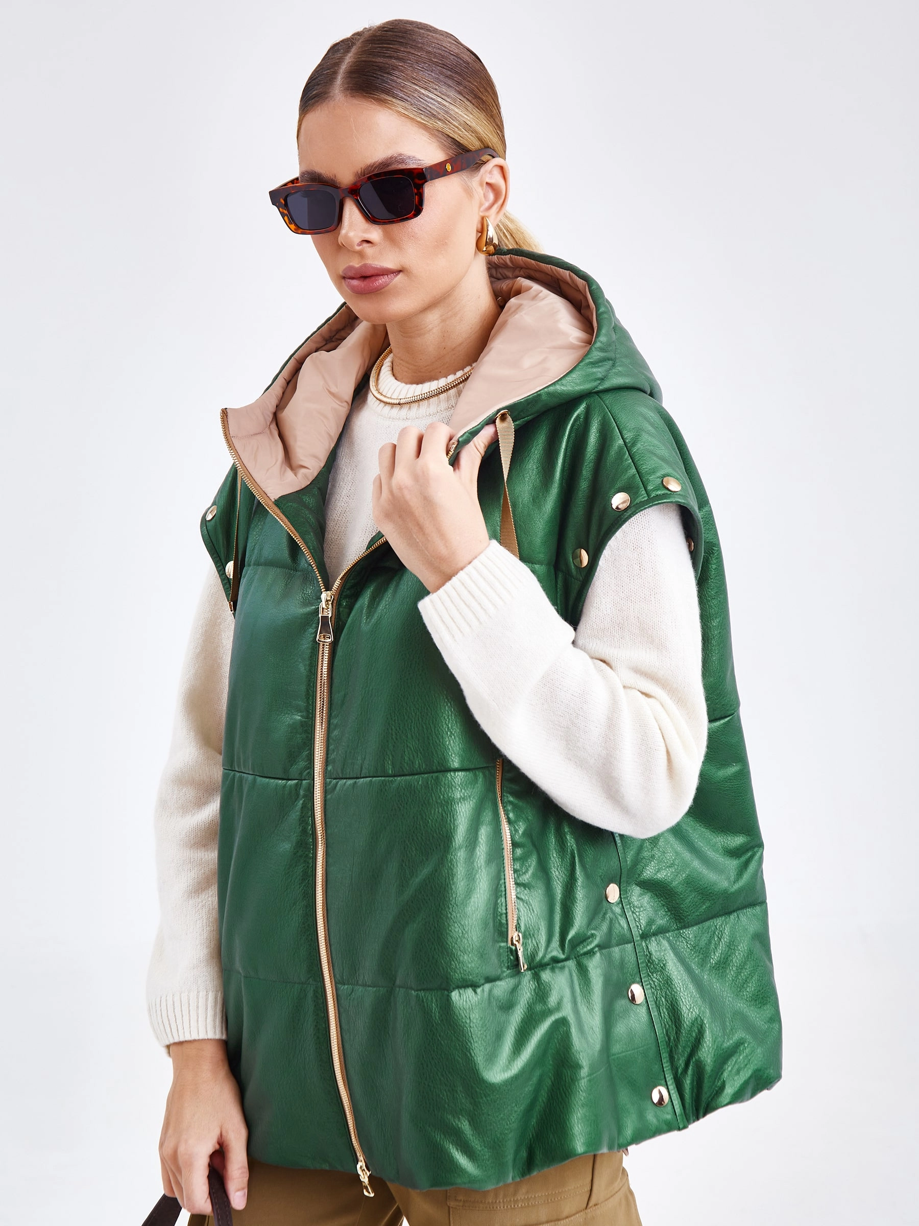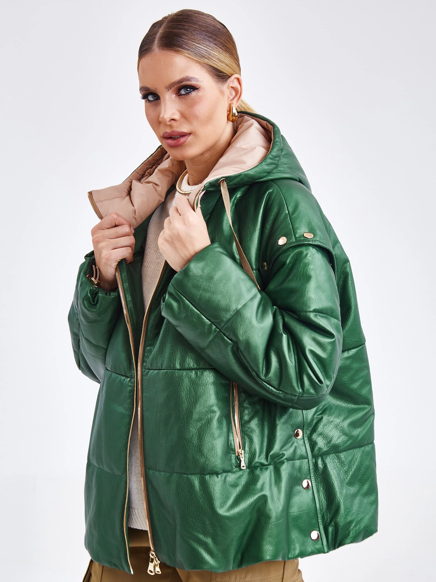 Короткий женский кожаный пуховик оверсайз с капюшоном премиум класса 3023, зеленый, размер 52, артикул 25400