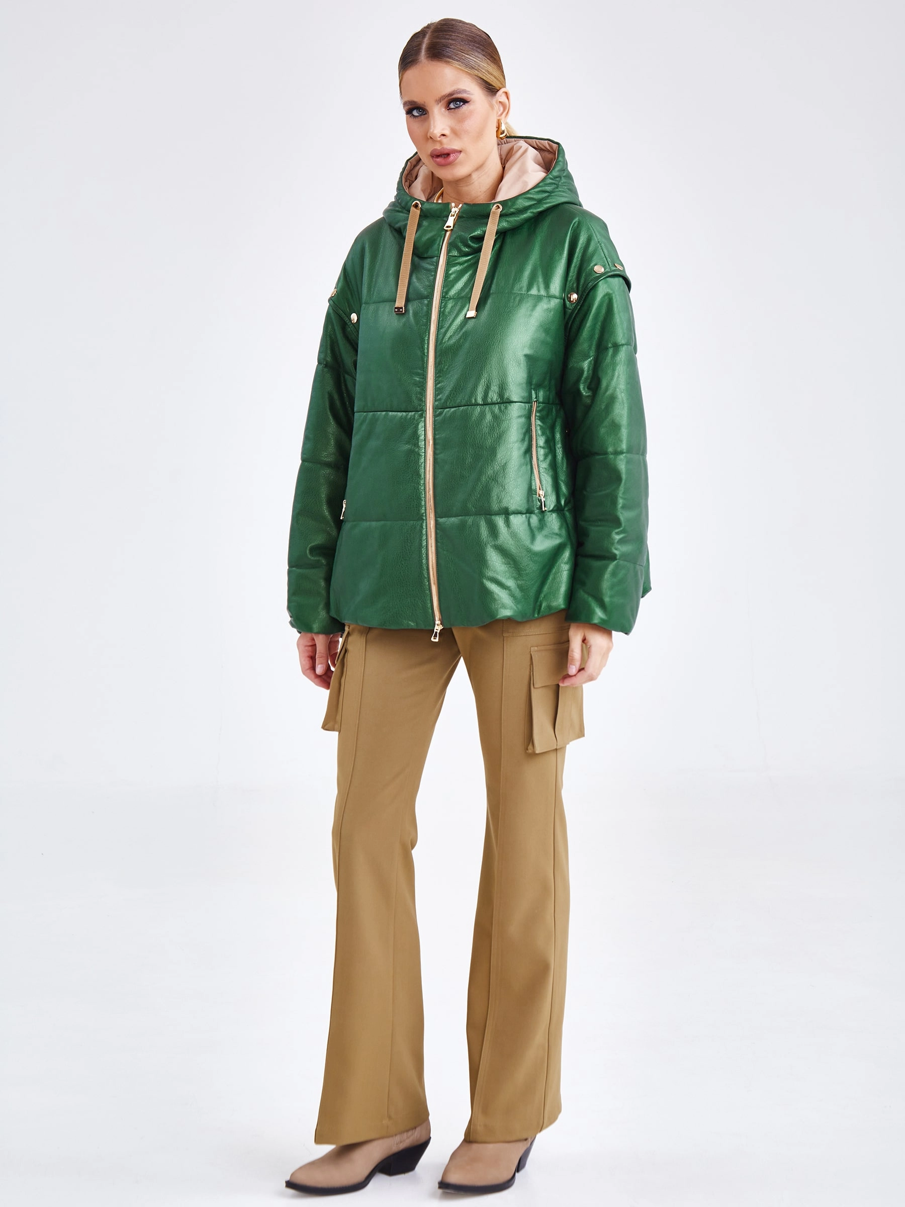 Товар короткий женский кожаный пуховик оверсайз с капюшоном премиум класса 3023, зеленый, размер 52, артикул 25400 выполнен из натуральной кожи с застежкой молния. Рассчитан на сезон: демисезон. Длина изделия 51-74 см, силуэт свободный.