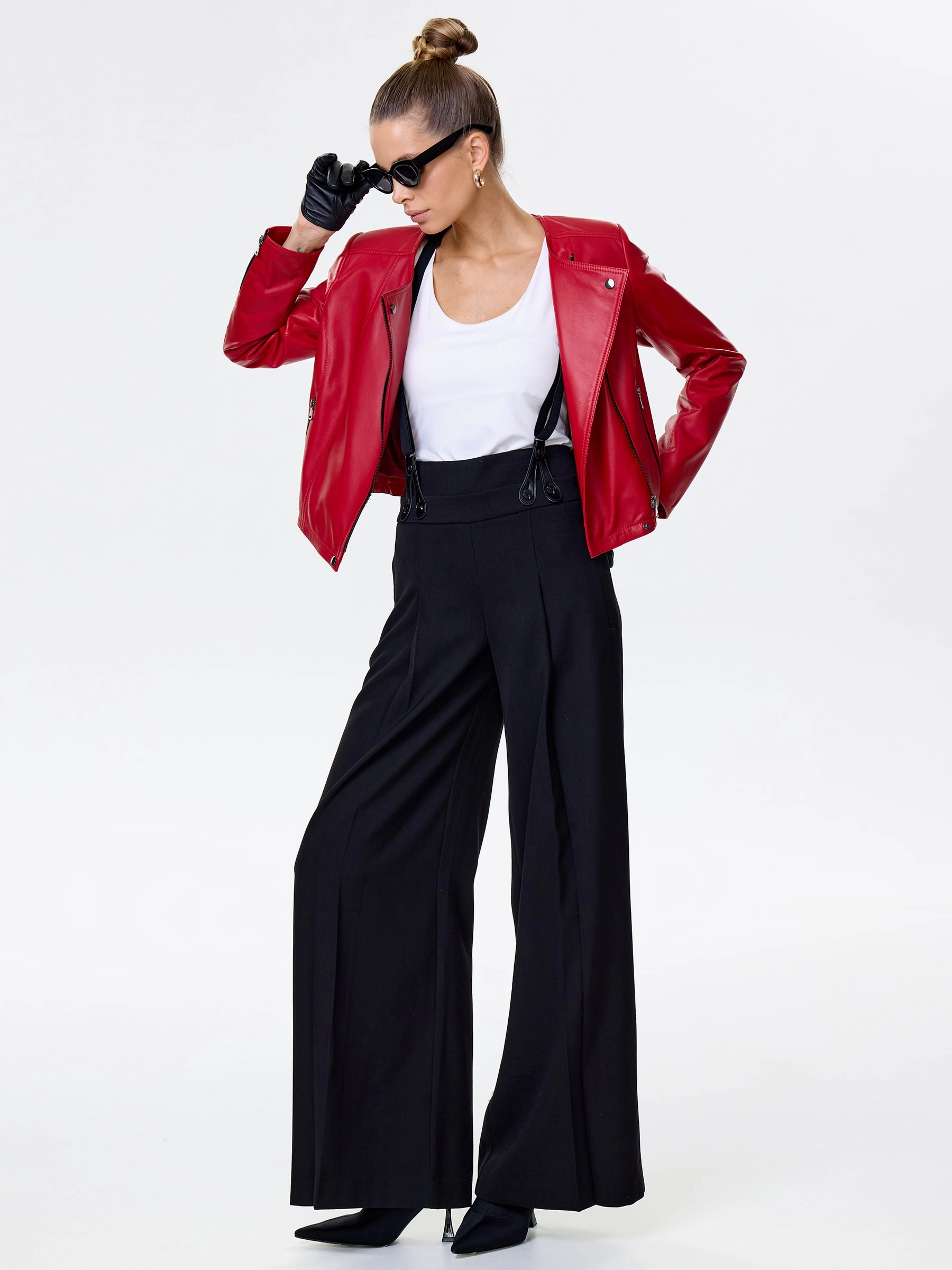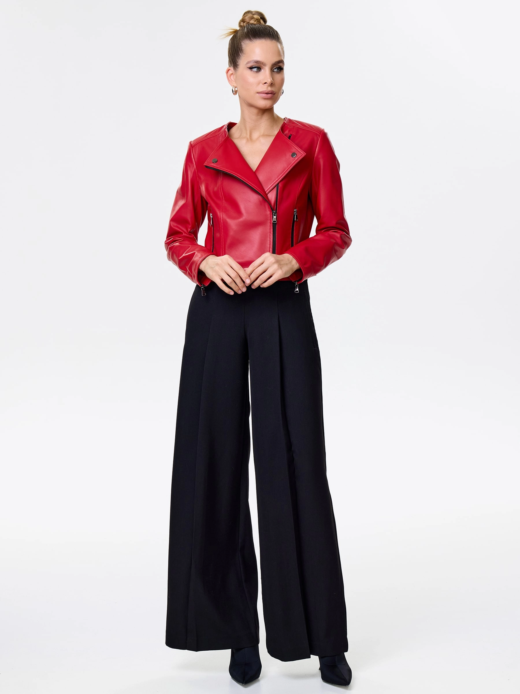 Короткая женская косуха из мягчайшей натуральной кожи насыщенного красного цвета. Полуприлегающий силуэт на молнии без воротника создает дерзкий спортивный шик. Боковые паты идеально регулируют посадку, подчеркивая фигуру, а втачные рукава и два врезных кармана обеспечивают функциональность. Эта премиальная кожаная куртка — мгновенный акцент образа — застегните на молнию, наденьте с черным плиссированным платьем-миди и грубыми ботинками для безупречного рок-н-ролльного лука.