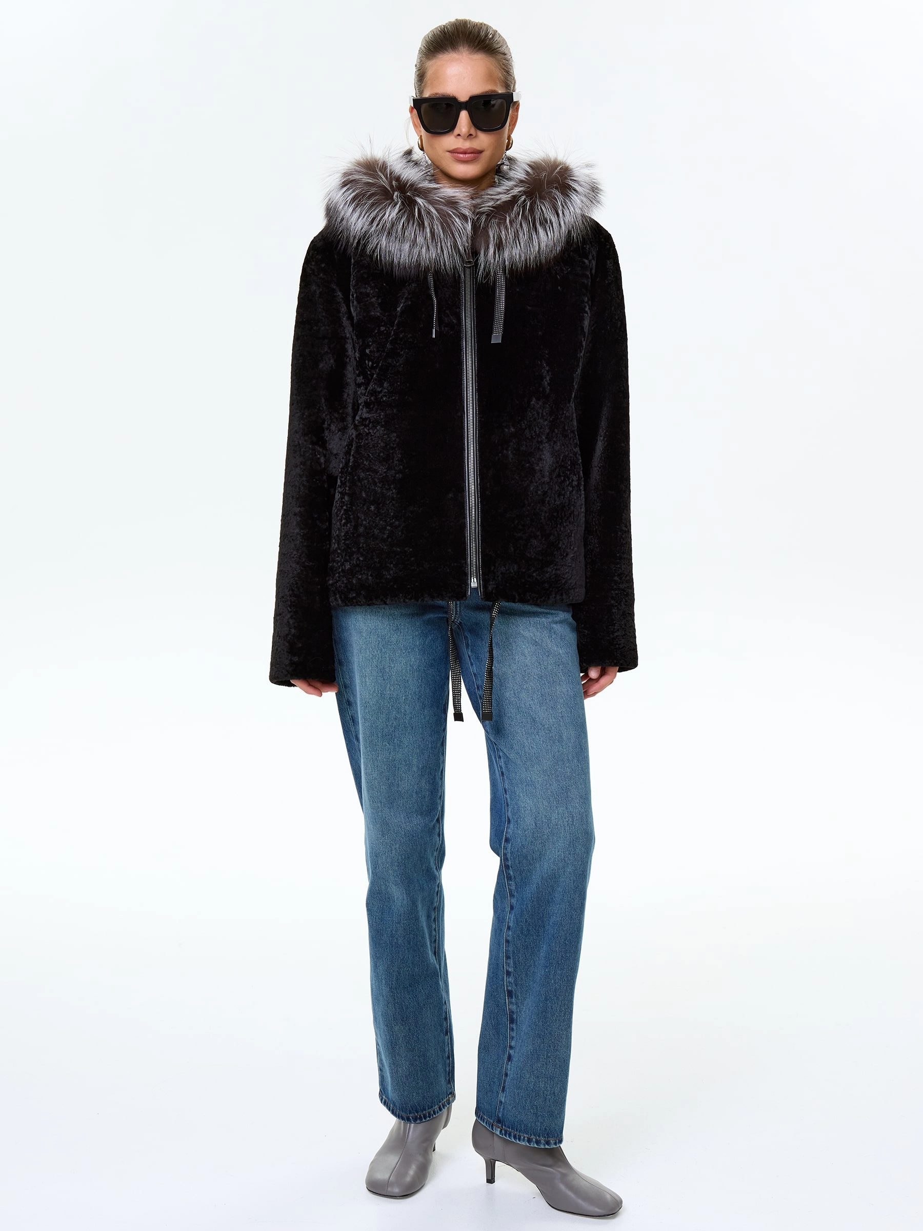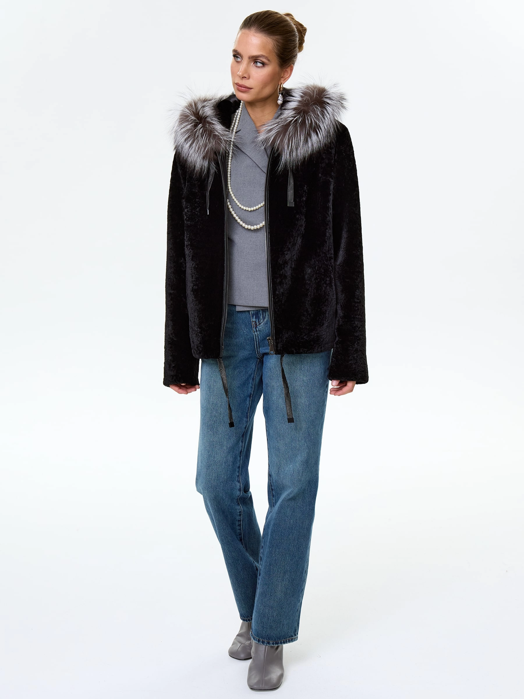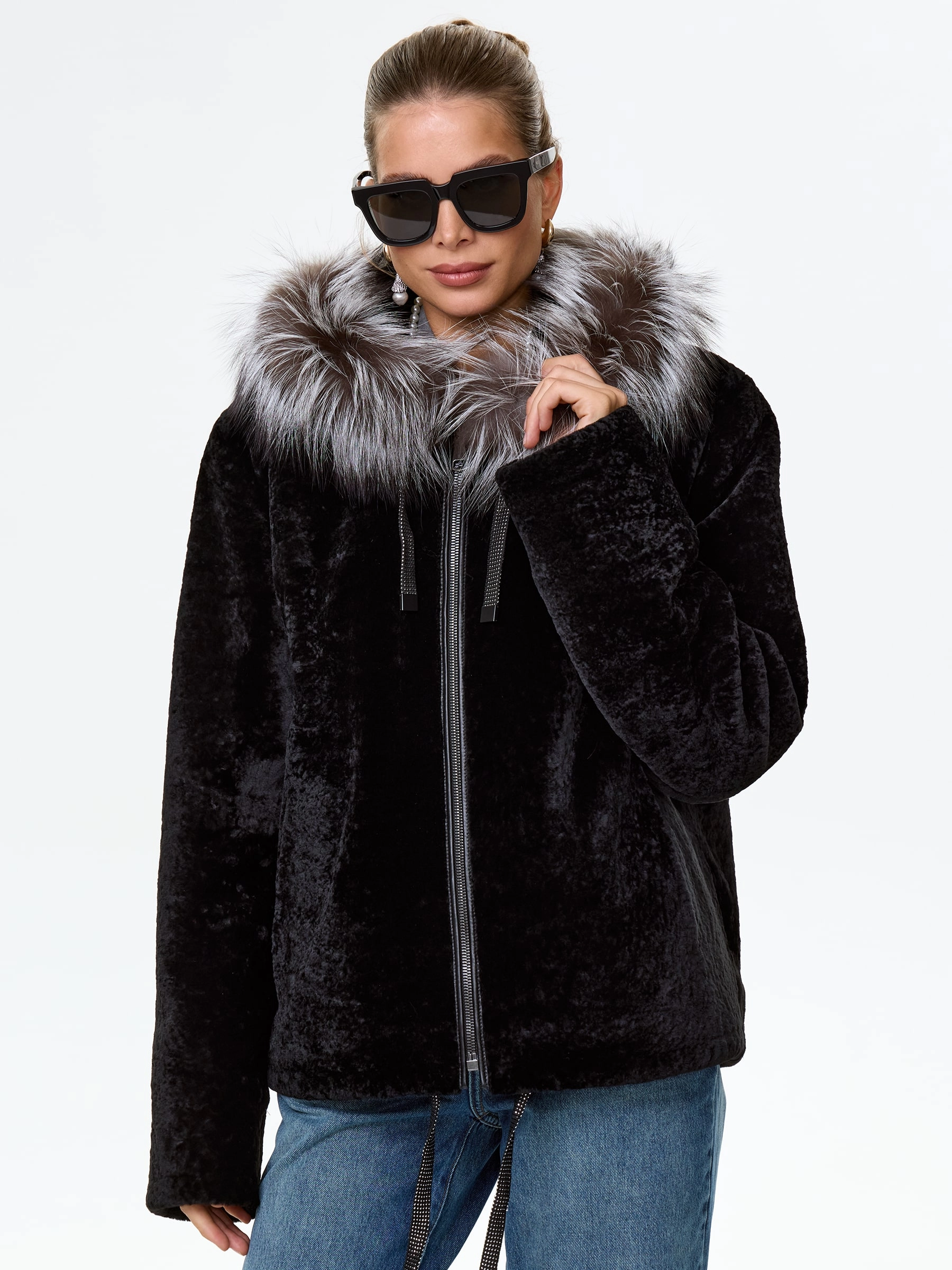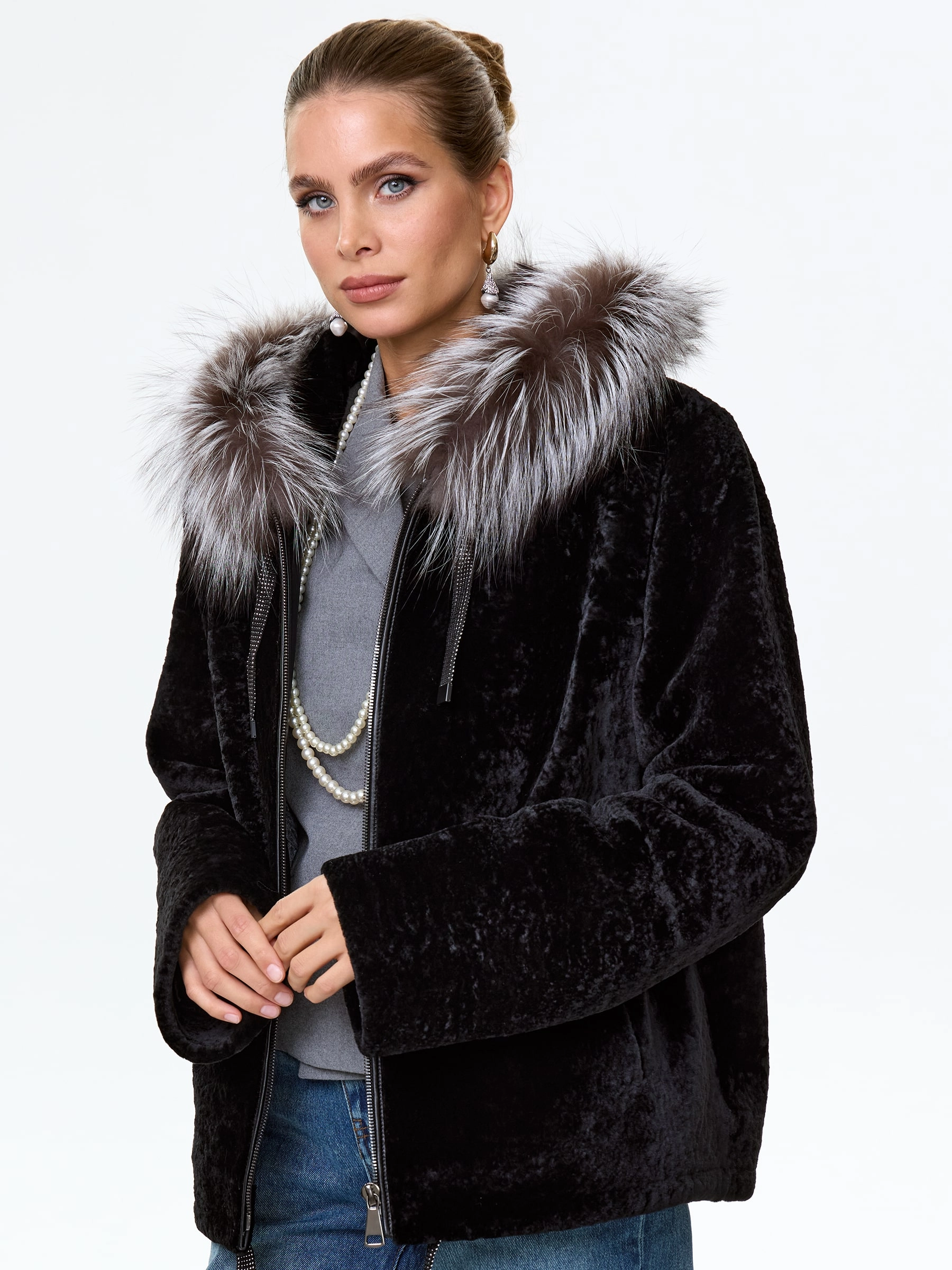 Товар короткая дубленка из астрагана с капюшоном и мехом песца для женщин 50мех, черная, размер 46, артикул 17570 выполнен из астраган с застежкой молния. Рассчитан на сезон: осень-зима. Длина изделия 68 см, силуэт свободный.