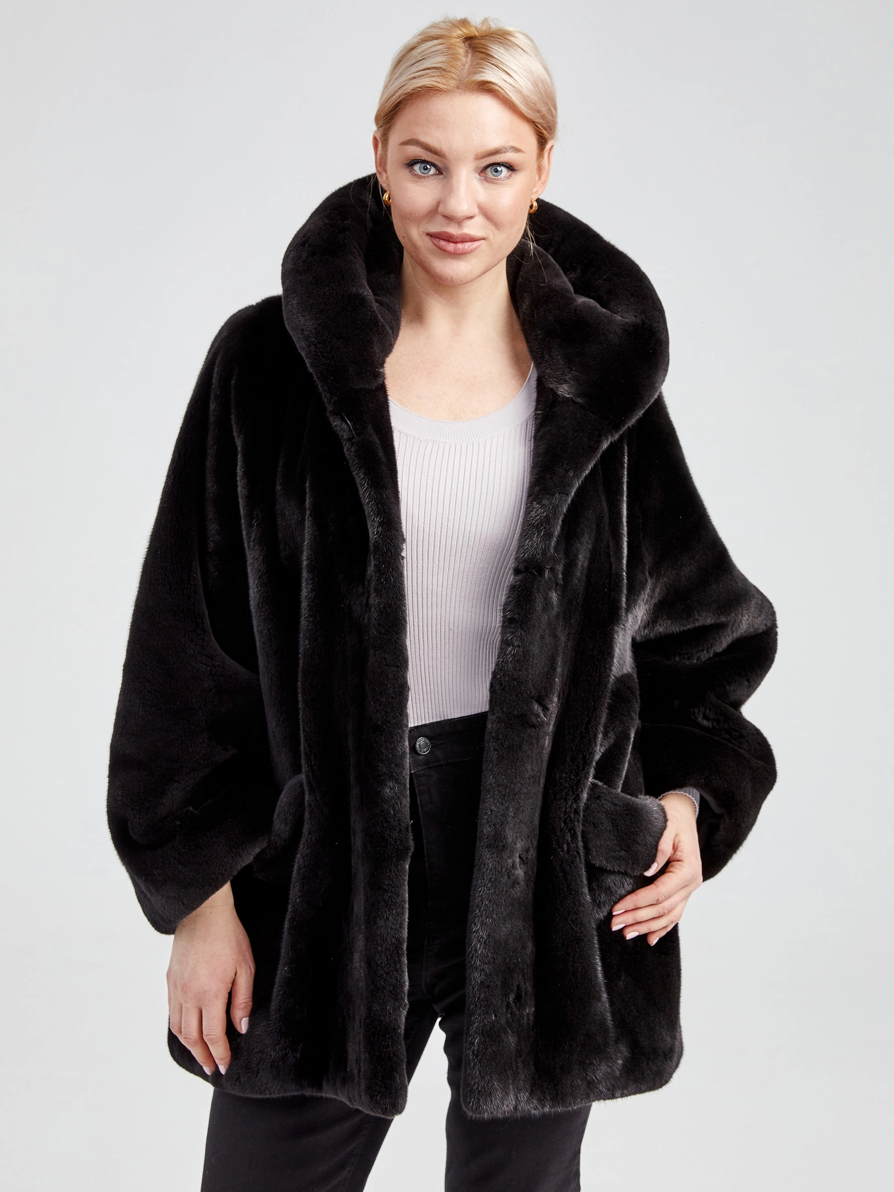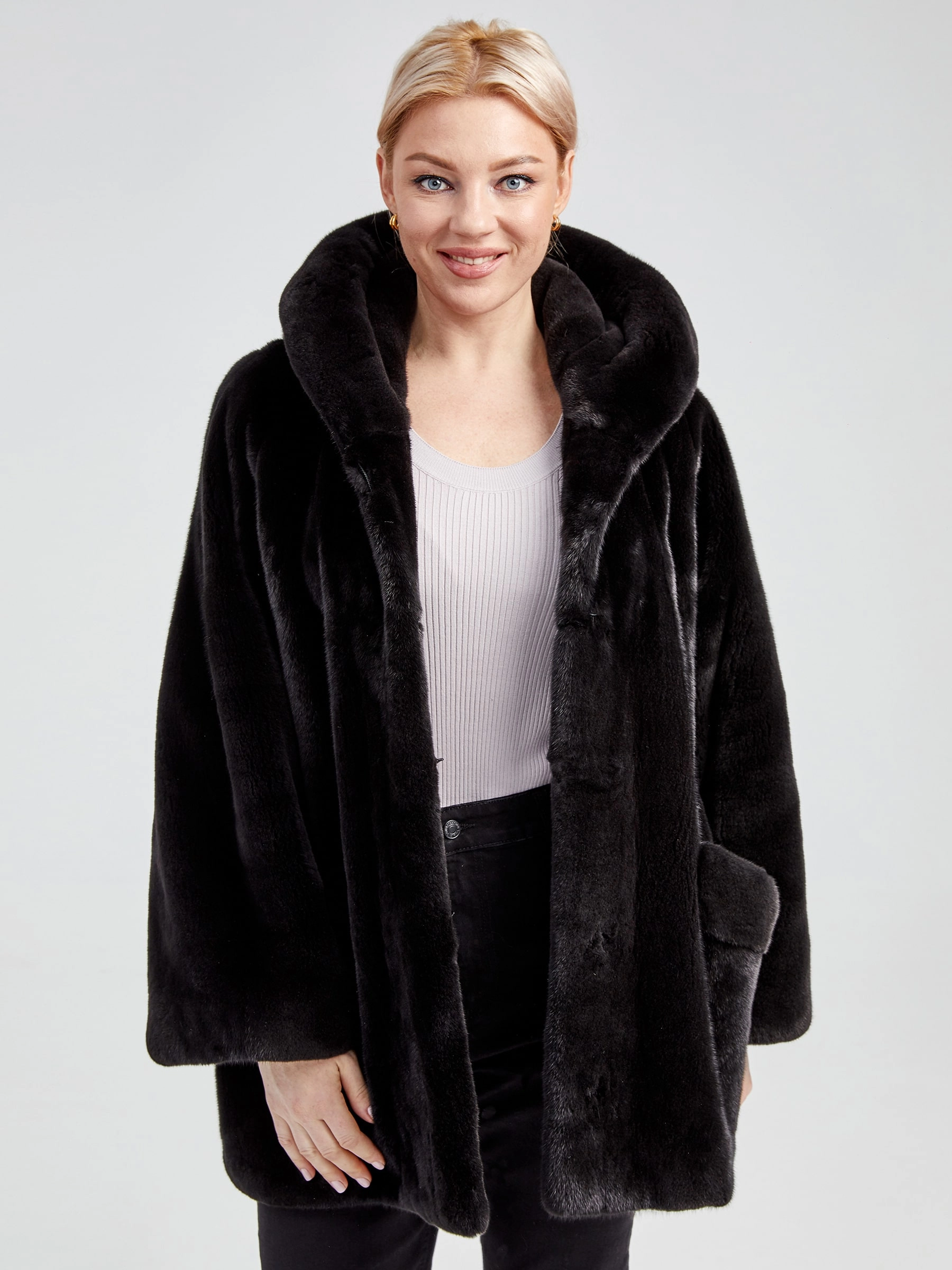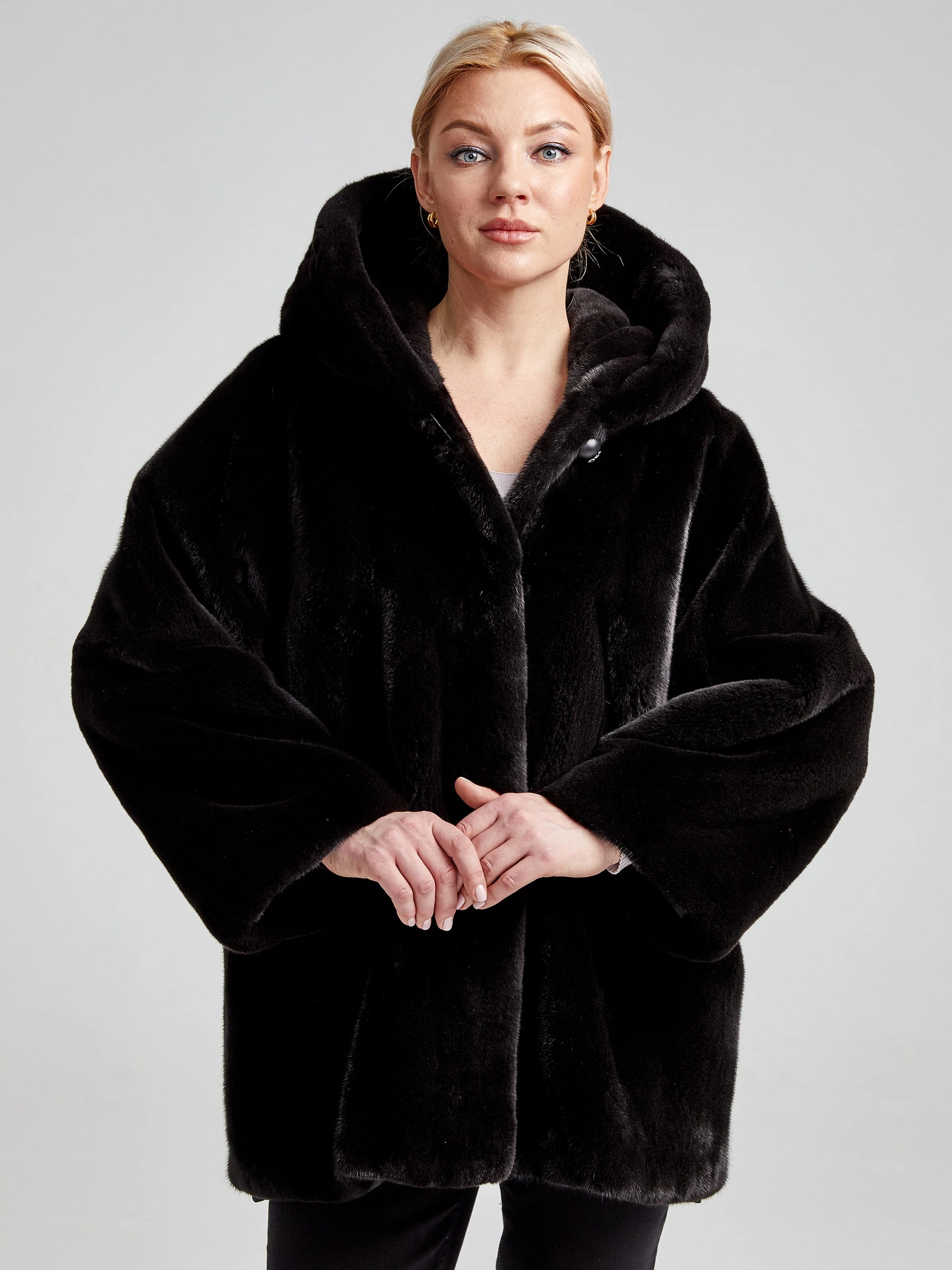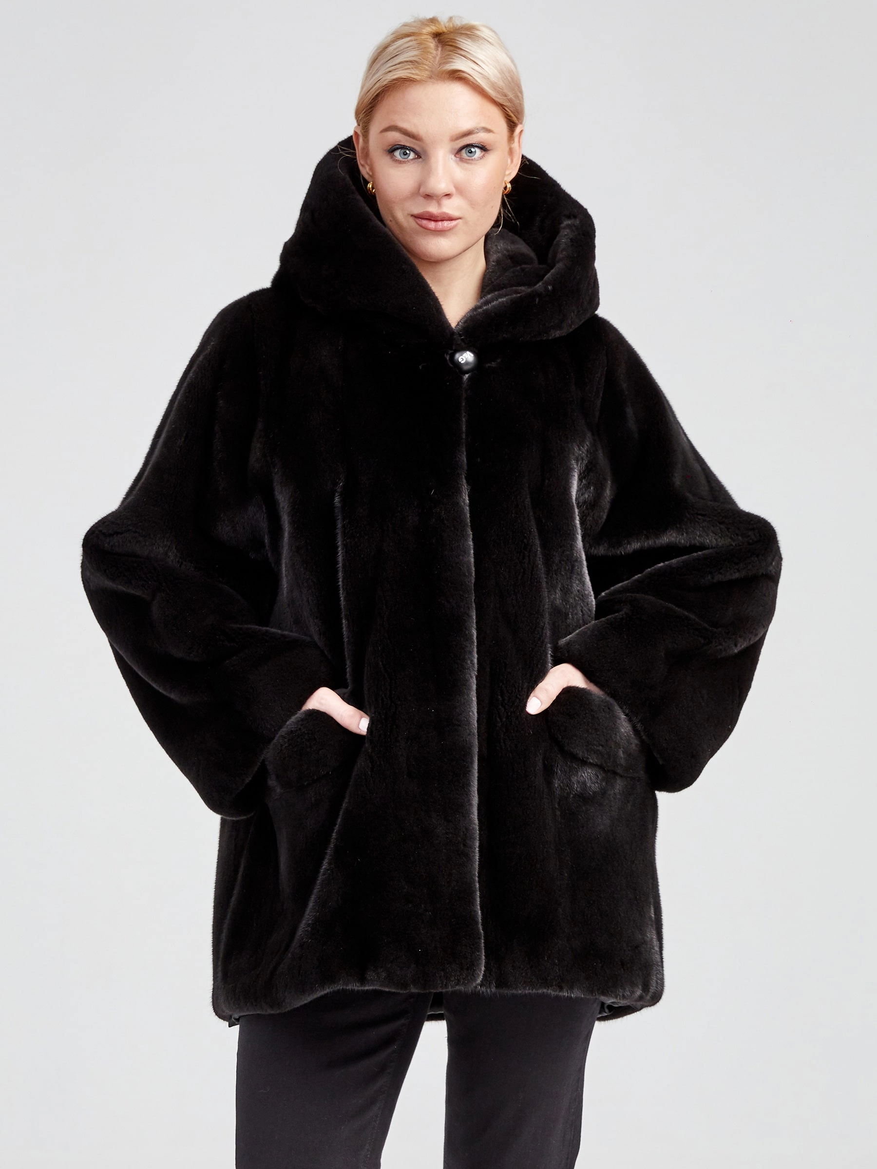 Товар женская норковая шуба автоледи с капюшоном премиум класса 20701(к), черная, размер 44, артикул 33020 выполнен из норка крашенной с застежкой клипсы. Рассчитан на сезон: осень-зима. Длина изделия 75-90 см, силуэт прямой.