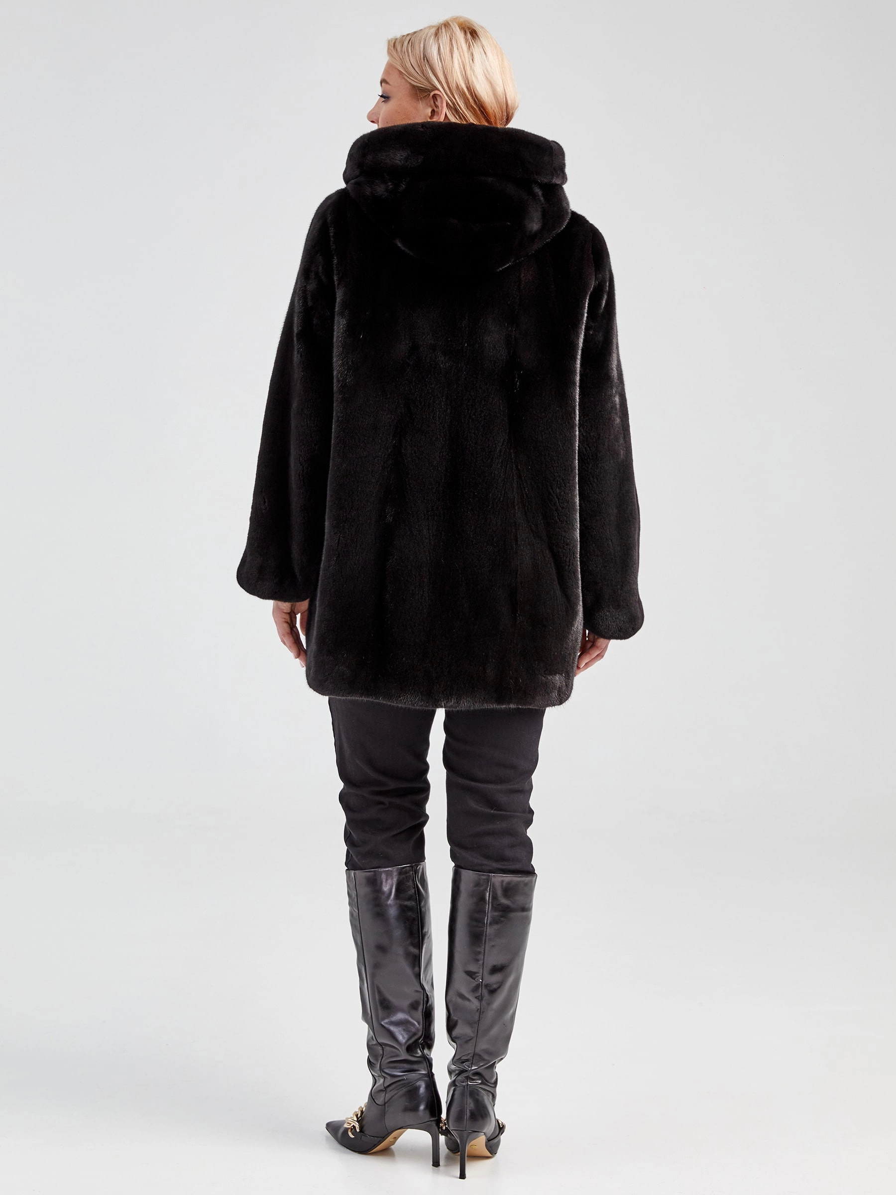 Женская норковая шуба автоледи с капюшоном премиум класса 20701(к), черная, размер 44, артикул 33020