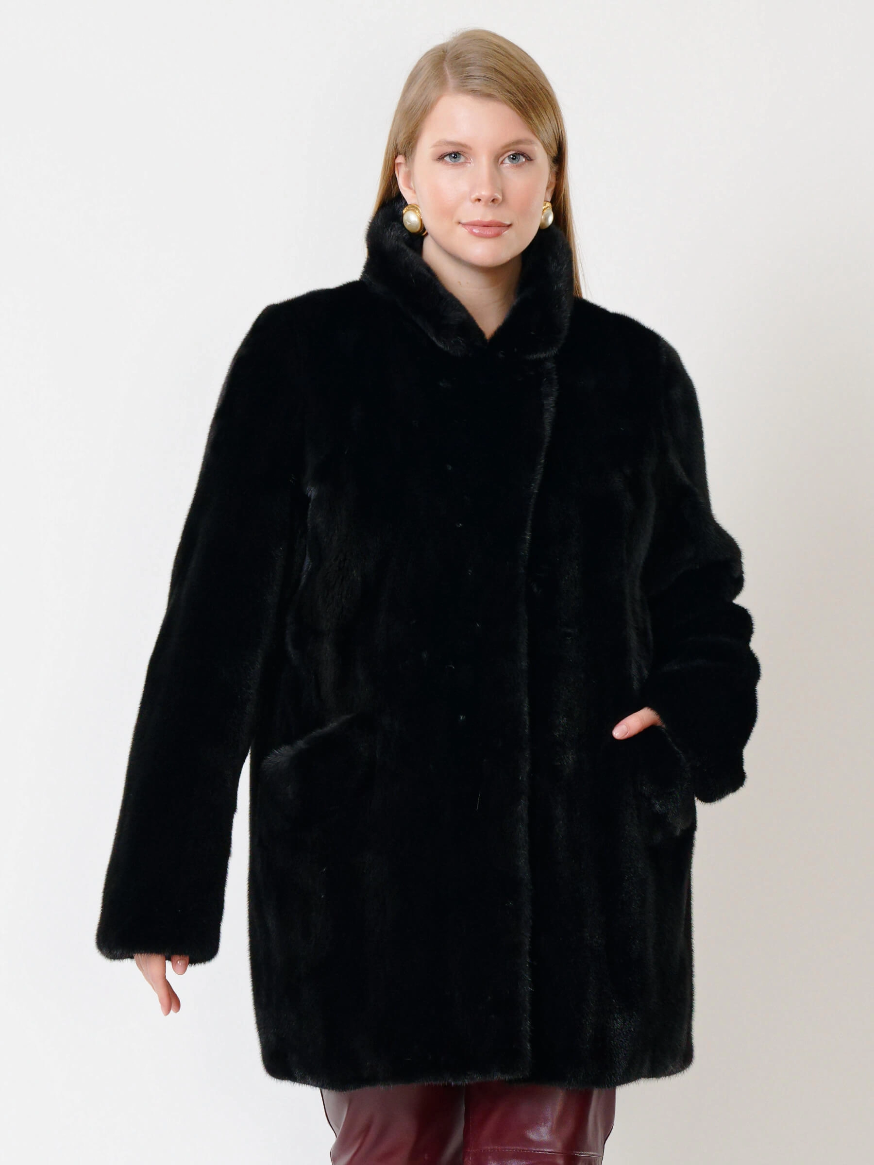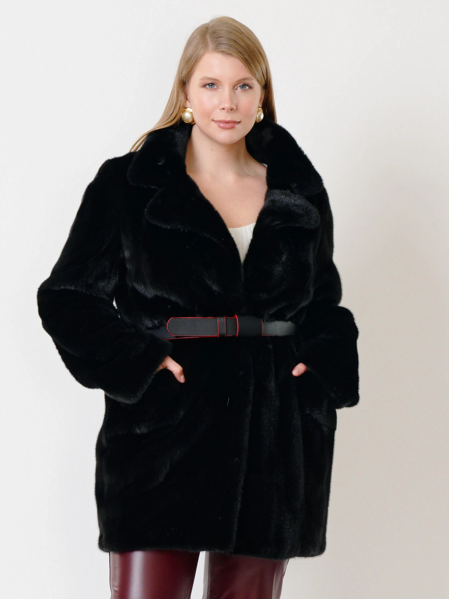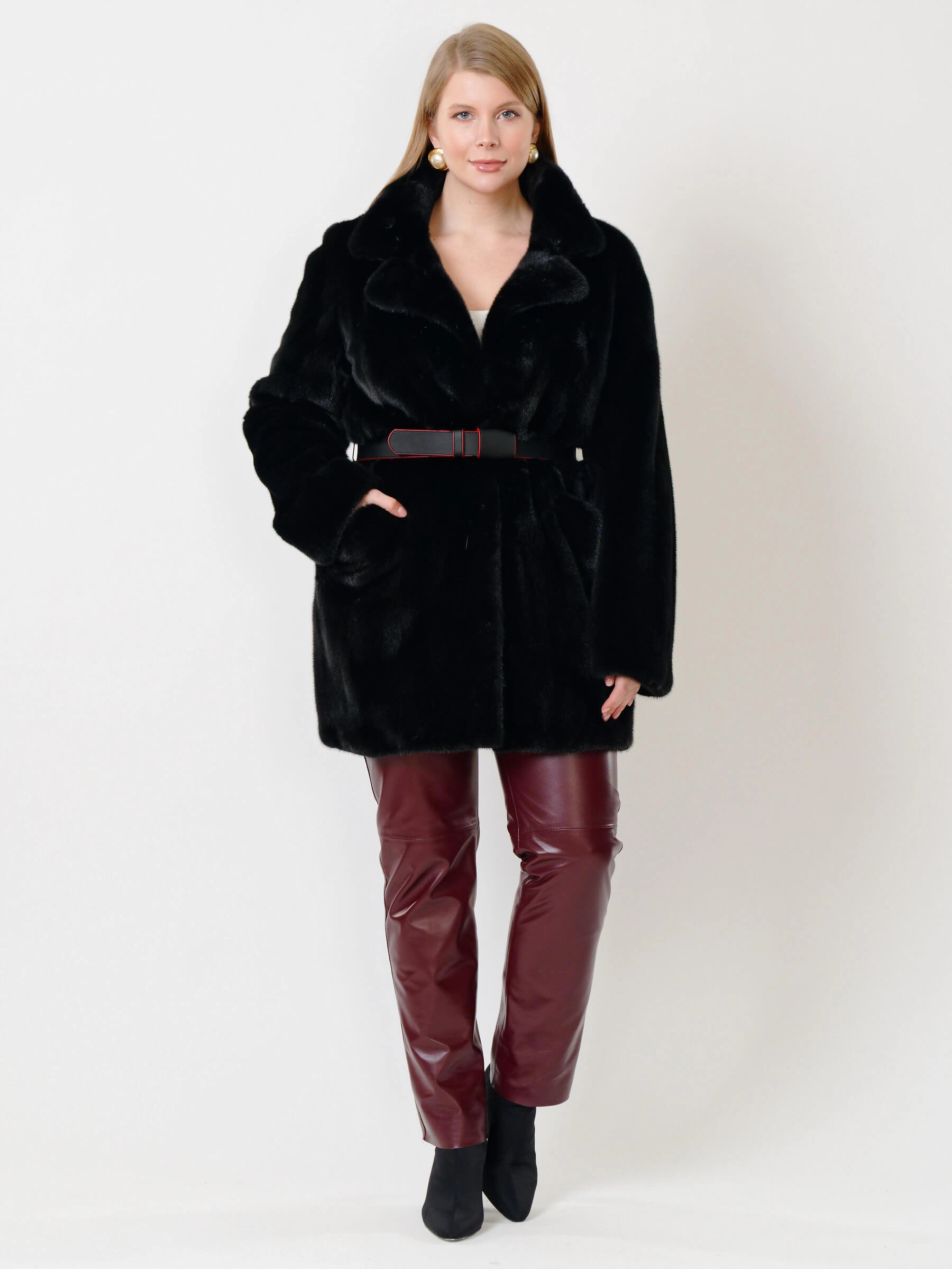 Короткая шуба из меха норки с английским воротником на клипсах имеет строгий прямой силуэт и длину 80 см, модель с втачными рукавами и боковыми карманами дополнена кожаным поясом, который помогает создать акцент на талии. Совет стилиста: сочетайте ее с узкими джинсами, кашемировым свитером и сапогами-челси для повседневного образа или с классическими брюками и шелковой блузкой для элегантного стиля.