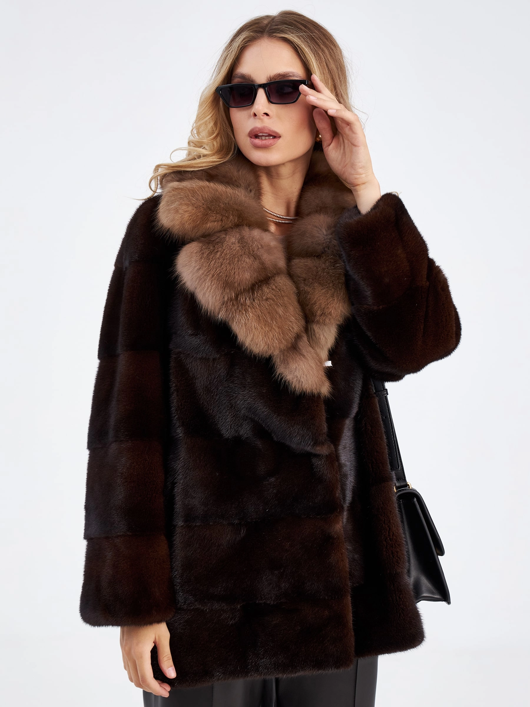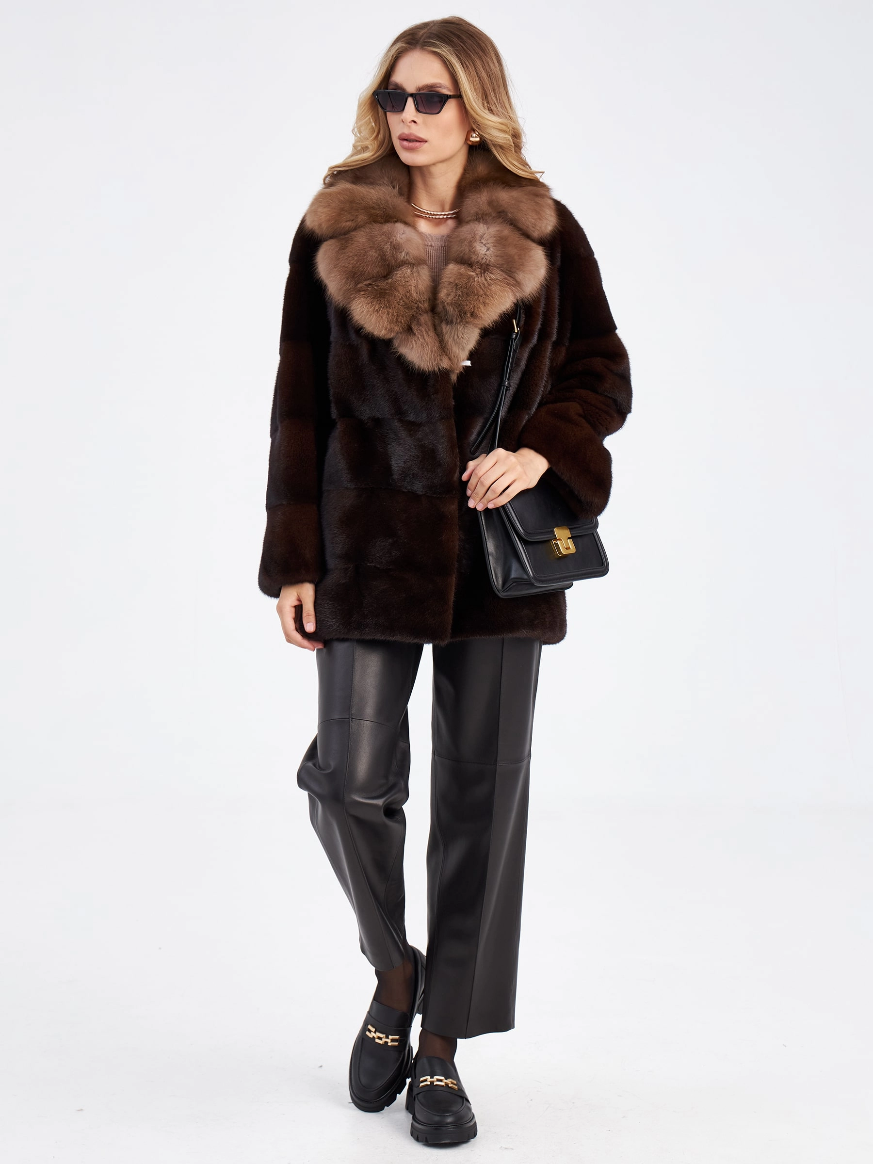 Женская куртка автоледи из меха норки с воротником из меха куницы 2а-к(авк), темно-коричневая, размер 48, артикул 33830