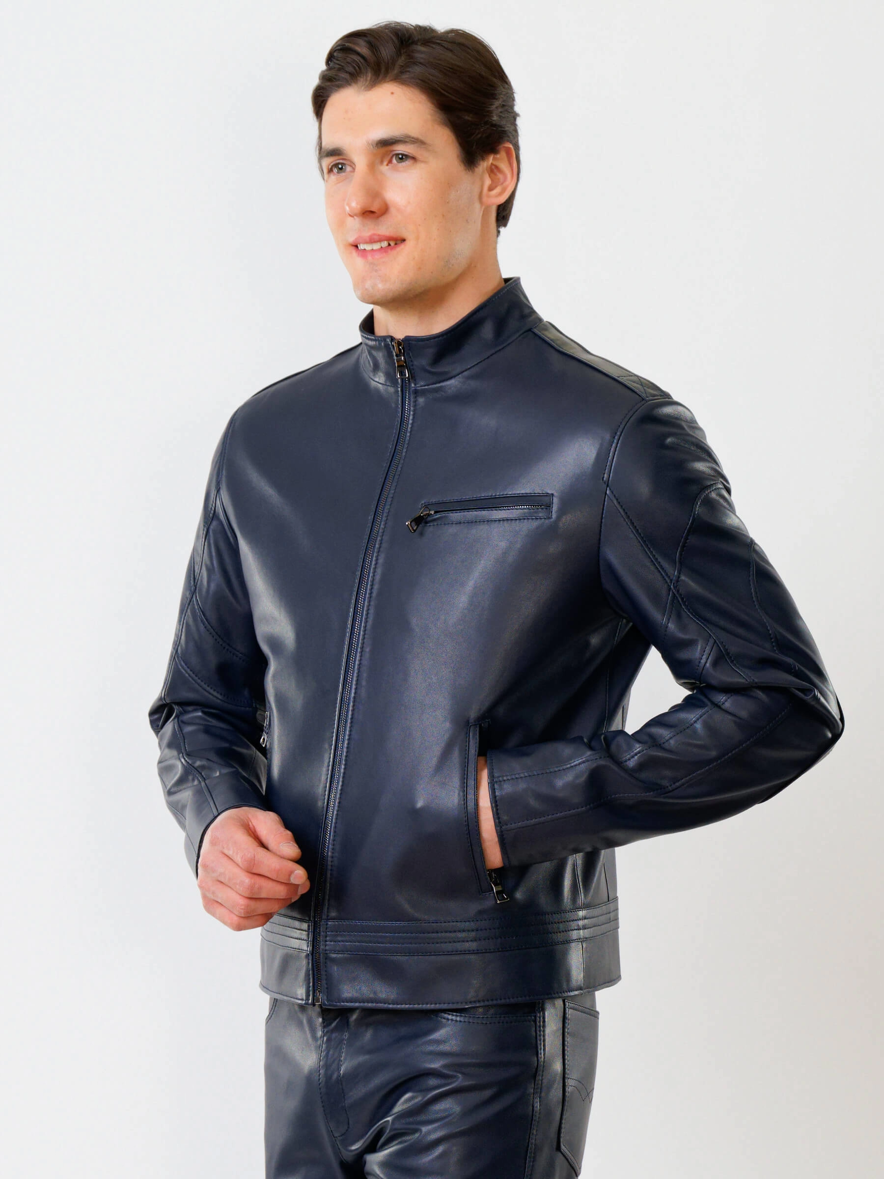 Для пошива куртки полуприлегающего силуэта выбрали мягкую кожу премиального качества. Модель из такого материала комфортно садится по фигуре и не ограничивает движения. Воротник-стойка. Боковые и нагрудные карманы как и само изделие застегиваются молниями.