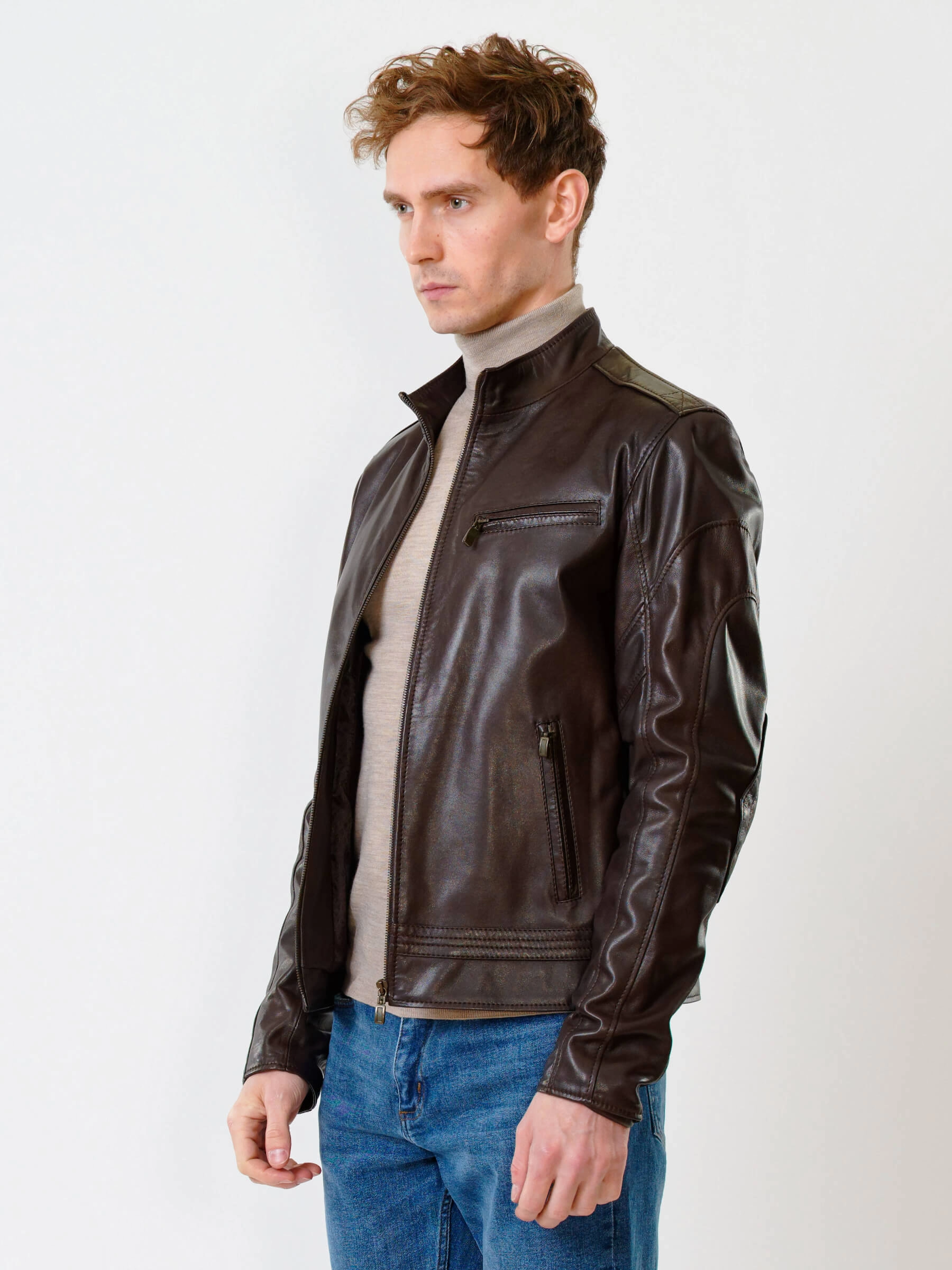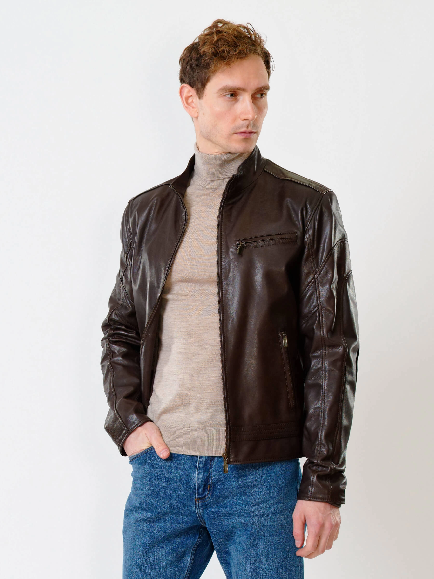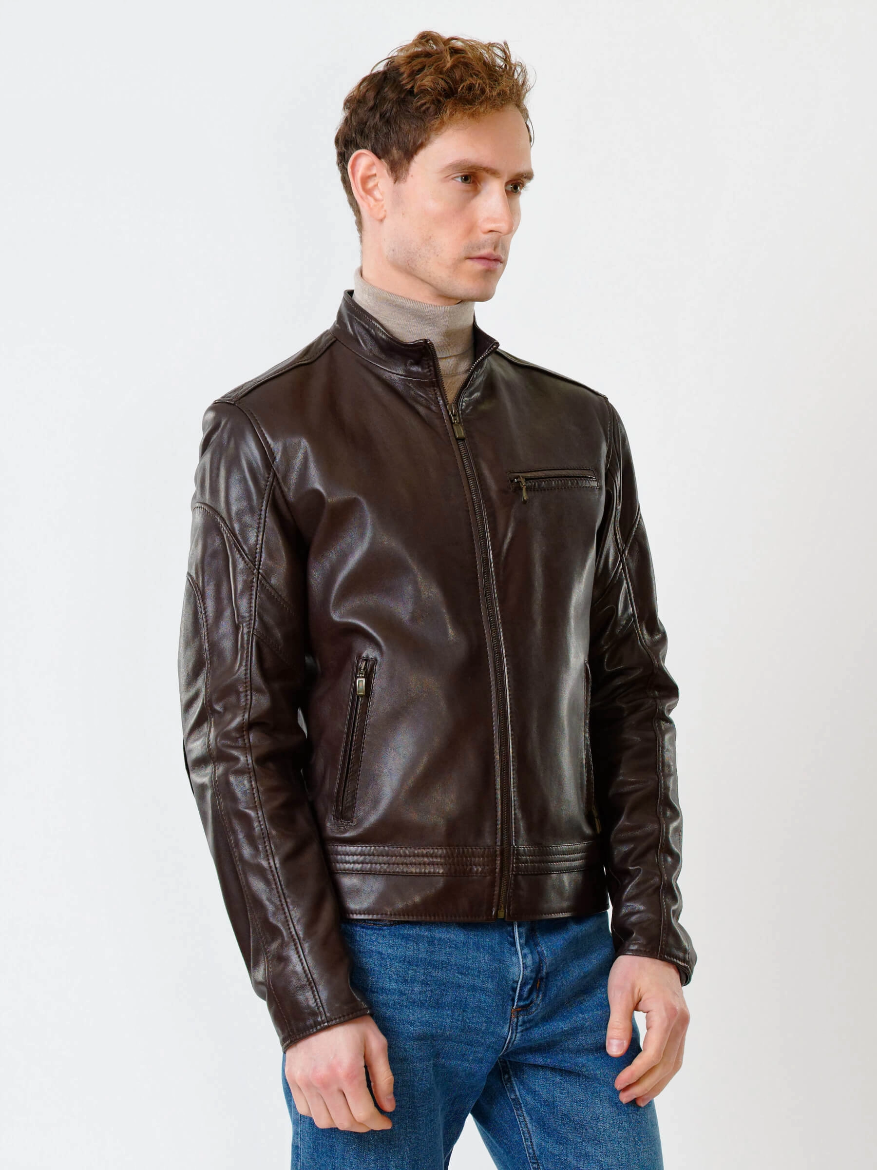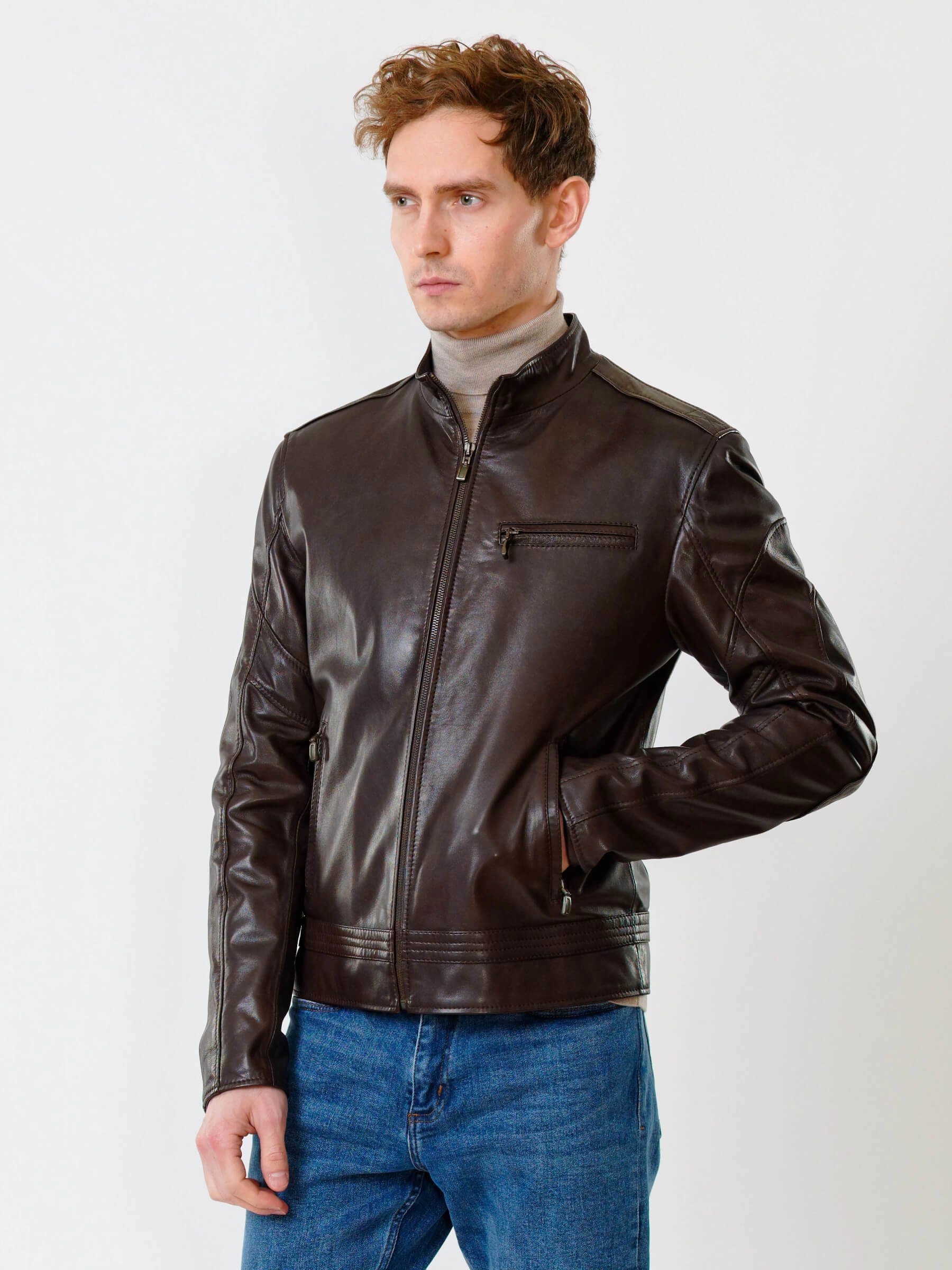 Для пошива куртки полуприлегающего силуэта выбрали мягкую кожу премиального качества. Модель из такого материала комфортно садится по фигуре и не ограничивает движения. Воротник-стойка. Боковые и нагрудные карманы как и само изделие застегиваются молниями.