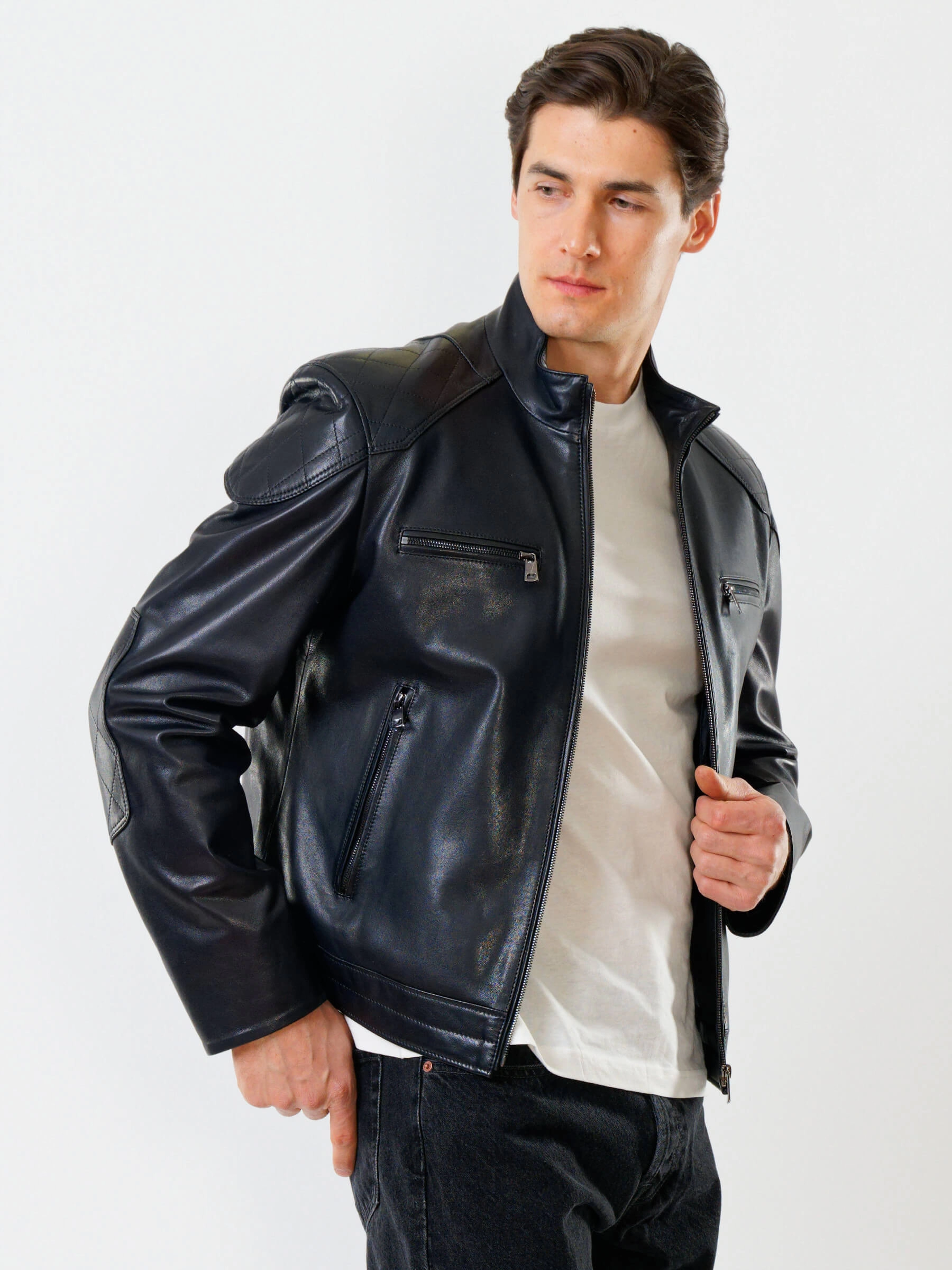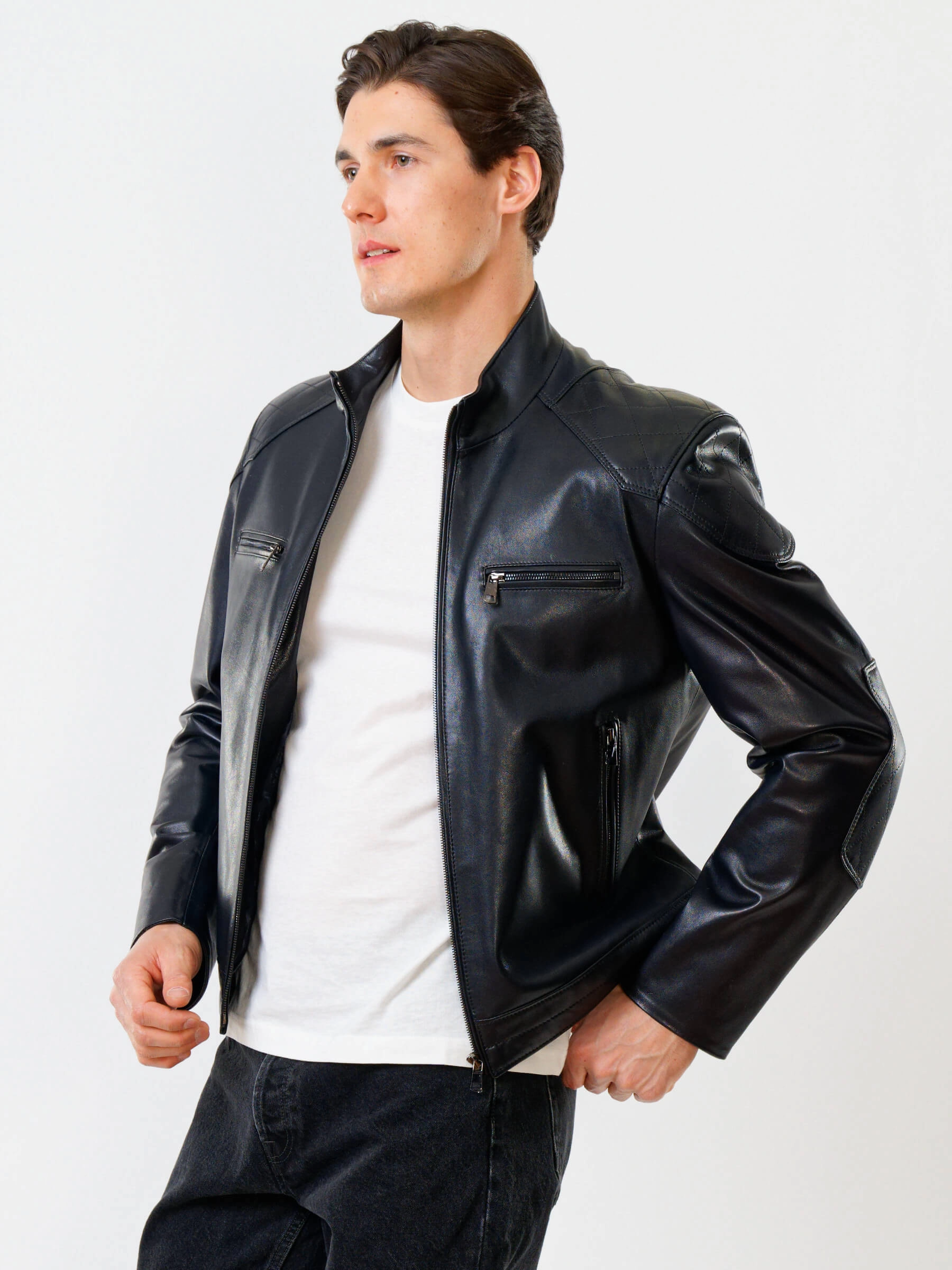 Короткую куртку полуприлегающего силуэта выполнили из гладкой кожи премиального качества. Невысокий воротник-стойка. Локоть и плечо втачного рукава выделили стеганным ромбовидным узором. Нагрудные и боковые карманы, как и само изделие застегиваются крупными молниями. Безупречная работа наших портных. Идеальная посадка по фигуре и прекрасная свобода движений.